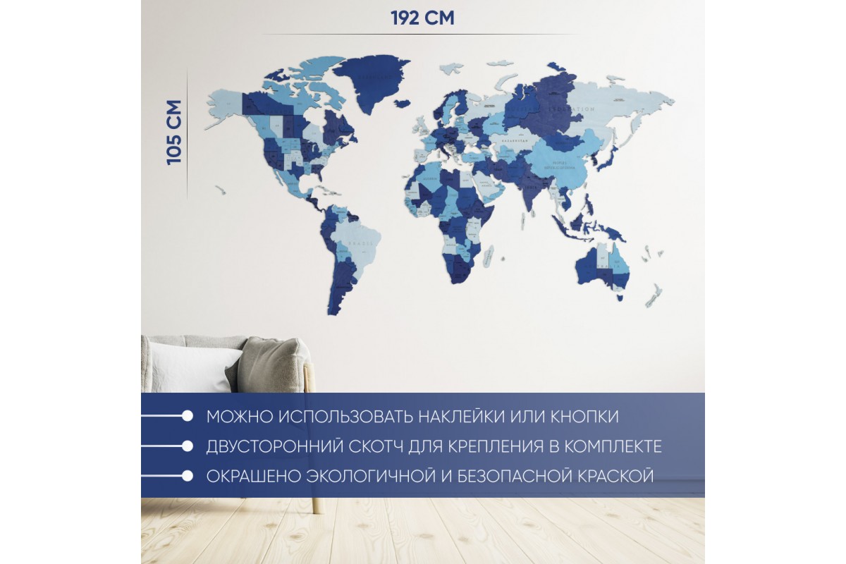 Это красивая карта мира идеально подойдет для любого дома или офиса. Размещая дерево на стену вы добавляете уют в комнату. Карта мира настенная имеет три уровня (слоя), что ее настоящим украшением интерьера, выглядит как объемная карта. Крепится карта мира на стену с помощью двустороннего скотча, который идет в комплекте. На карте мира выделены границы всех стран, например Россия. Карта деревянная окрашена в экологичную и безопасную краску. Сборка производится с помощью клея. Наша карта не является скретч картой, но вы можете использовать наклейки или кнопки, чтобы отметить, какие страны уже посетили.
