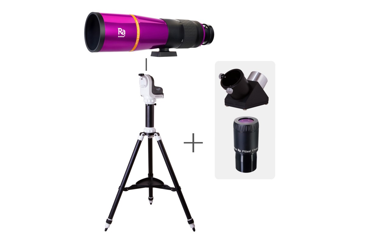 В комплекте с телескопом идут два важных дополнения – диагональное зеркало и окуляр. Зеркало Sky-Watcher 90° имеет посадочный диаметр 1,25" и делает возможными наблюдения за наземными объектами, поворачивая изображение в «прямое» положение. Окуляр Levenhuk Ra Plössl 17 мм обеспечивает поле зрения 55°. Также в комплект входит алюминиевый кейс для оптической трубы, защитные крышки и салфетка для ухода за оптикой.