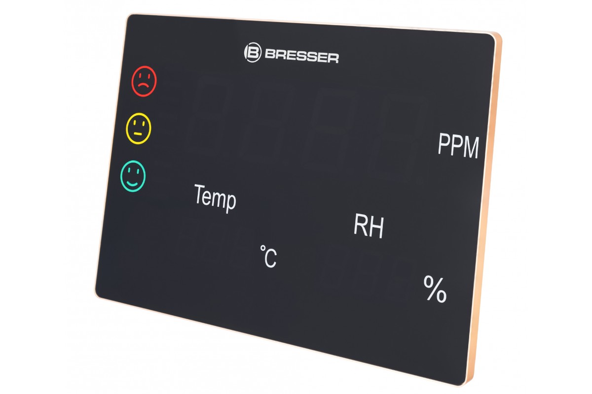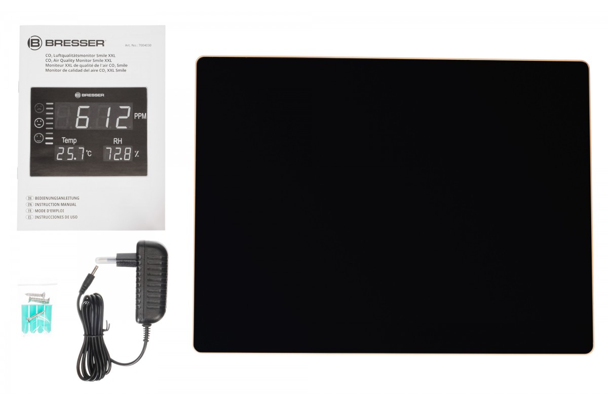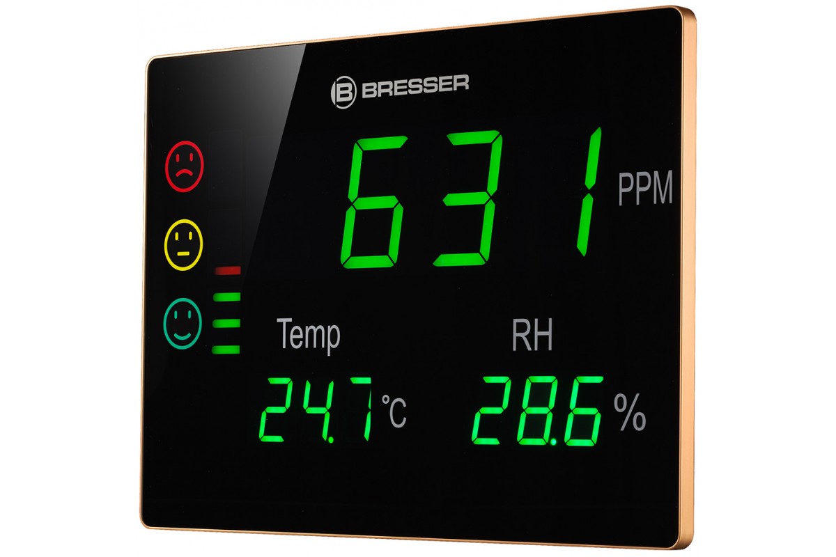 Гигрометр Bresser Air Quality Smile XXL сразу привлекает внимание своим современным и стильным дизайном. Корпус очень тонкий, высококонтрастный цветной экран не имеет рамок, индикация яркая и хорошо читаемая с большой дистанции. К тому же прибор определяет не только влажность воздуха, но также температуру и уровень углекислого газа в помещении. Также он предупреждает о предельных значениях – слишком высоких показателях, некомфортных для человека.