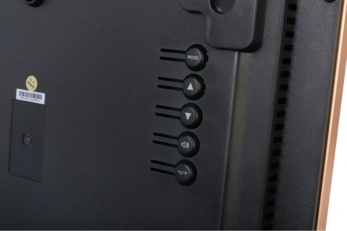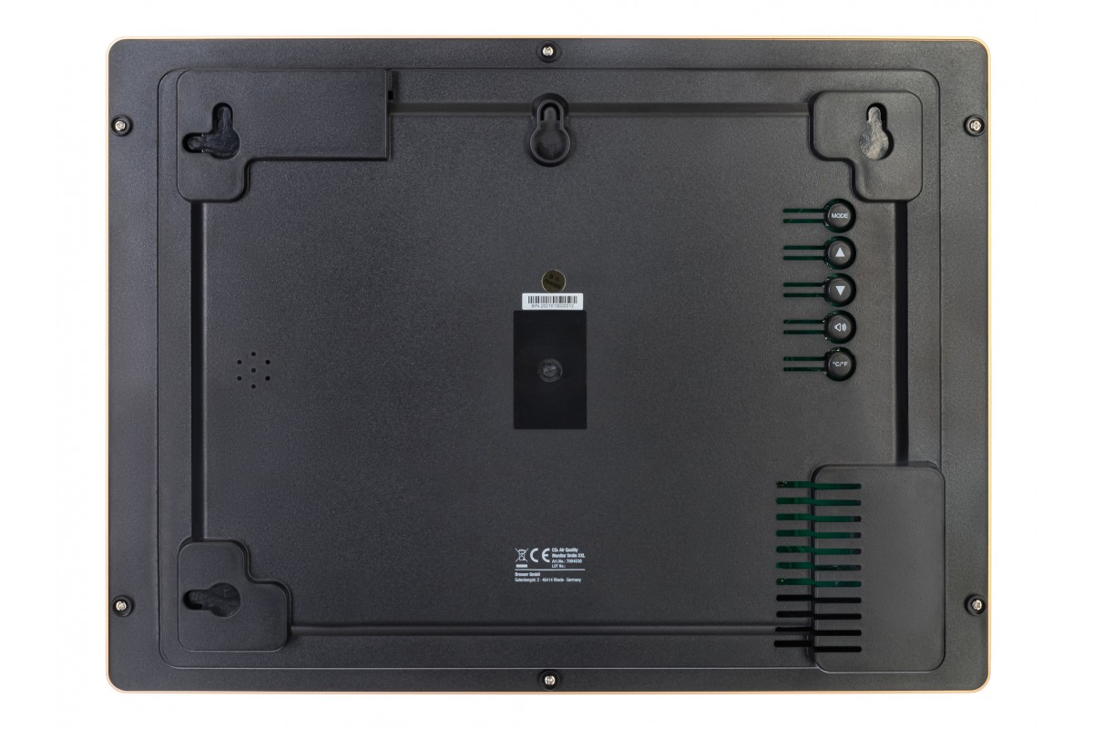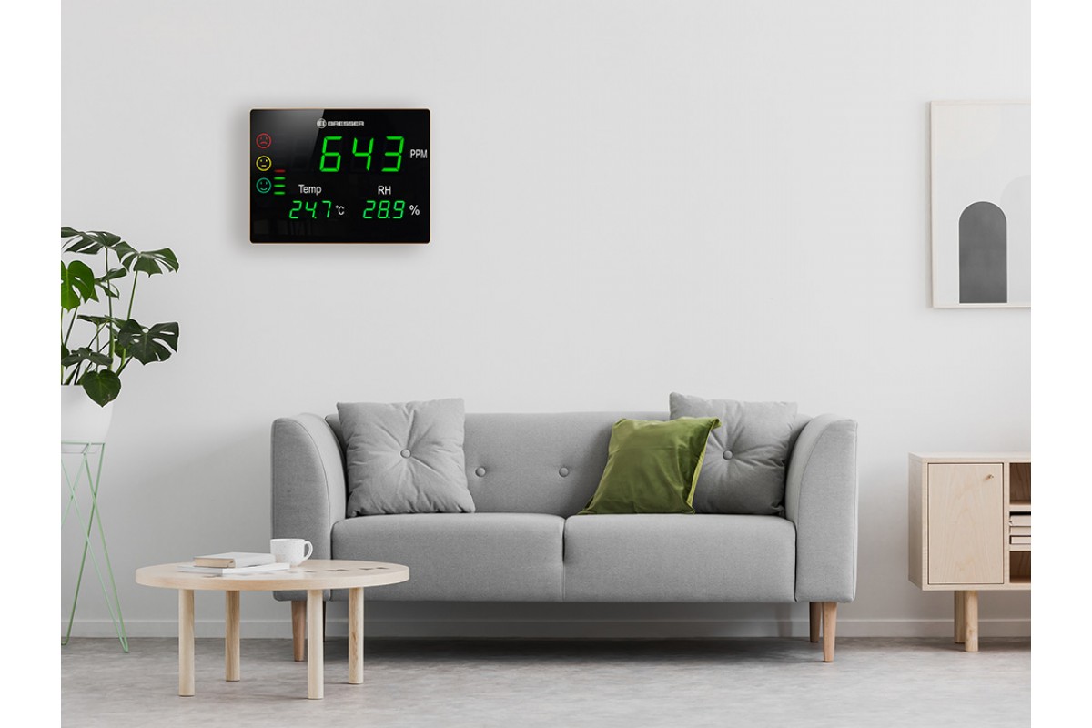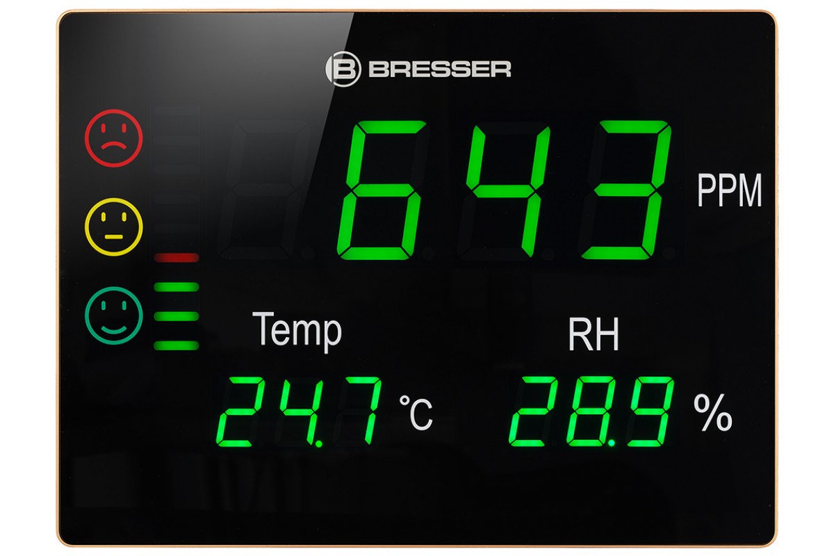 Гигрометр Bresser Air Quality Smile XXL сразу привлекает внимание своим современным и стильным дизайном. Корпус очень тонкий, высококонтрастный цветной экран не имеет рамок, индикация яркая и хорошо читаемая с большой дистанции. К тому же прибор определяет не только влажность воздуха, но также температуру и уровень углекислого газа в помещении. Также он предупреждает о предельных значениях – слишком высоких показателях, некомфортных для человека.