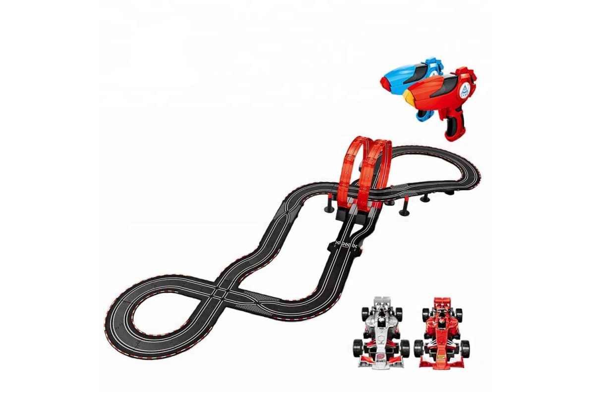 Комплект поставки: трасса; 2 машинки; 2 пульта управления; запасные покрышки; запасные щеточки питания; знаки; бордюры; наклейки.