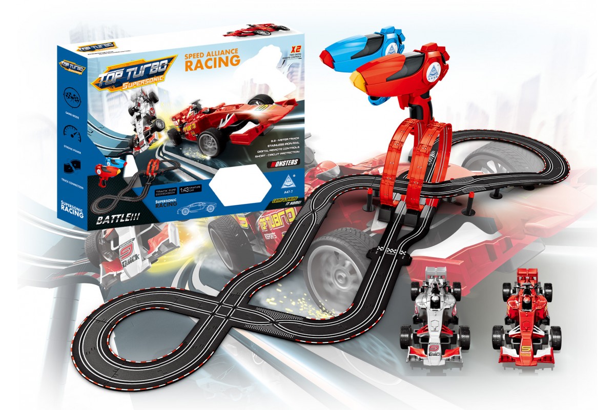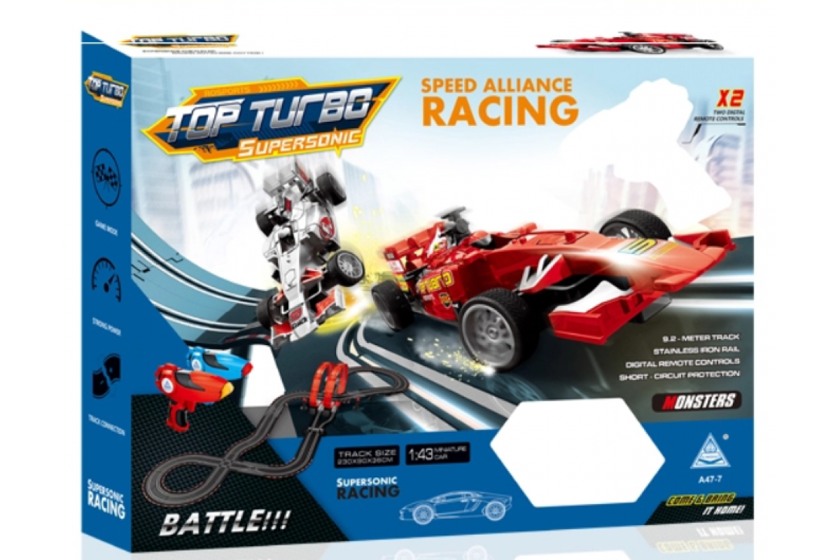 Гоночный автотрек Soba (920 см, 2 машинки на пульте, питание от сети, звук, 27 MHz) - SOBA-A47-7 - это гоночная трасса длиной 9.2 метра от SOBA. Теперь играть стало еще веселее, а перегонки станут главной игрой для юных ребят. Особенность данной модели в том, что только вы задаете скорость движения машинки. На поворотах нужно притормаживать, чтобы не вылететь за пределы трассы. Когда машинка приближается к петле - нужно максимально ускориться - чтобы успешно преодолеть этот участок трассы. В общем, все как в настоящих гонках. Управление происходит с помощью беспроводного пульта. Самое главное, что играть и соревноваться на треке можно вдвоем.