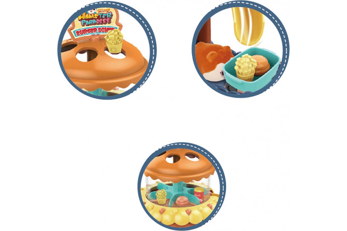 Специальный гладкий трек позволяет не пропустить хомяку любимое кафе, а дорожная разметка и указатели не дадут столкнуться с другими жителями. В кафе есть удобный столик со встроенным зонтом и меню. Система выдачи заказов прямо в тележку хомячку, откуда он может поехать по делам или остановиться с другом за столиком. Здесь готовят самые лучшие бургеры для хомячков!