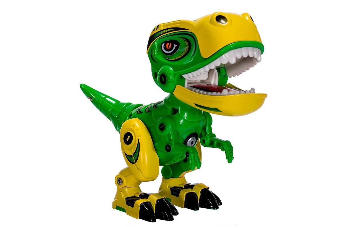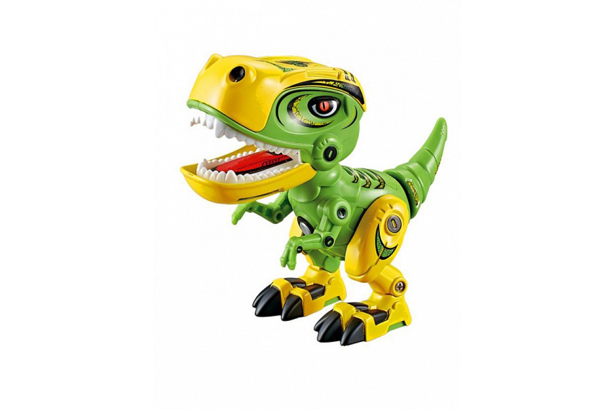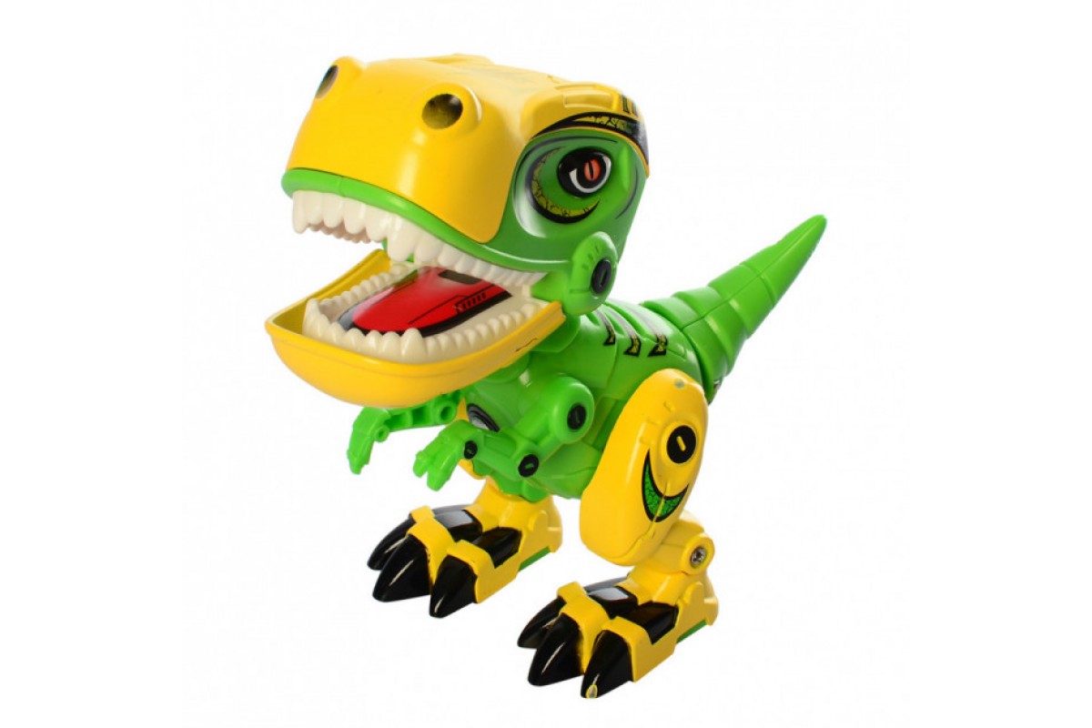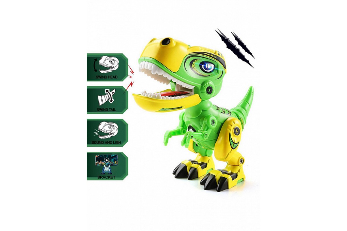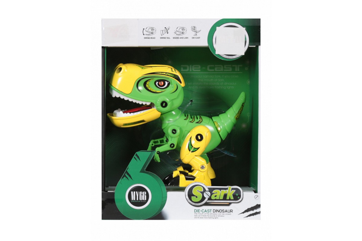 Интерактивный динозавр со светом и звуком - MY66-Q1203L-G - это яркий пластиковый динозаврик тираннозавр с металлическими вставками, который имеет звуковые эффекты: несколько видов рычания. Начинает рычать если сжать ему мордочку. Также имеет подсветку - светятся глаза. Подвижные задние лапы, хвост, голова и пасть. Динозавр может поворачивать голову влево-вправо, свободно качать суставами лап и хвоста. Когда рот закрывается он рычит и мигает светом в глазах и горле. Если в течение 60 секунд не будет нажатий клавиш, он автоматически вернется в состояние сна, чтобы сэкономить электроэнергию.