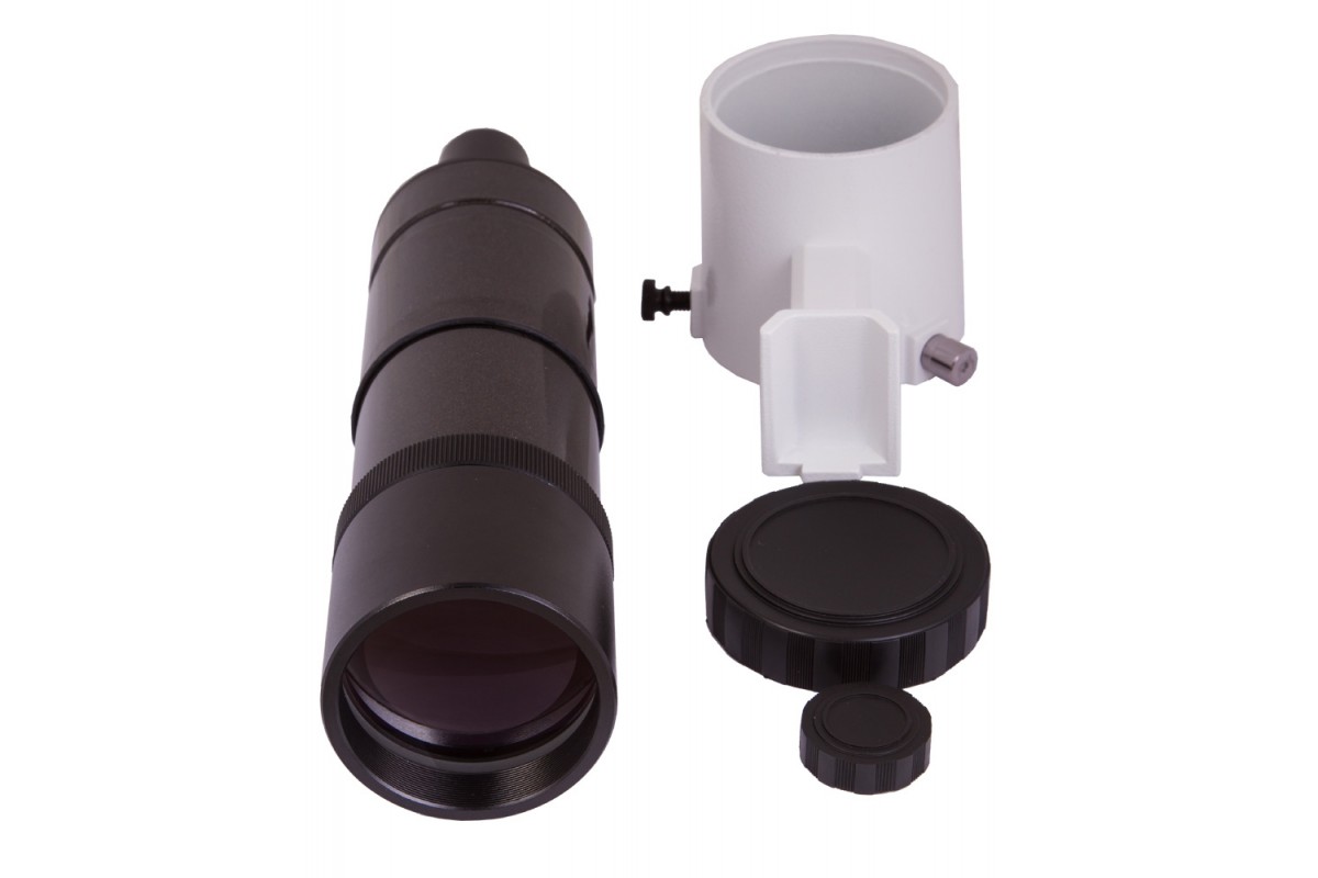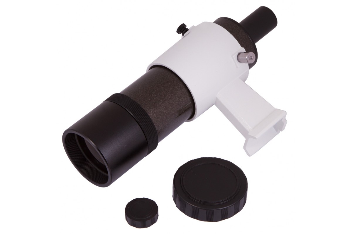 Искатель поставляется в комплекте с держателем, при помощи которого устанавливается на трубу телескопа. Конструкция держателя позволяет легко выровнять трубку искателя относительно телескопа.