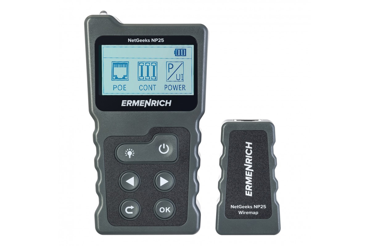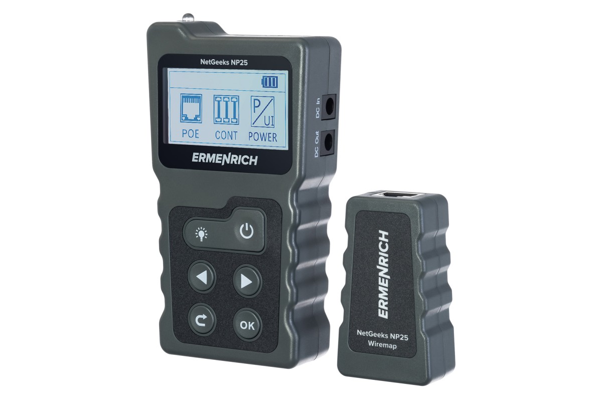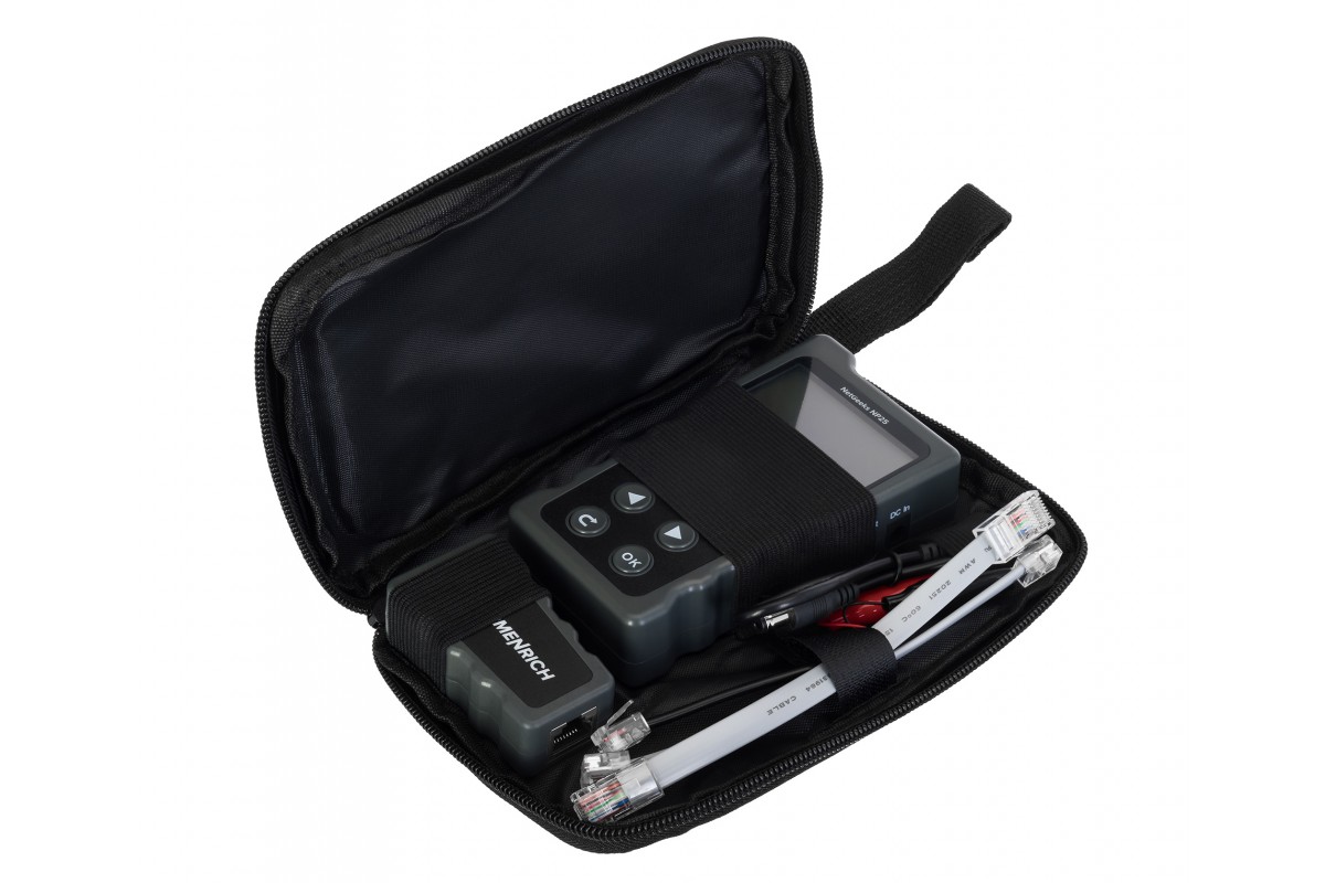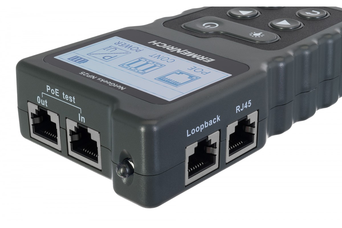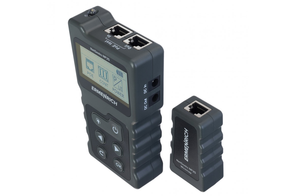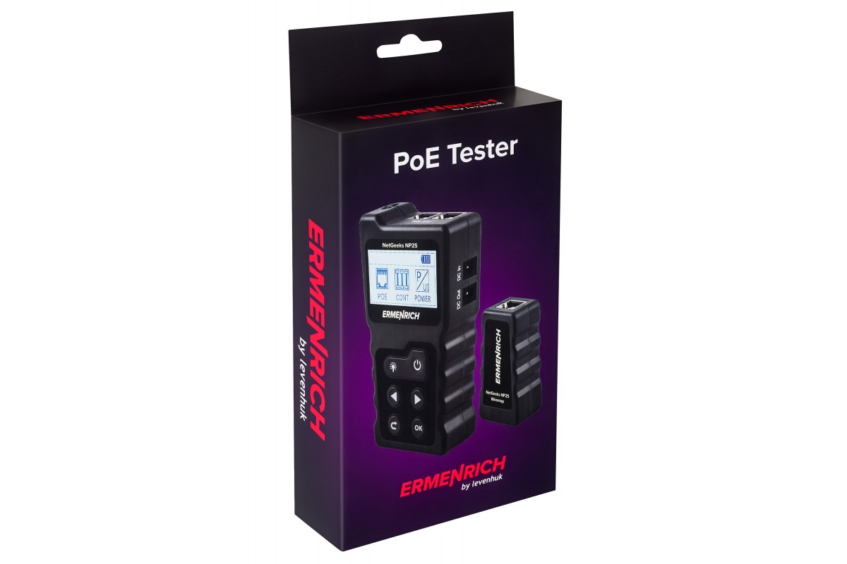 Прибор для тестирования кабельных сетей с технологией питания через Ethernet (PoE). Прибор работает с кабелями категорий 5 и 6 длиной до 600 м, совместим со всеми типами устройств Ethernet. Помогает найти места обрыва кабелей, короткого замыкания, позволяет обнаружить перекрещенные пары. Есть возможность определять тип питающего оборудования и его местоположение, мощность и напряжение источника питания, полярность напряжения.