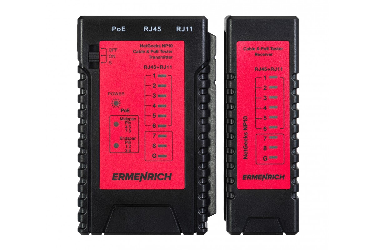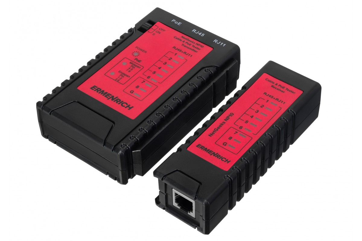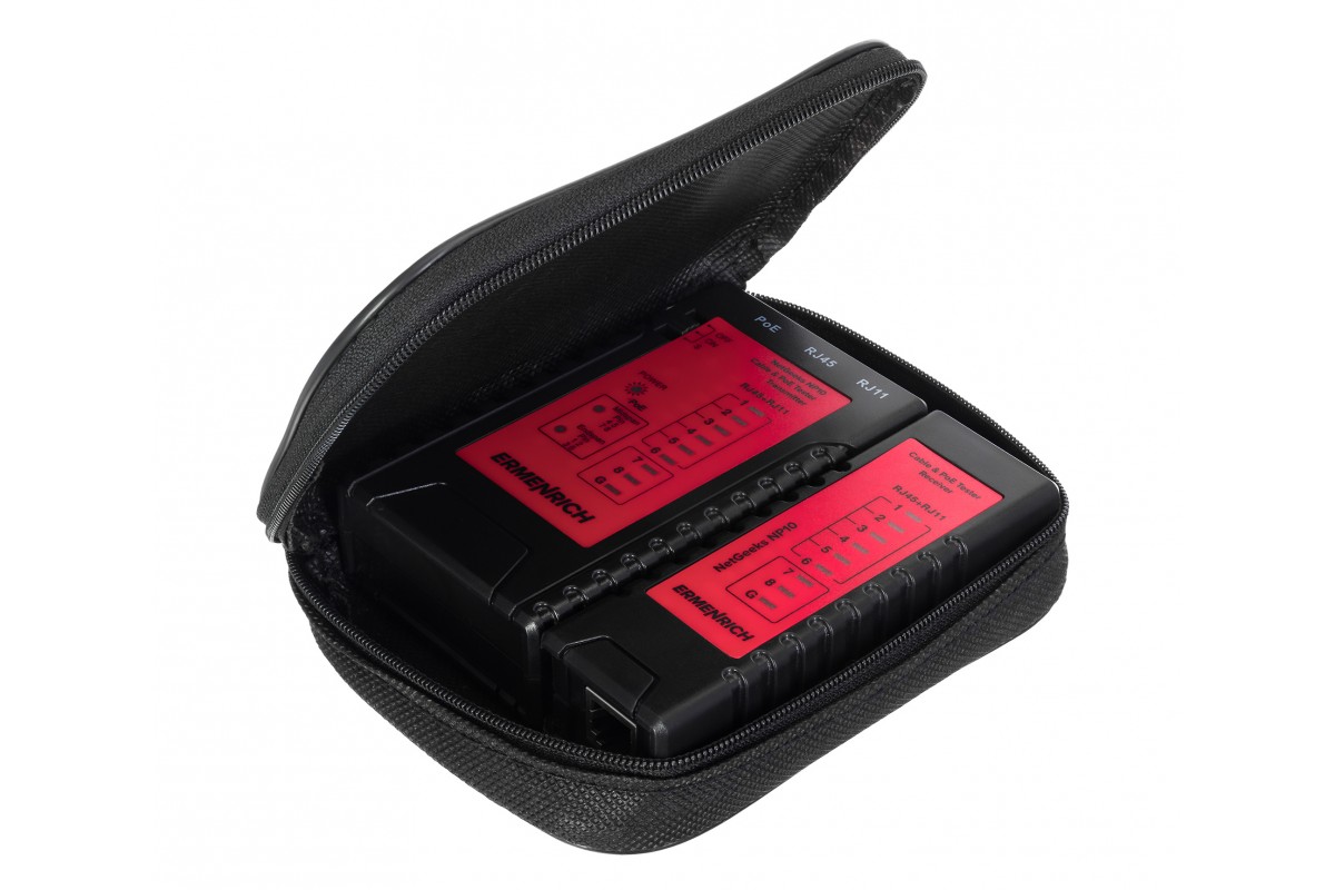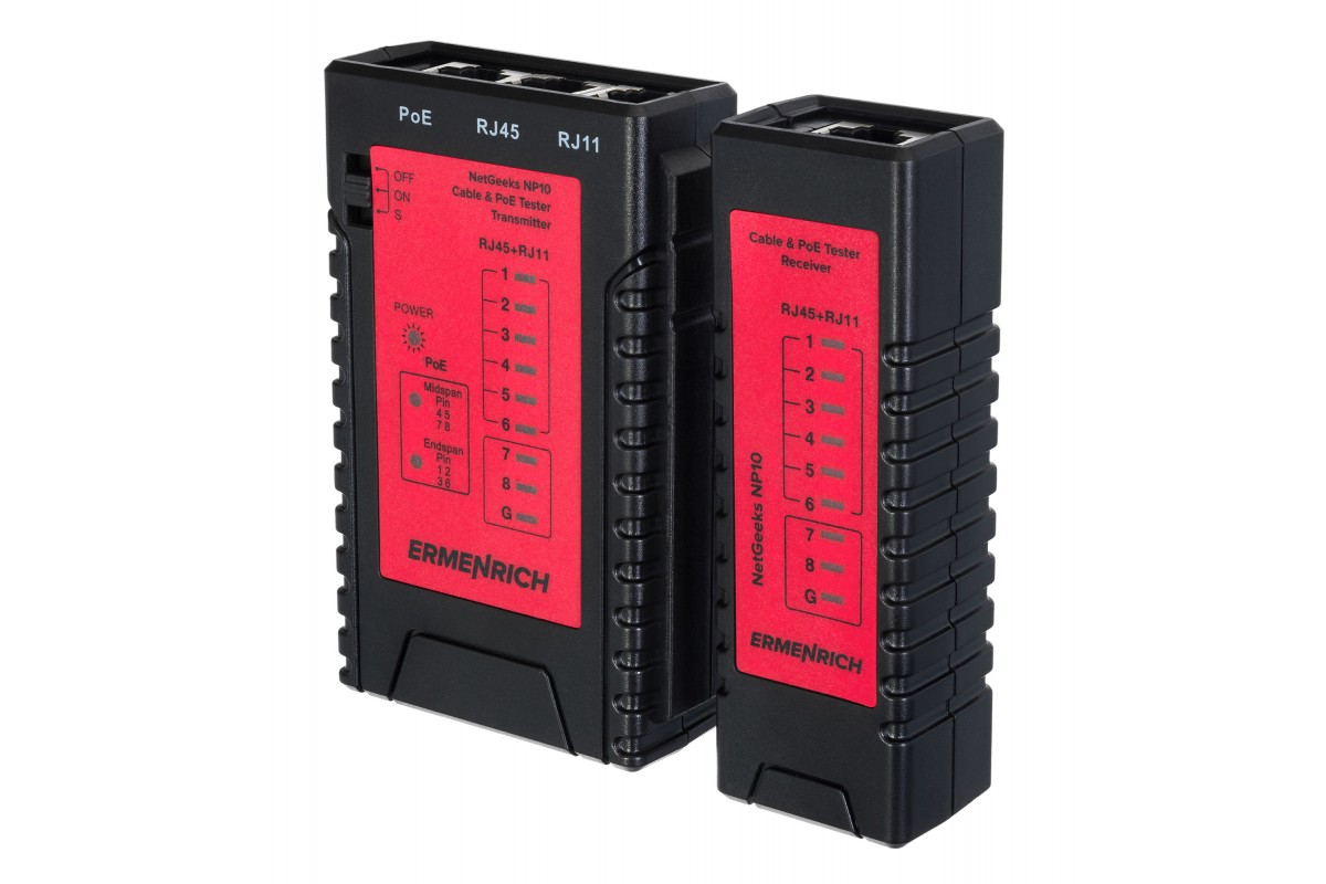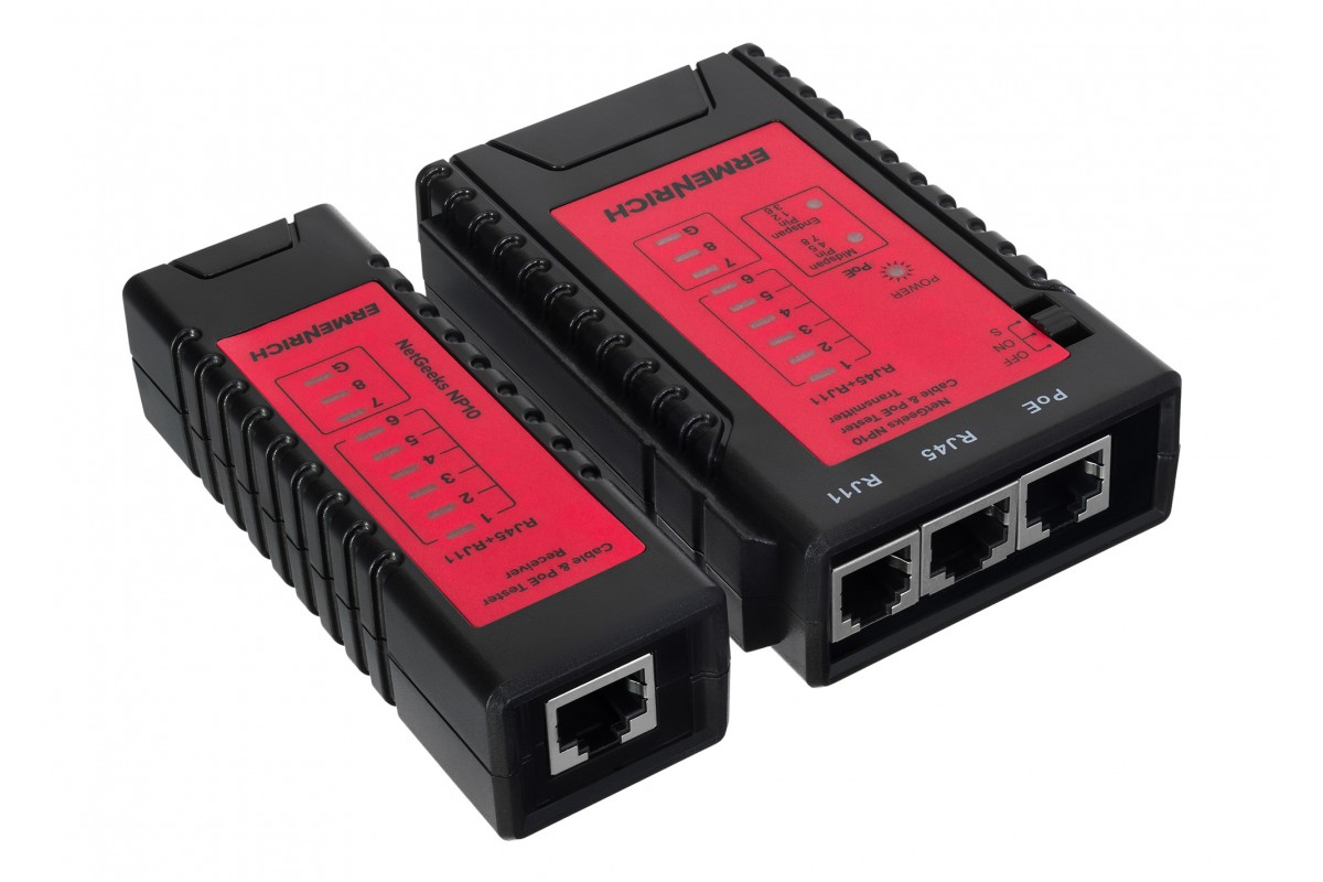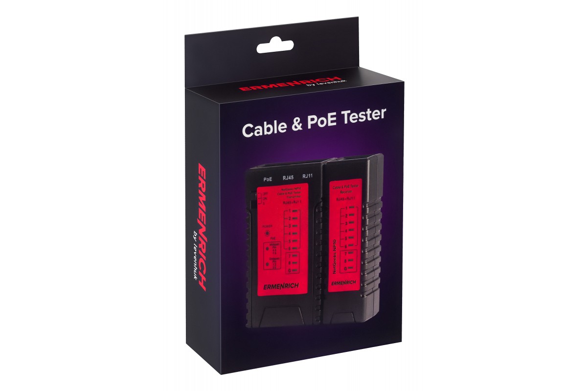 Состоит из двух отдельных устройств: передатчика и приемника. Передатчик оснащен индикаторной панелью и разъемами PoE, RJ11 и RJ45, питается от 1 батарейки 9 В (не входит в комплект). Приемник имеет 1 общий разъем RJ11/RJ45, не требует источника питания. Кабельный тестер будет полезен инженерам по монтажу и техническому обслуживанию IP-сетей, системным администраторам и другим специалистам по сетям Ethernet.