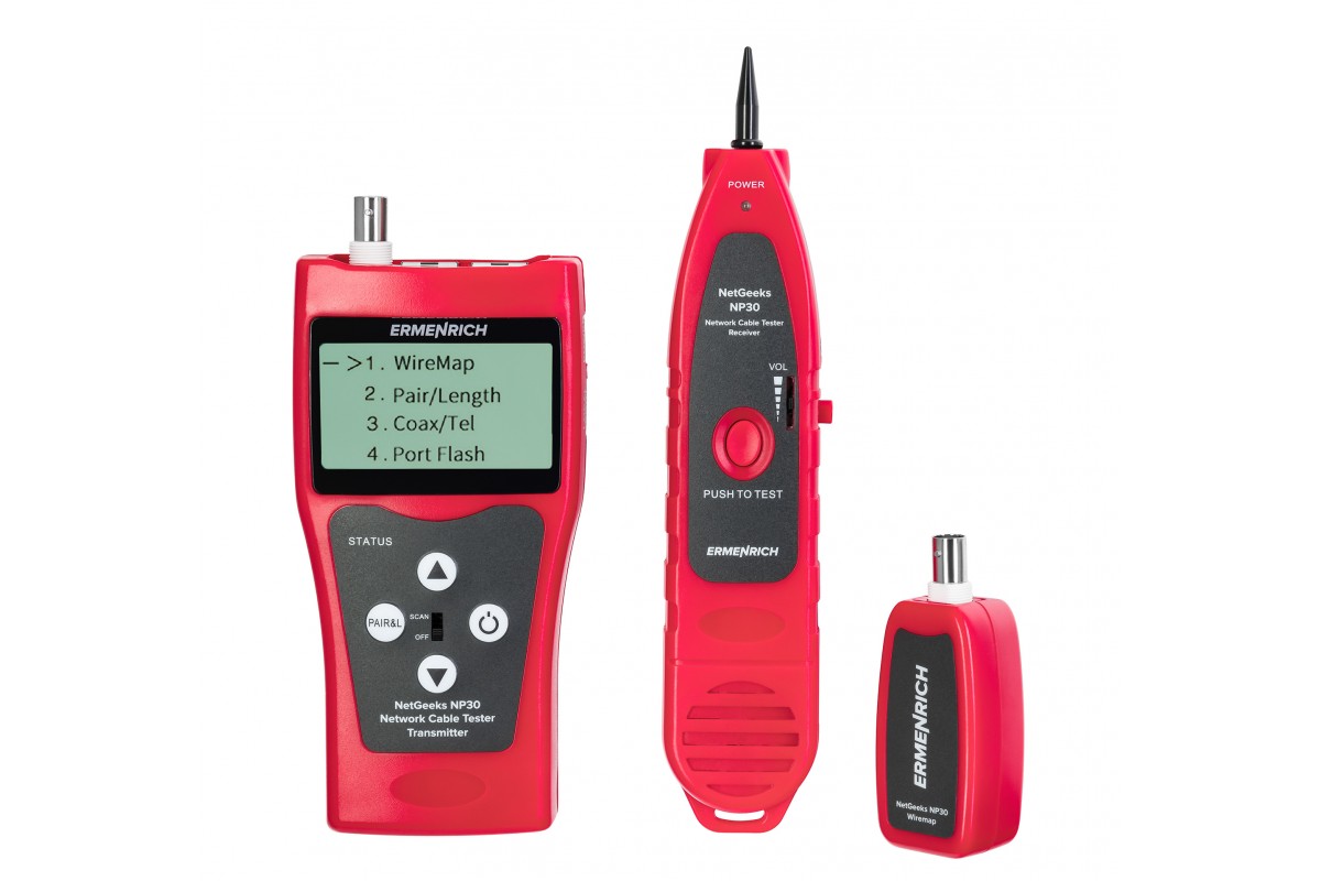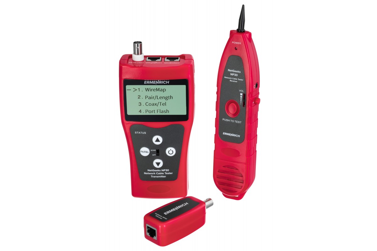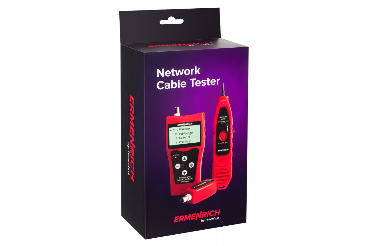 Тестер используется для диагностики сетевых (STP/UTP категорий 5E/6/6A/7), телефонных и электрических кабелей. Предусмотрена функция Port Flash (проблесковая индикация) для определения порта, к которому подключен кабель. Длина кабелей LAN измеряется в диапазоне 5–350 м. Есть функция калибровки для достижения максимальной точности измерений.