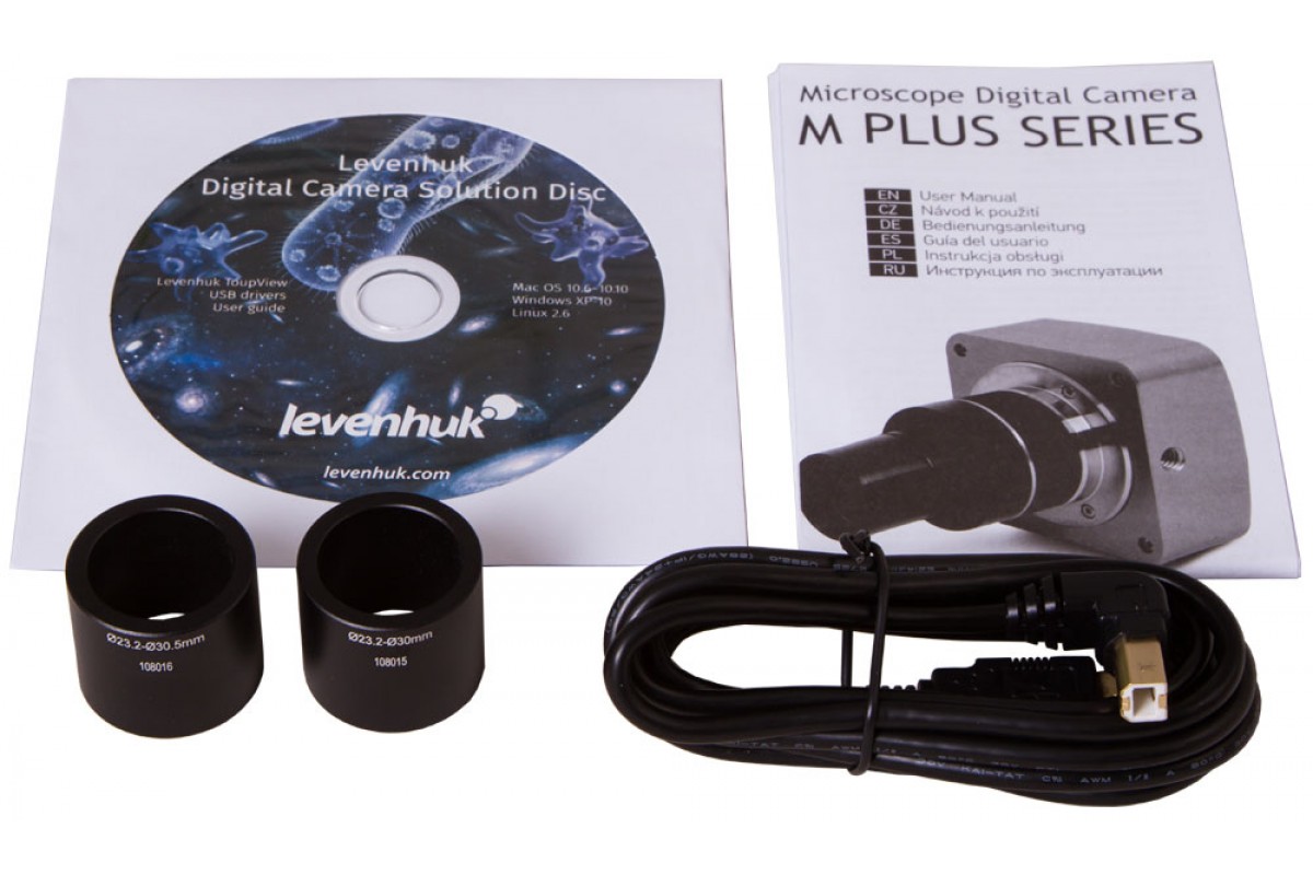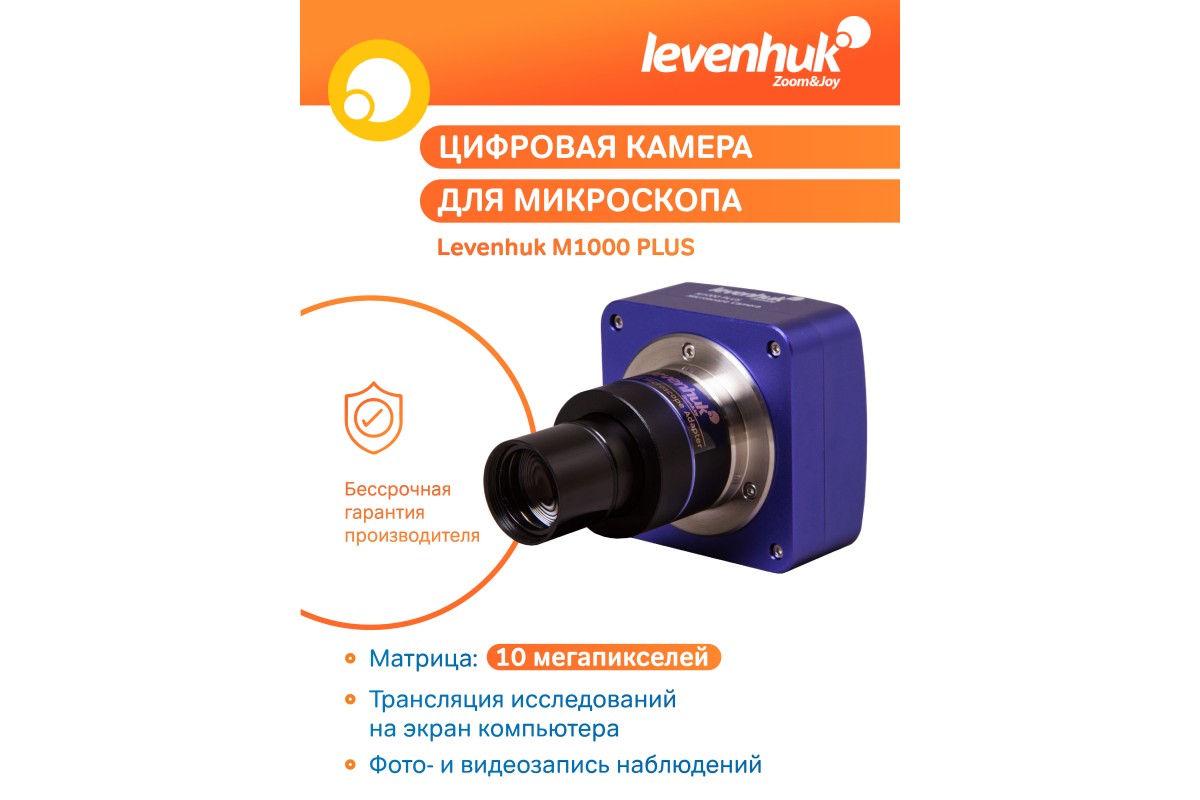 Цифровая камера Levenhuk M1000 PLUS – 10-мегапиксельная камера для микроскопов, которая позволяет фотографировать микропрепараты и записывать микроисследования в память компьютера. Камера устанавливается в окулярную трубку и работает как цифровой окуляр. Она передает изображение с объектива микроскопа на экран компьютера в режиме реального времени. За обработку кадров отвечает специальная программа Levenhuk, диск с которой включен в комплект поставки.