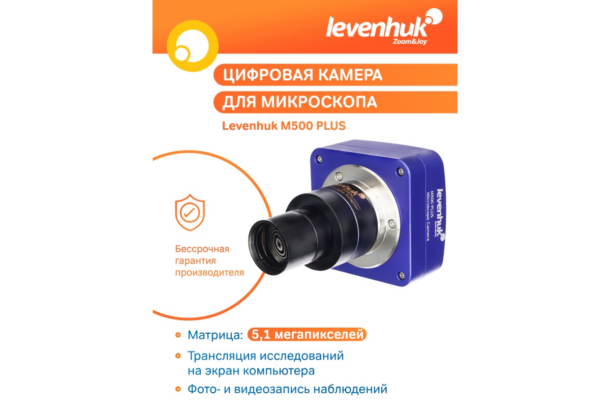 5-мегапиксельная цифровая камера Levenhuk M500 PLUS станет прекрасным помощником для тех, кто профессионально или в рамках учебы или хобби занимается микронаблюдениями с использованием инструментальных, биологических или стереоскопических микроскопов. Камера поможет вам зафиксировать наблюдения на видео или фото в высоком разрешении (до 2592x1944) или вывести изображение, получаемое в ходе работы, на внешний экран для трансляции на аудиторию. Камера оснащена чувствительной CMOS-матрицей 1/2,5". Благодаря возможности варьировать кадровую частоту видеосъемки в диапазоне от 7 до 100 кадров в секунду вы сможете в подробностях фиксировать как быстро, так и медленно протекающие процессы.