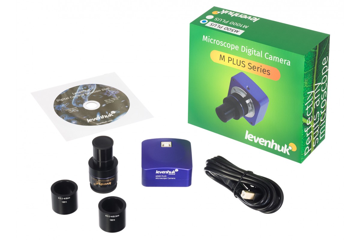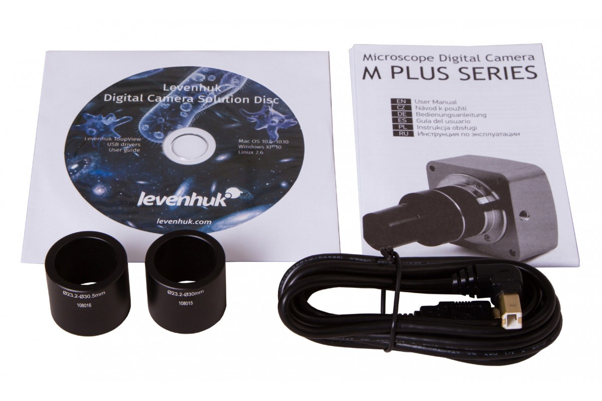 Камера универсальна, ее можно использовать с микроскопами любых брендов. Аксессуар устанавливается вместо окуляра в окулярные трубки с посадочными диаметрами 23,2 мм, 30 мм, 30,5 мм: все необходимые переходники уже имеются в комплекте поставки, дополнительных приобретений не требуется. Подключение к компьютеру и питание камеры осуществляется через USB-соединение (кабель есть в комплекте).