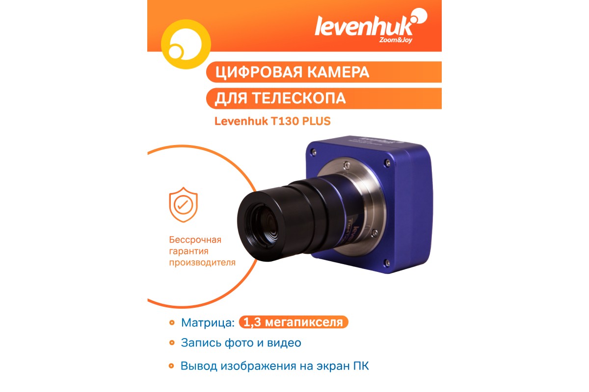 Цифровая камера Levenhuk T130 PLUS – модель, созданная специально для телескопов. Матрица в 1,3 Мпикс позволяет получать четкие и контрастные снимки разрешением до 1280x1024 пикселей. Камера может передавать изображение в реальном времени или записывать видео в трех режимах. Для получения максимально плавной картинки вам доступен выбор кадровой частоты в диапазоне от 15 до 50 кадров в секунду.