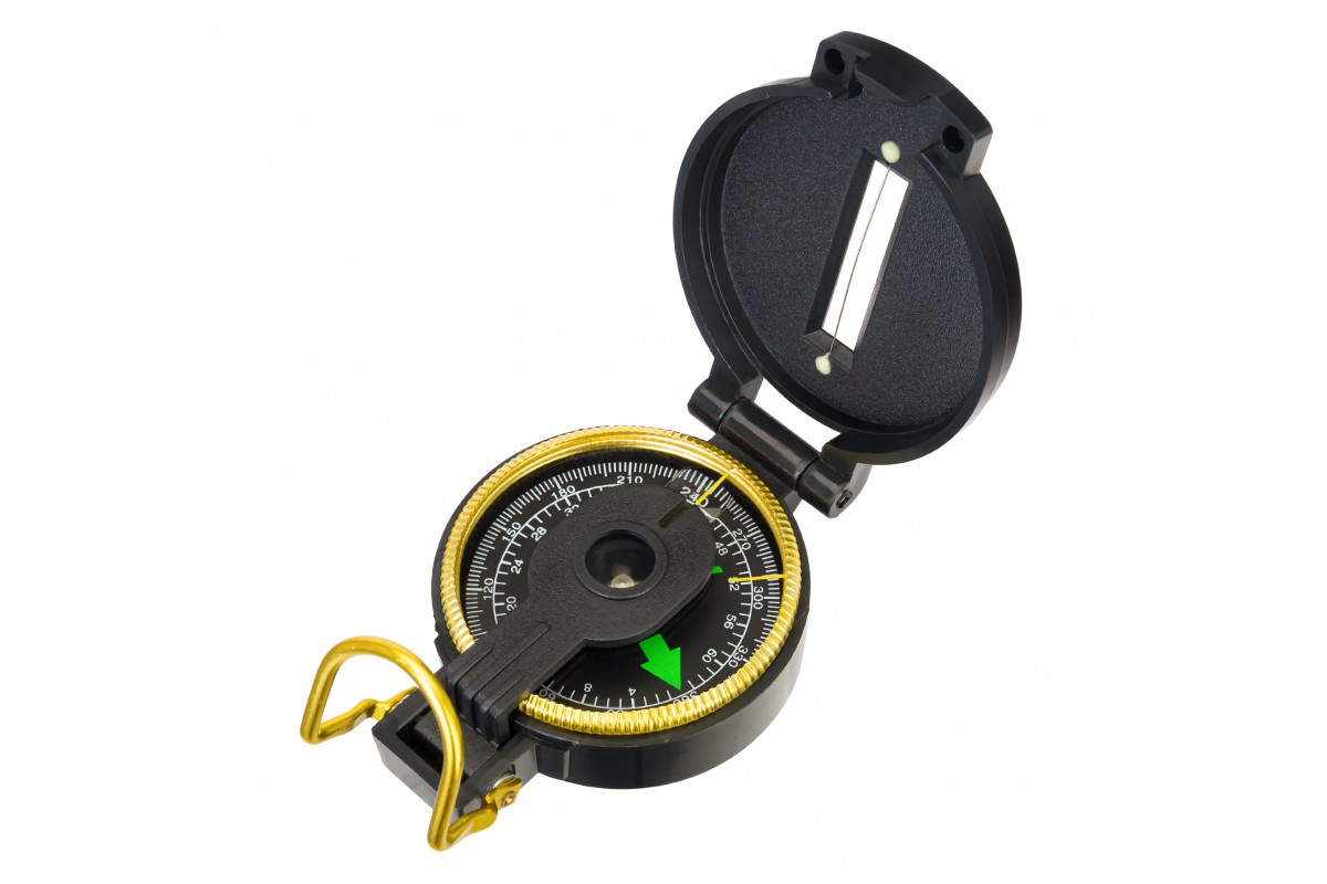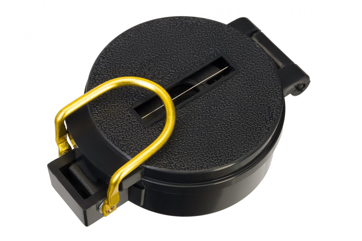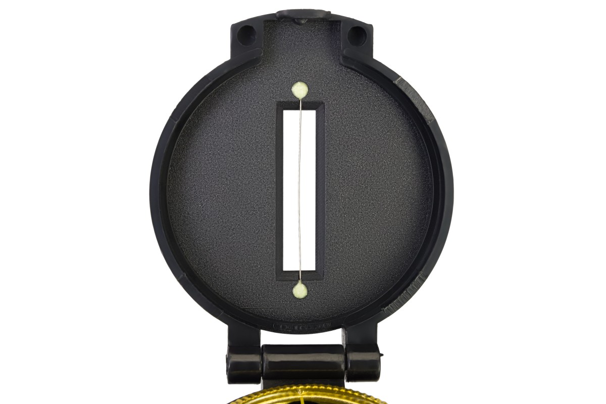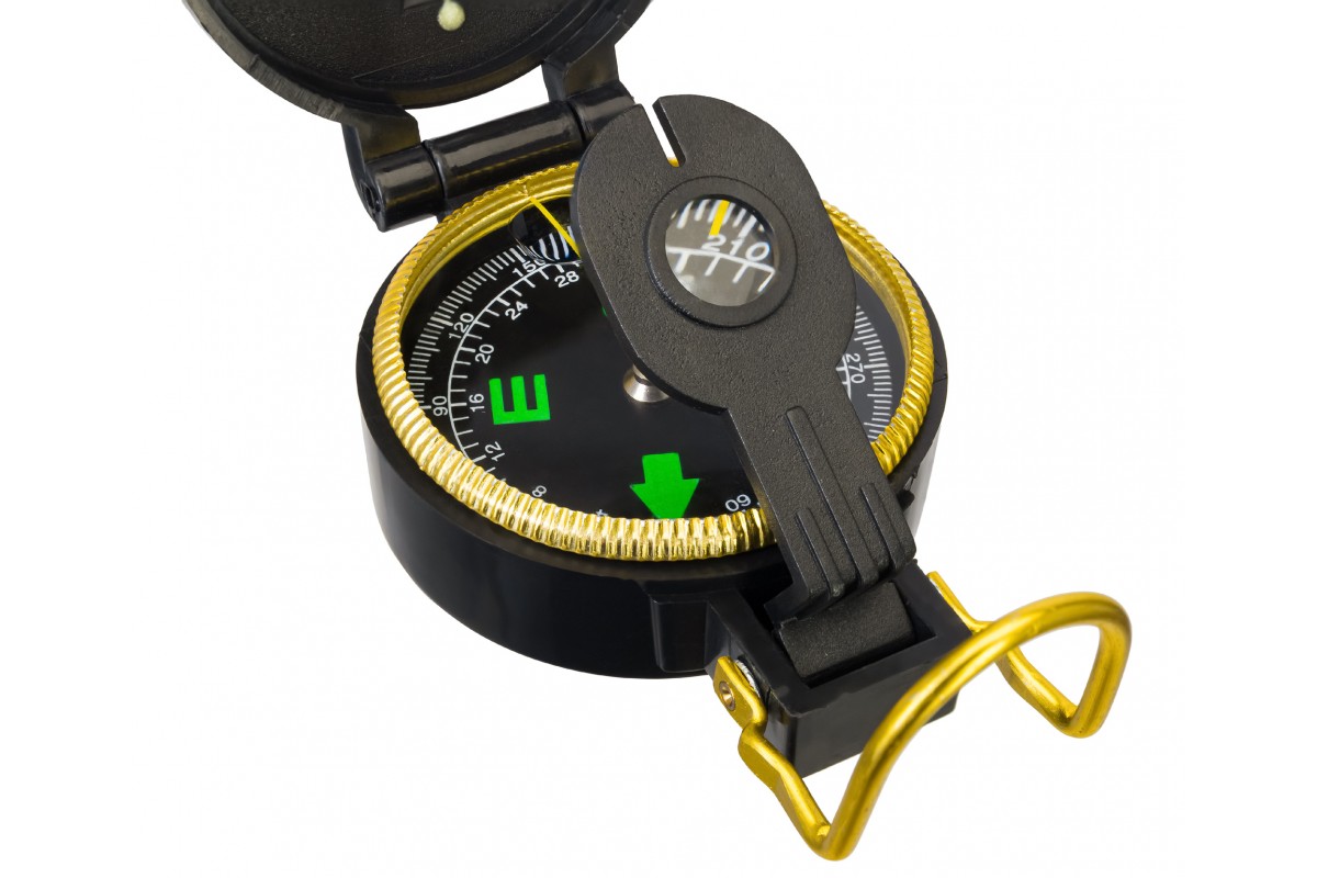 Магнитная стрелка помещена в специальную демпфирующую жидкость и достаточно быстро затихает в одном положении. Корпус складной и выполнен из пластика с элементами алюминия. Есть прицельная прорезь и прицельная нить.