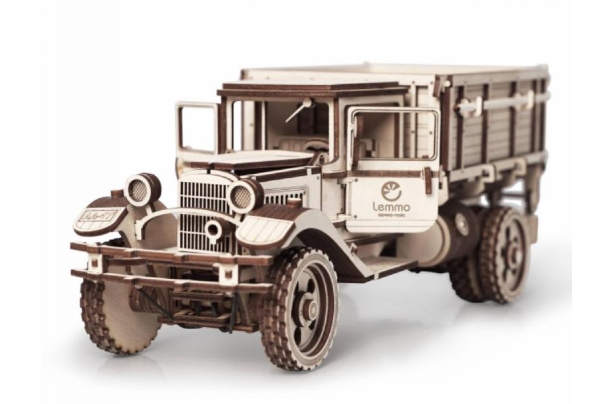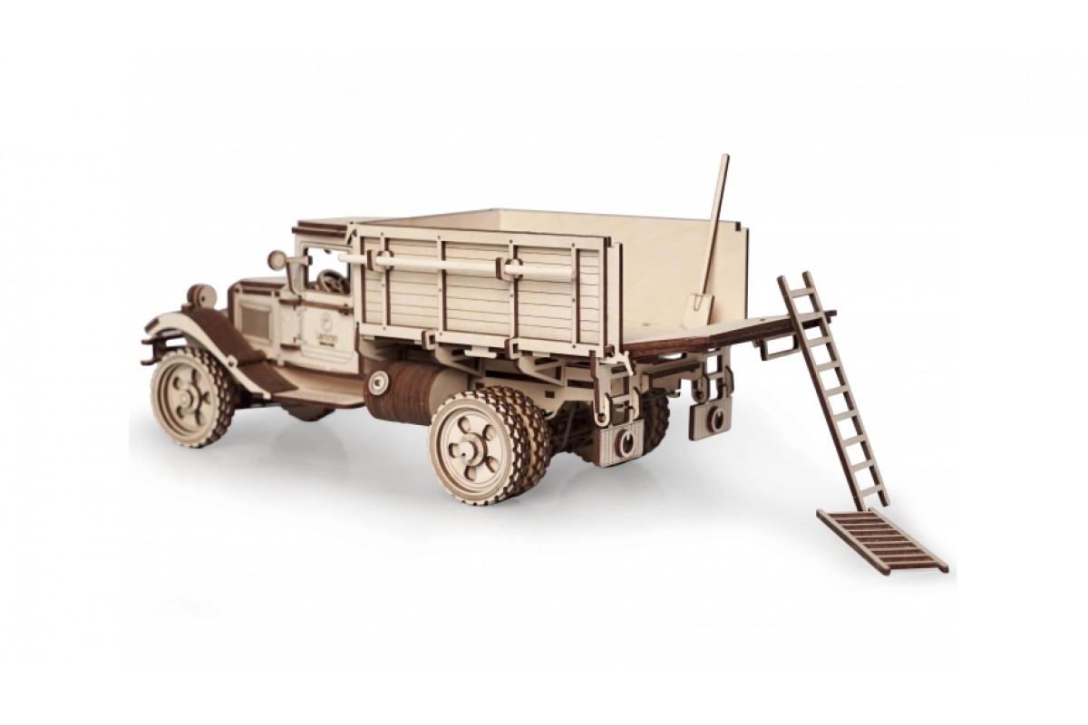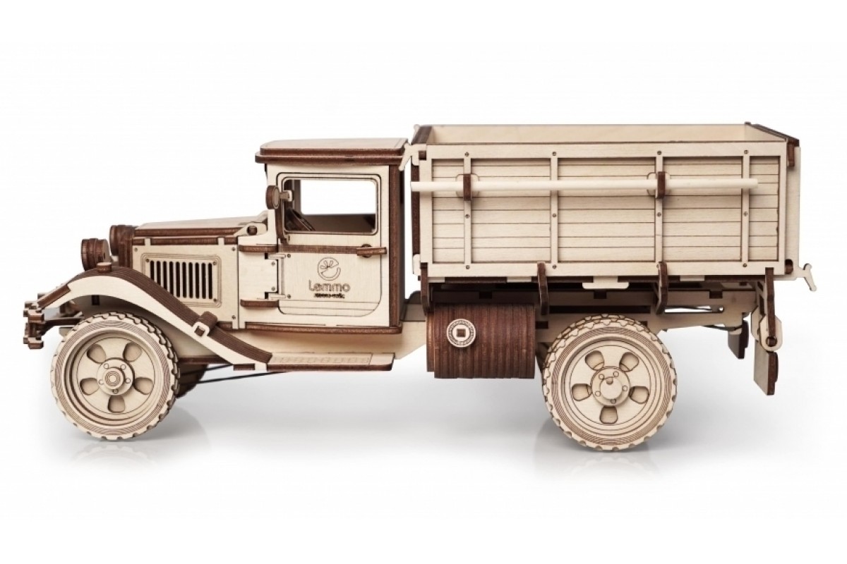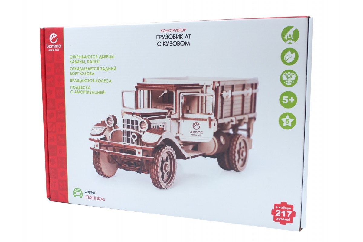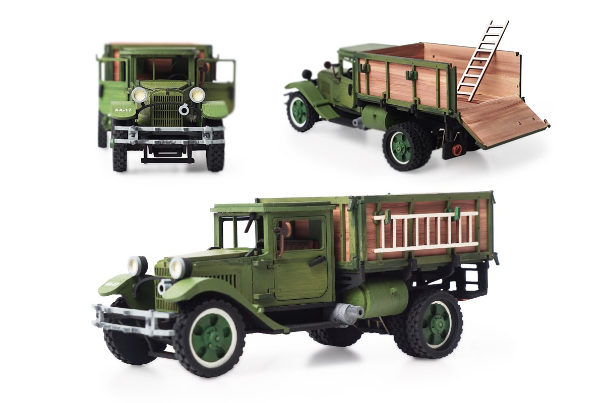 У собранной модели вращаются колеса, открываются дверцы кабины, капот, откидывается задний борт кузова.