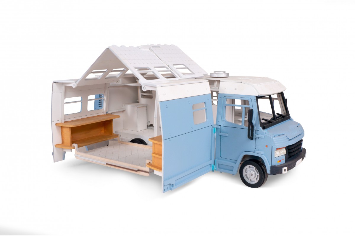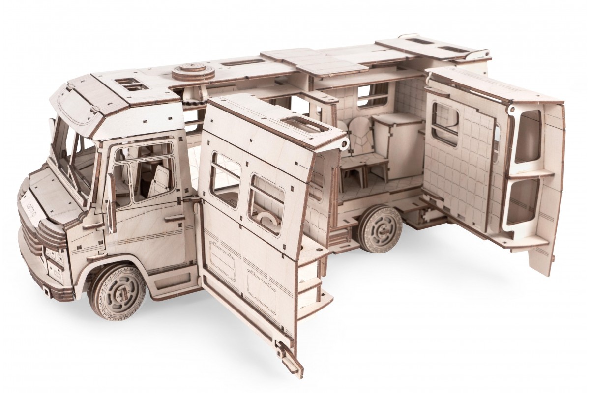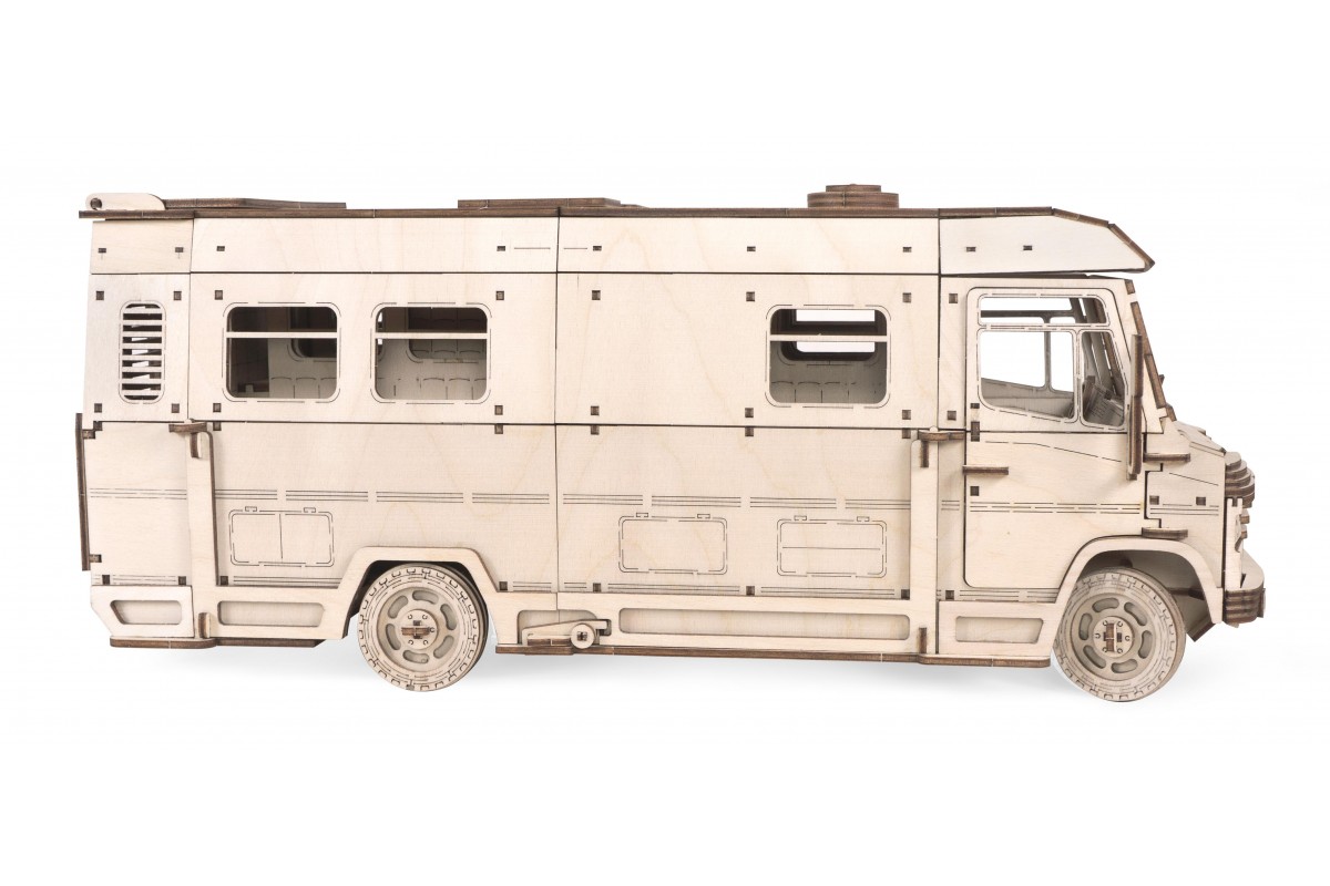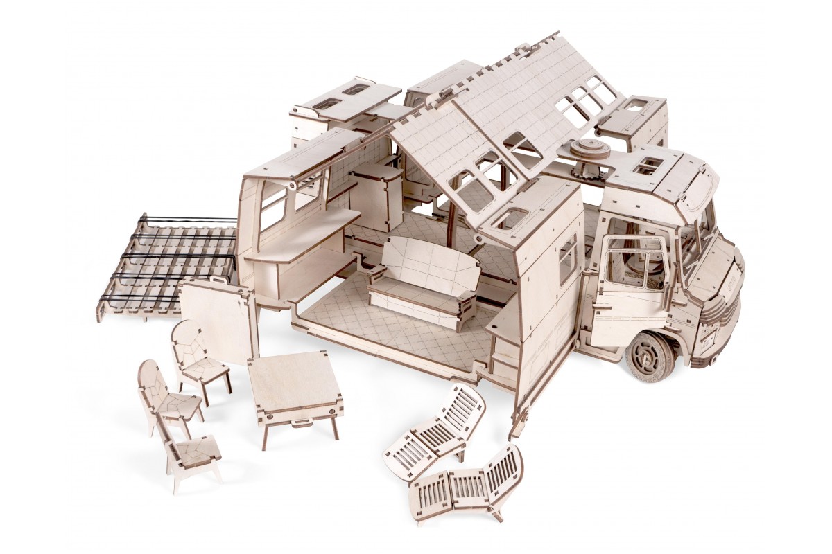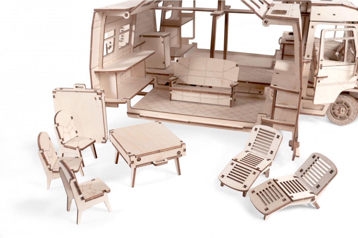 Модель "Пикник" представляет собой домик на колесах, который выглядит и ездит как микроавтобус. У него крутятся колеса, открываются двери, есть пикниковая зона с мебелью, кухня, санузел с душем, внутренняя зона отдыха и багажник.