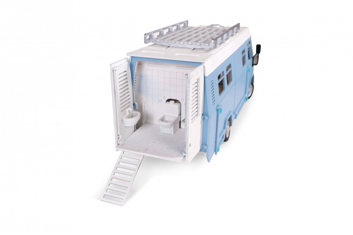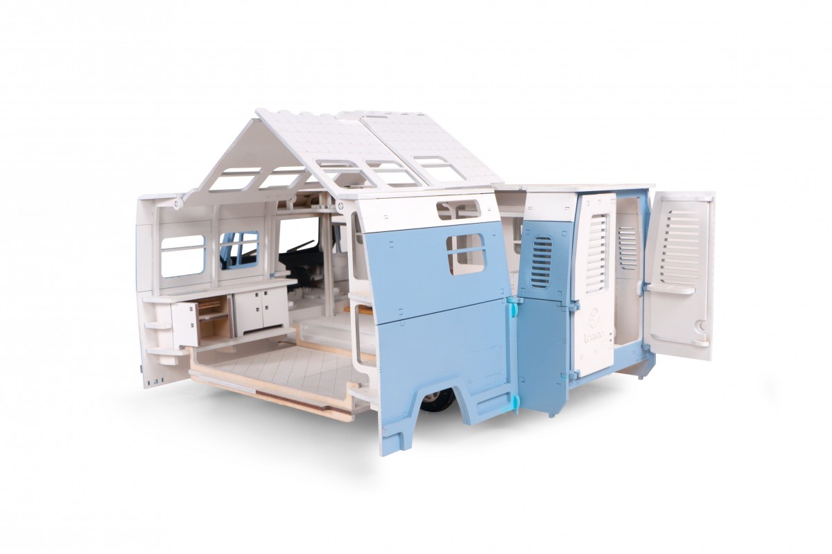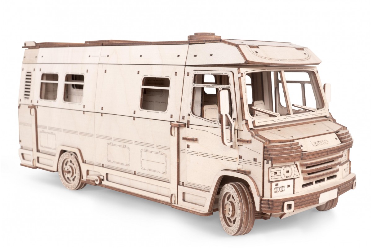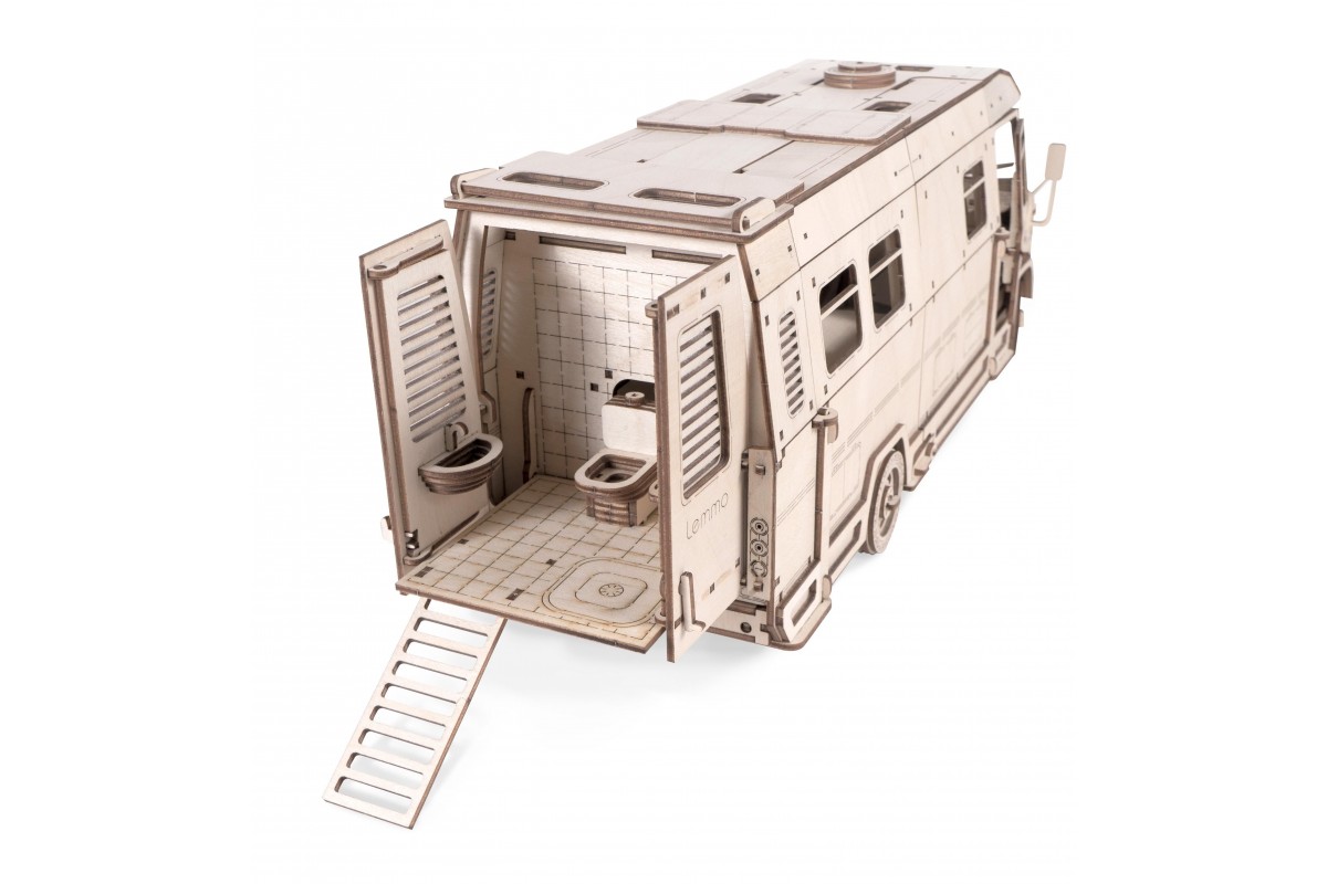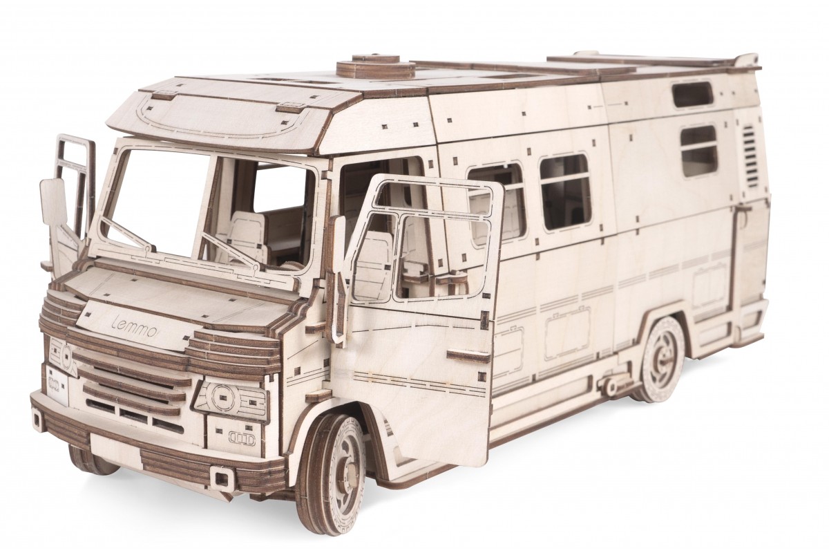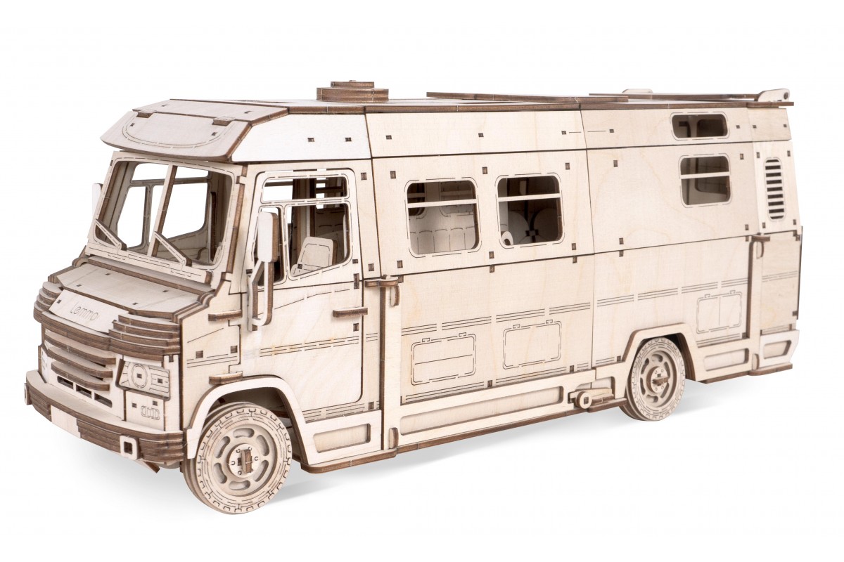 Модель "Пикник" представляет собой домик на колесах, который выглядит и ездит как микроавтобус. У него крутятся колеса, открываются двери, есть пикниковая зона с мебелью, кухня, санузел с душем, внутренняя зона отдыха и багажник.