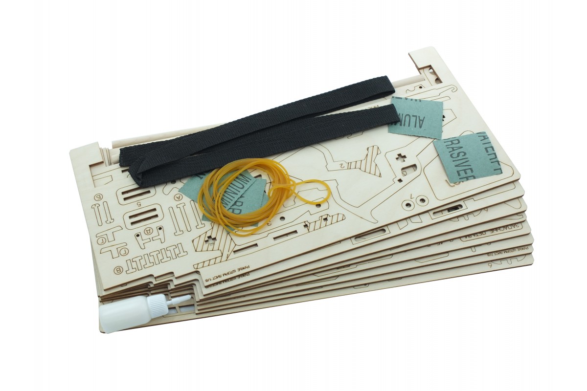 Собранная модель стреляет резинками с прицельной дальностью до 3 метров. В комплекте идут резинки для стрельбы, а также подробная инструкция и наждачная бумага для сборки.