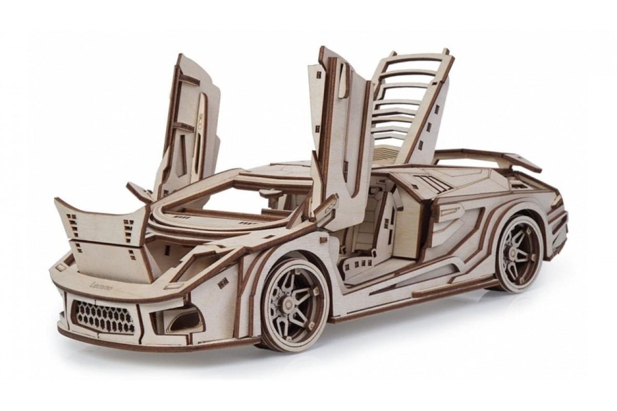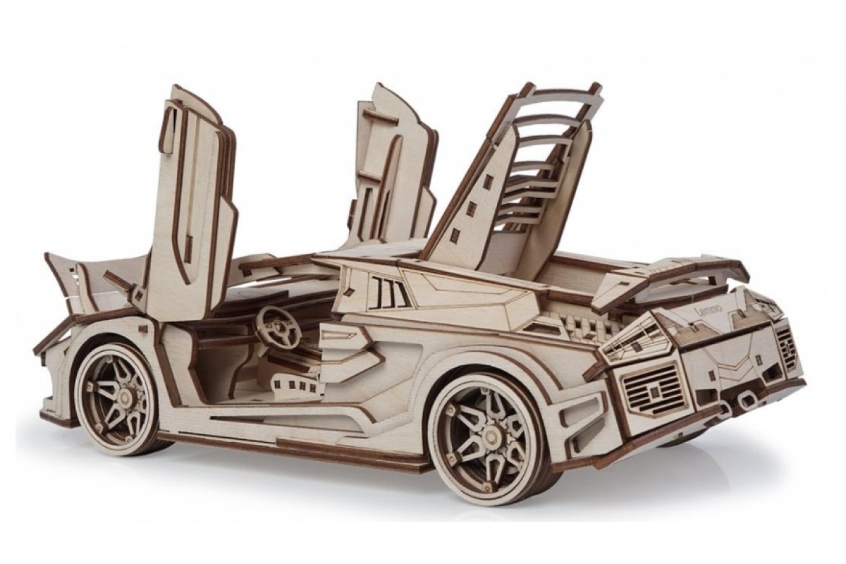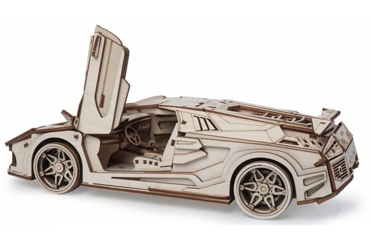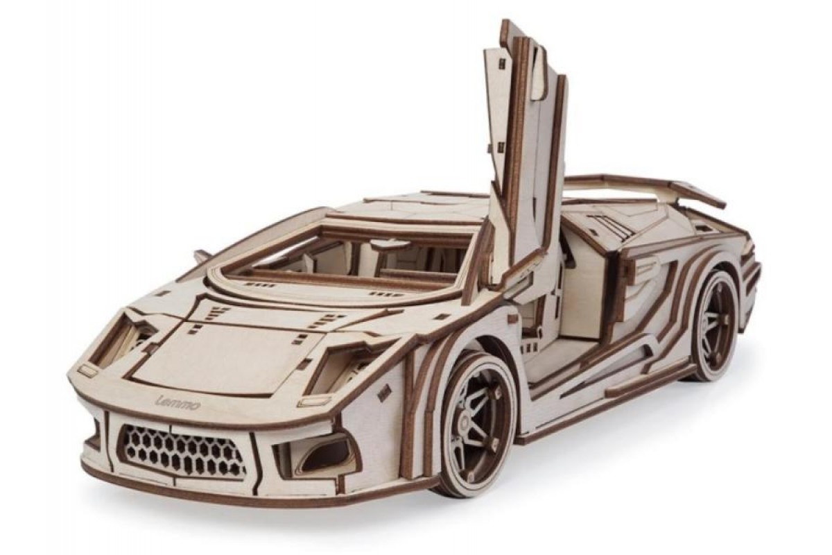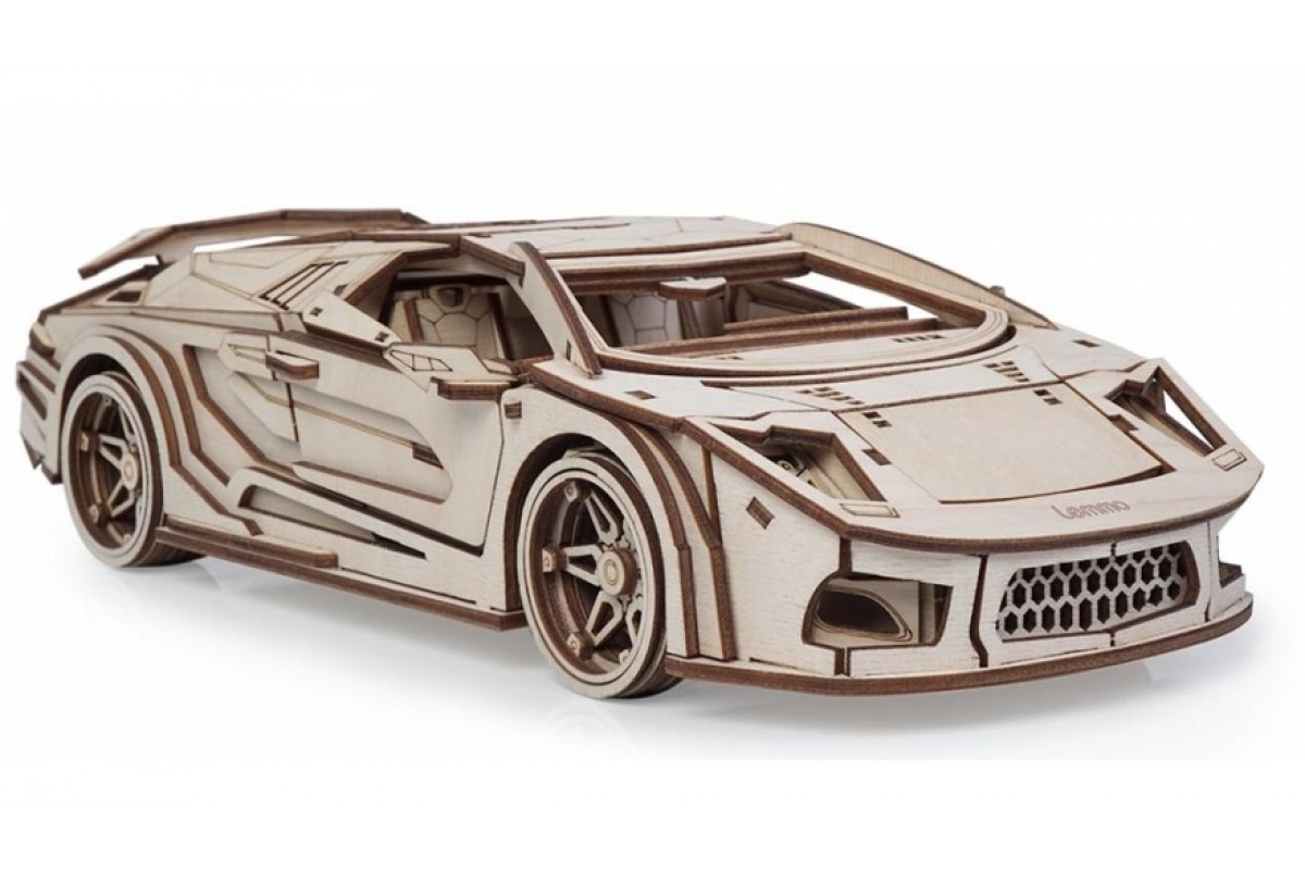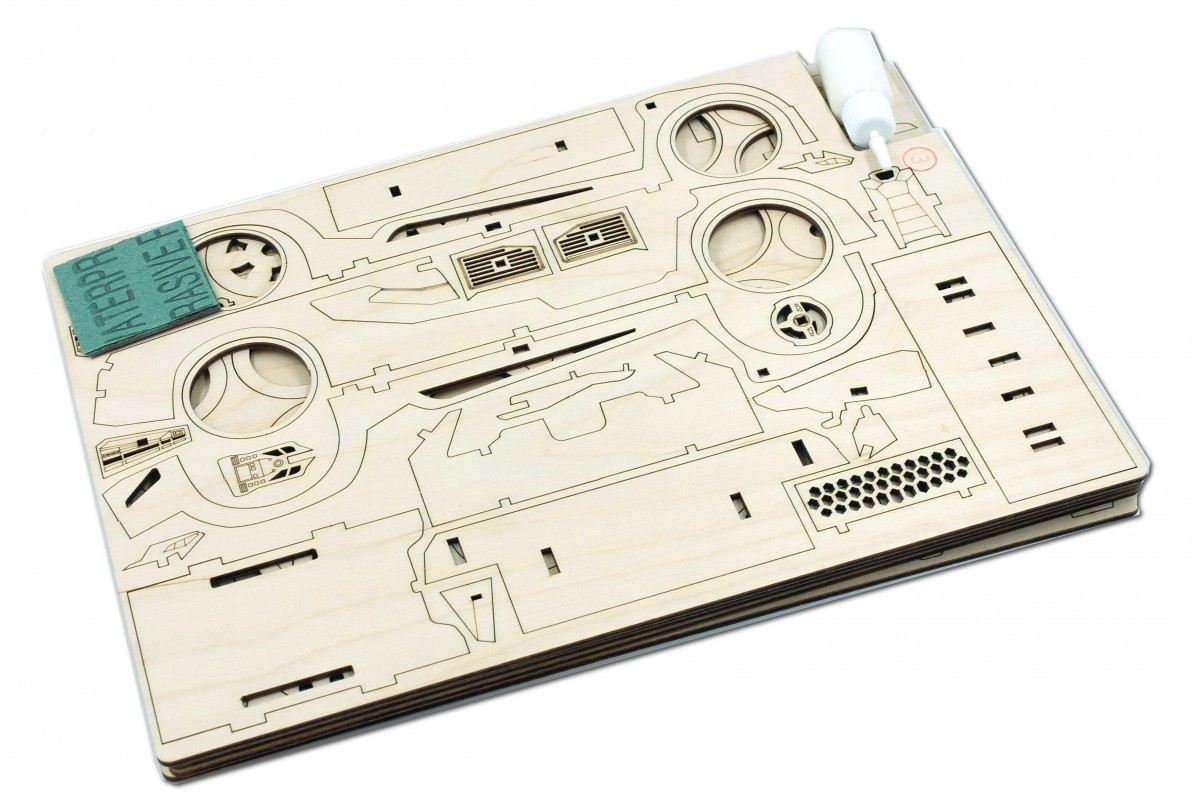 В комплекте с конструктором идут 218 деталей, наждачная бумага и клей ПВА. Это позволяет собрать модель спорткара, которая будет вращать колеса, открывать двери, крышку отсека двигателя и багажник.
