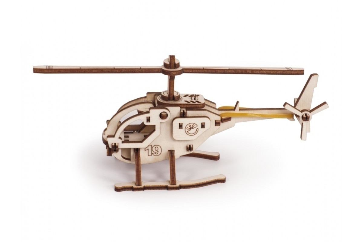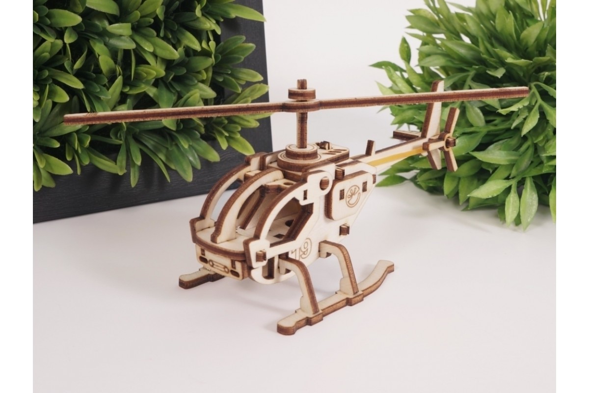 У собранной модели вращается несущий винт на резиномоторе. Открывается кабина вертолёта.