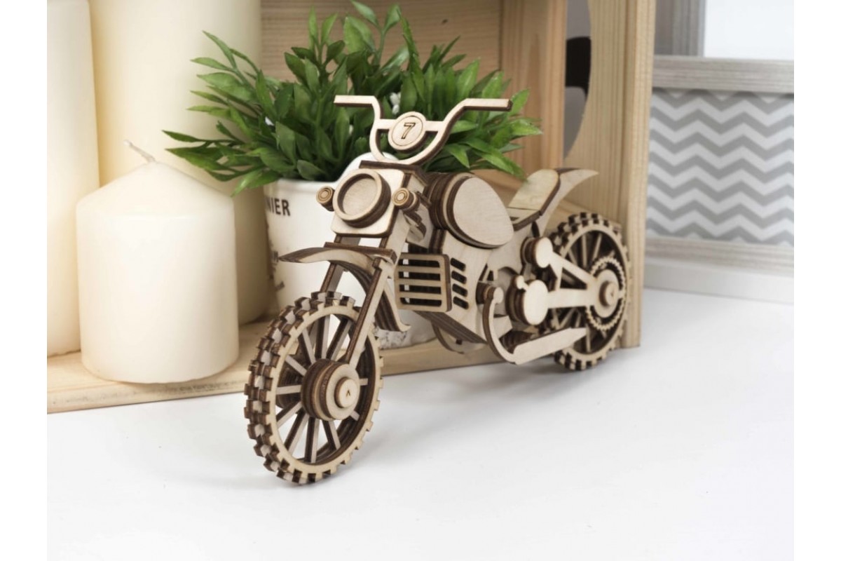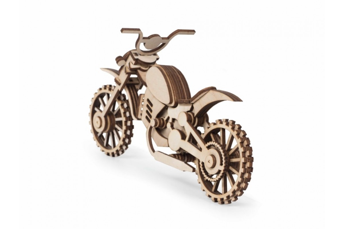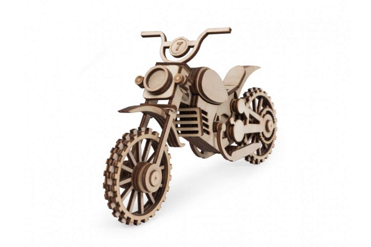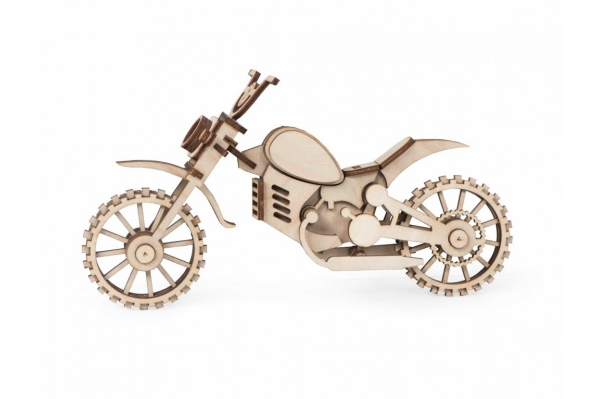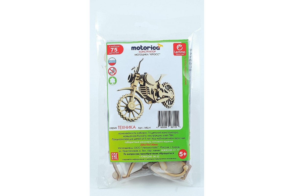 Набор «Мотоцикл Кросс» рекомендуется детям от 5 лет. У собранной модели крутятся колеса и руль.