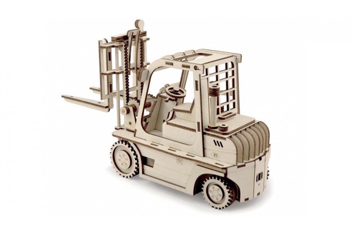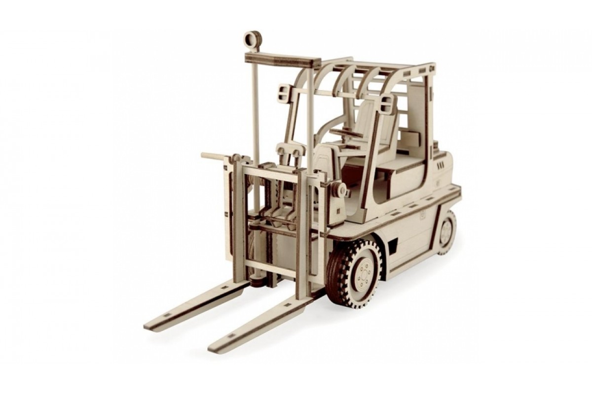 У собранного погрузчика хорошо крутятся колеса, и он ездит по любой поверхности, а еще у него откидываются дверцы кабины и может подниматься и опускаться грузовая платформа.