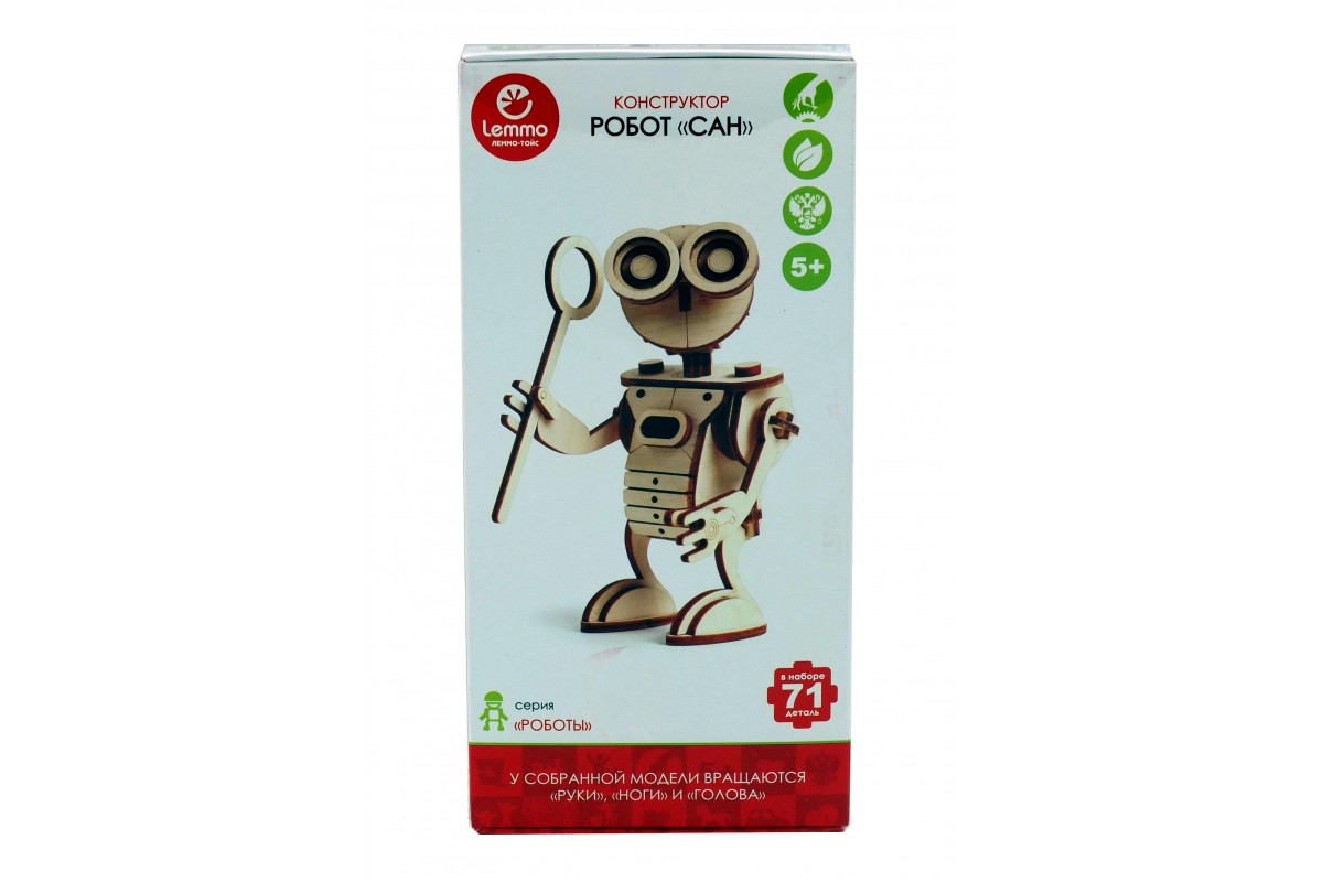 Набор «Робот Сан» рекомендован для детей от 5 лет. После сборки получается симпатичный робот, у которого опускаются и поднимаются руки и голова двигается вверх-вниз.