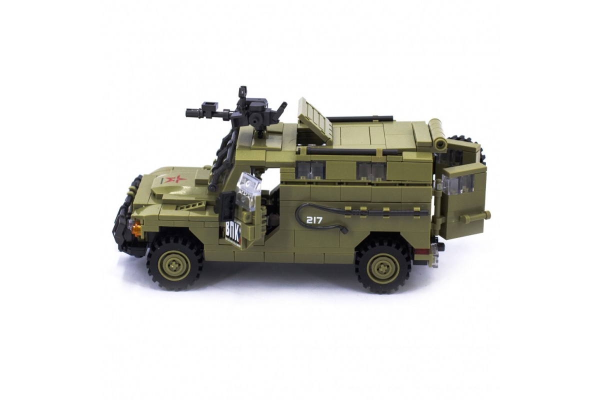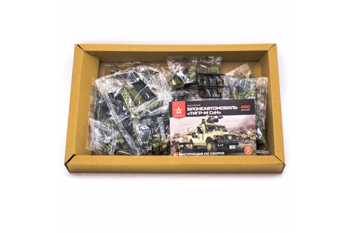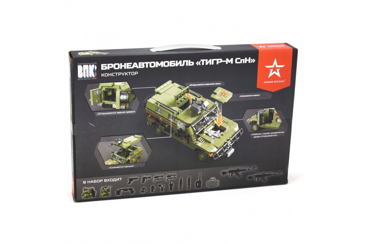 В состав конструктора входят прочные пластиковые детали для сборки высоко реалистичной копии бронеавтомобиля "Тигр-М СпН". Данную модель не только интересно собирать и играть, но и даже просто рассматривать. У бронеавтомобиля вращается установленный на крышу пулемет, открываются боковые и задняя двери, верхний люк.