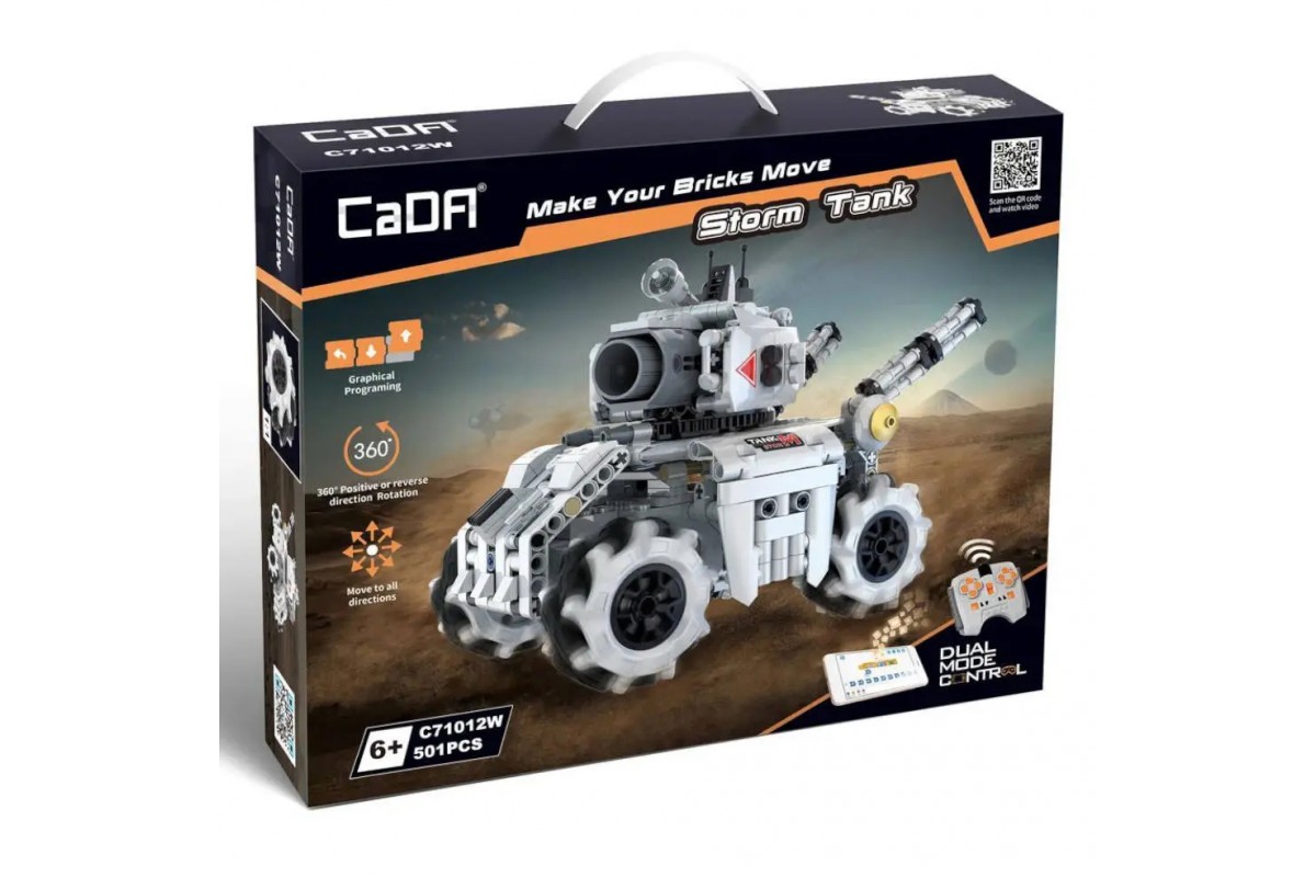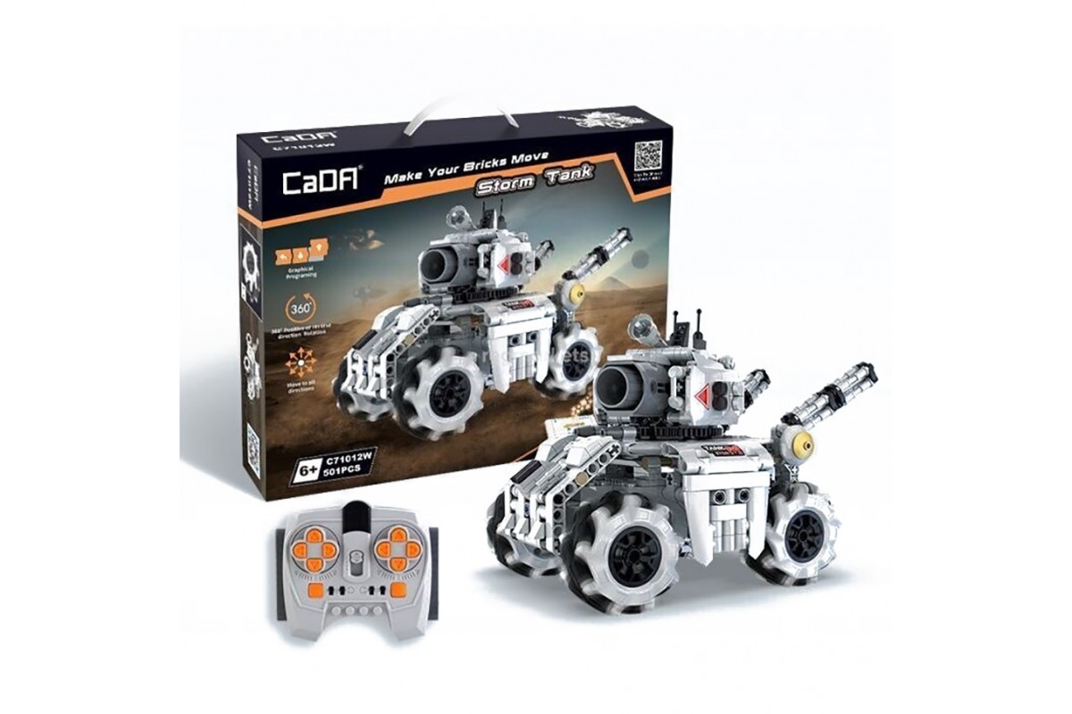 Конструктор Cada Программируемый Танк Шторм (501 деталей, пульт, электропривод) - C71012W - это радиоуправляемый конструктор Cada deTech Программируемый Танк Шторм с пультом управления 2.4GHz. В набор входят элементы для сборки радиоуправляемого танка и сам пульт. В приложении вы можете запрограммировать танк, задавая ему последовательность движений. Помимо деталей корпуса и колес, в комплект входят 2 электродвигателя и приемник, батарейный отсек.