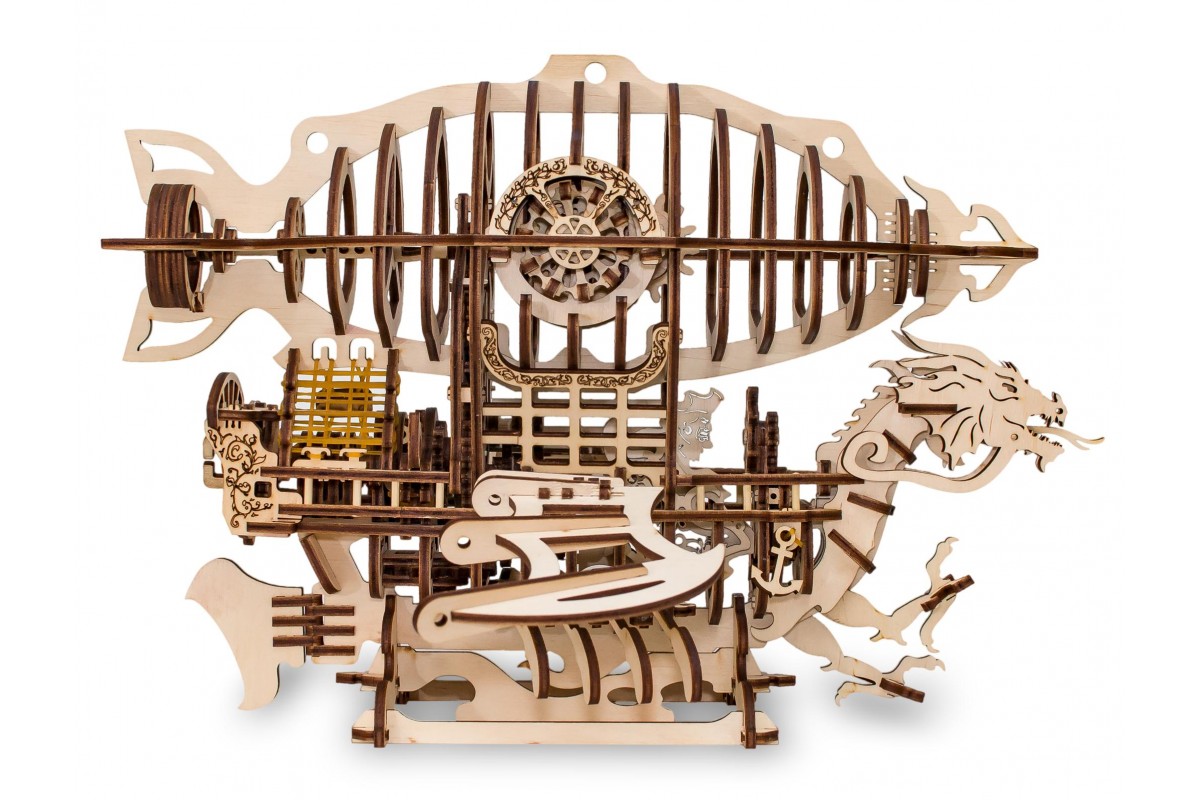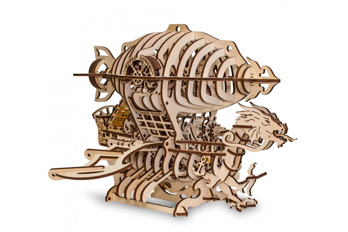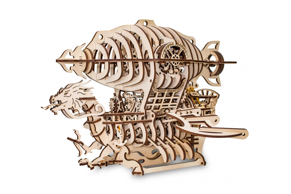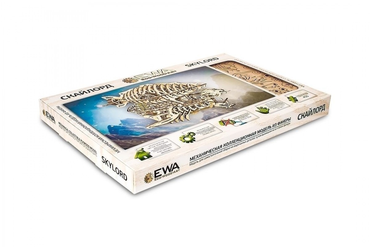 Механический конструктор - дирижабль SKYLORD EWA. Модель оснащена резиномотором, при помощи которого приводится в движение воздушный винт и обеспечивается синхронное движение вёсел. Трехмерный дракон на носу и художественная проработка деталей воздушного корабля усиливают эффектность модели, а сложный и миниатюрный механизм вызывает особый интерес. Собранная модель позиционируется как настольный вариант на подставке и приспособлена для подвешивания.