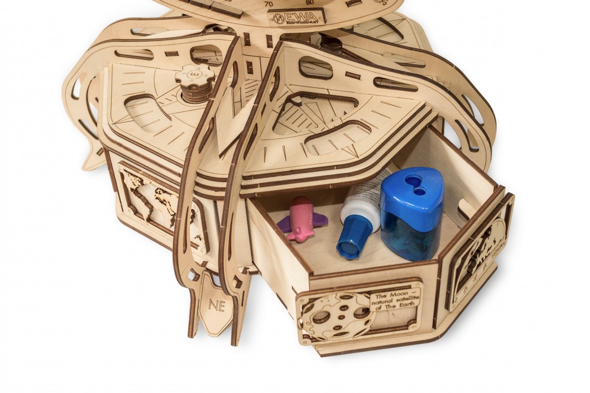 Стороны света, роза ветров, градуированная подставка, основные характеристики планеты – нанесены на элементы конструкции. Глобус оборудован секретной нишей. При вращении определенных шестерен открывается доступ к механическому элементу внутри конструкции, который при нажатии дает возможность выдвинуть потайное отделение. Размер потайного отделения: 210*140*65 мм.