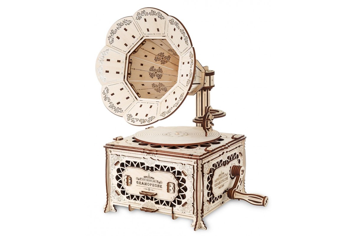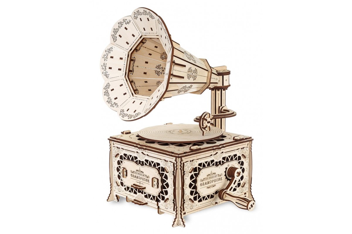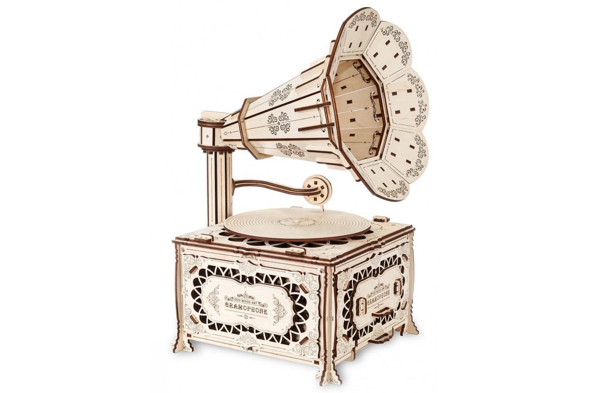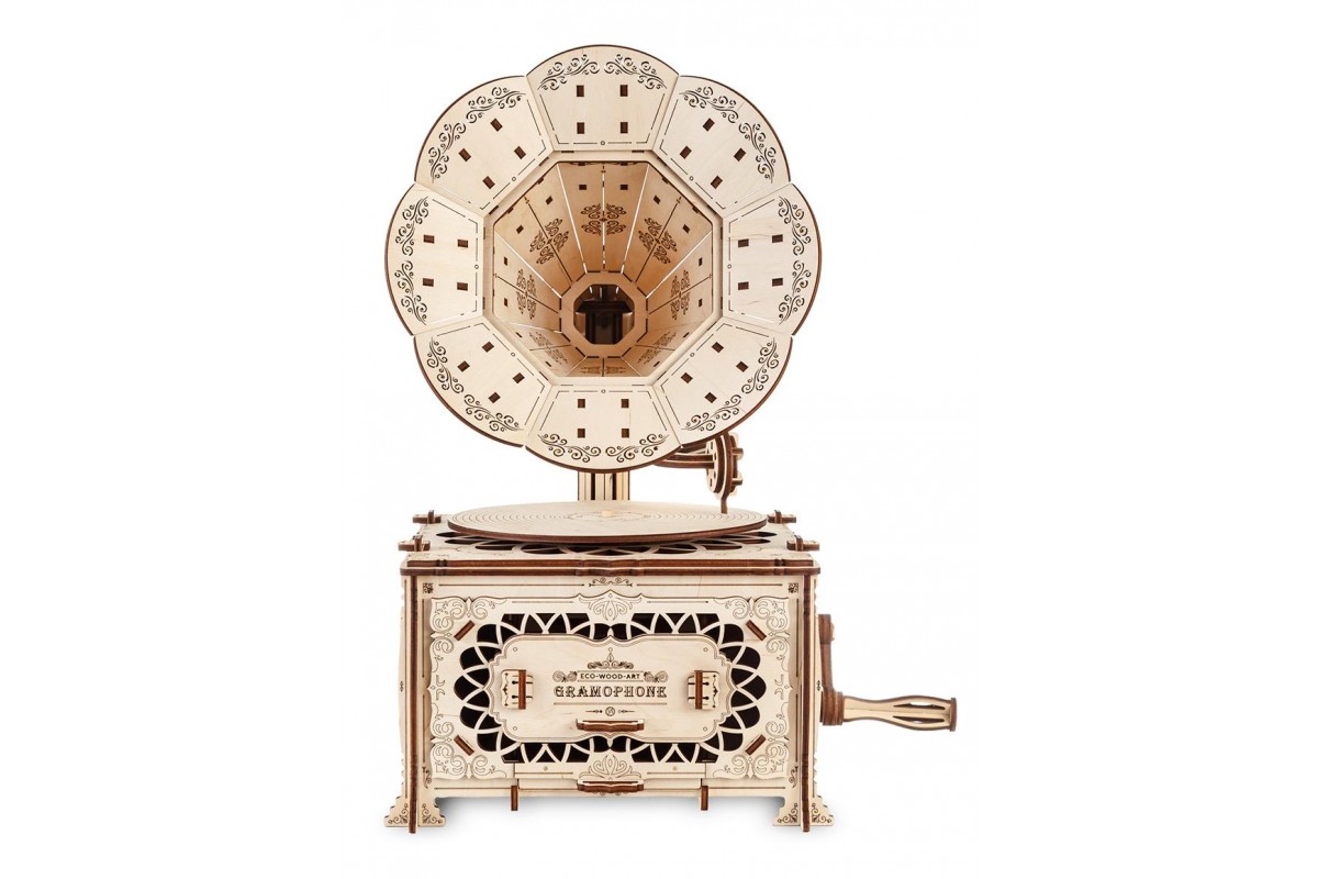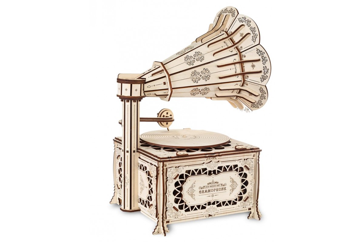 Механическая сборная модель антикварного музыкального аппарата для виниловых пластинок из экологичных материалов.