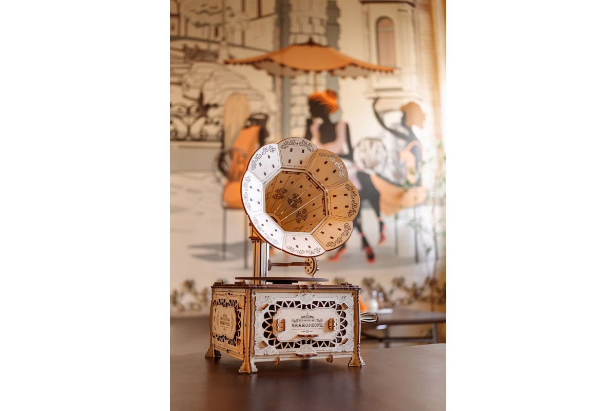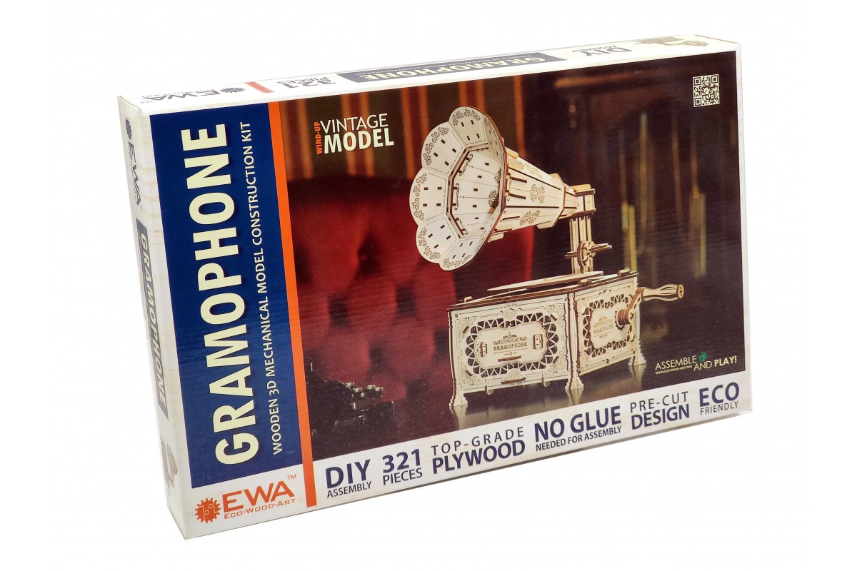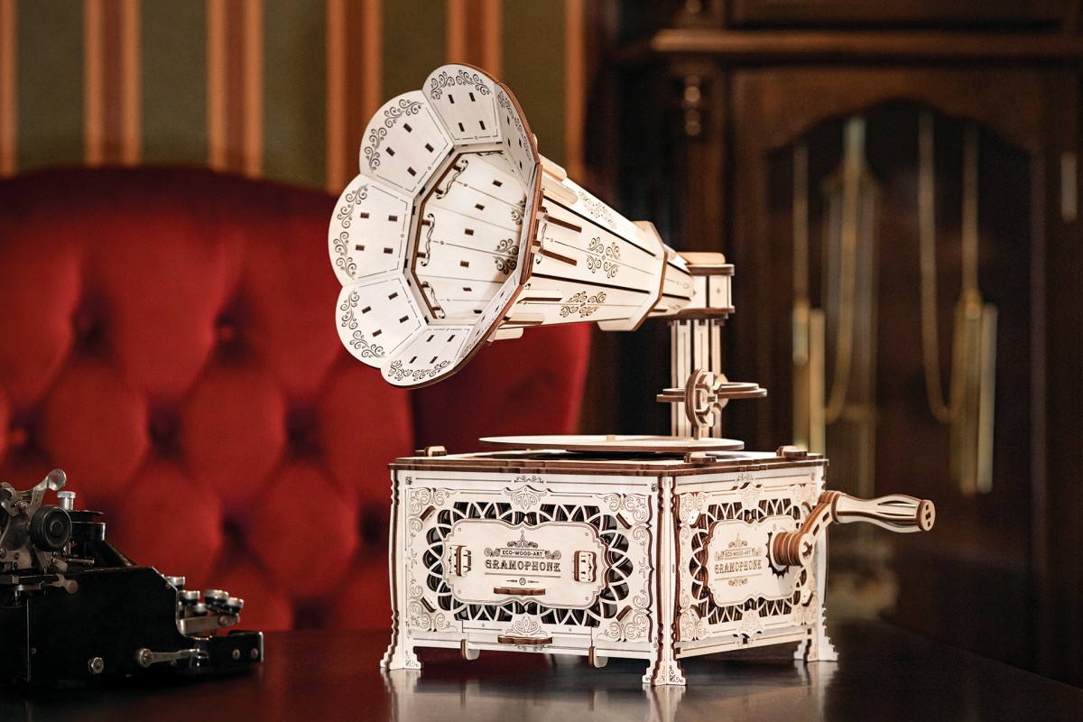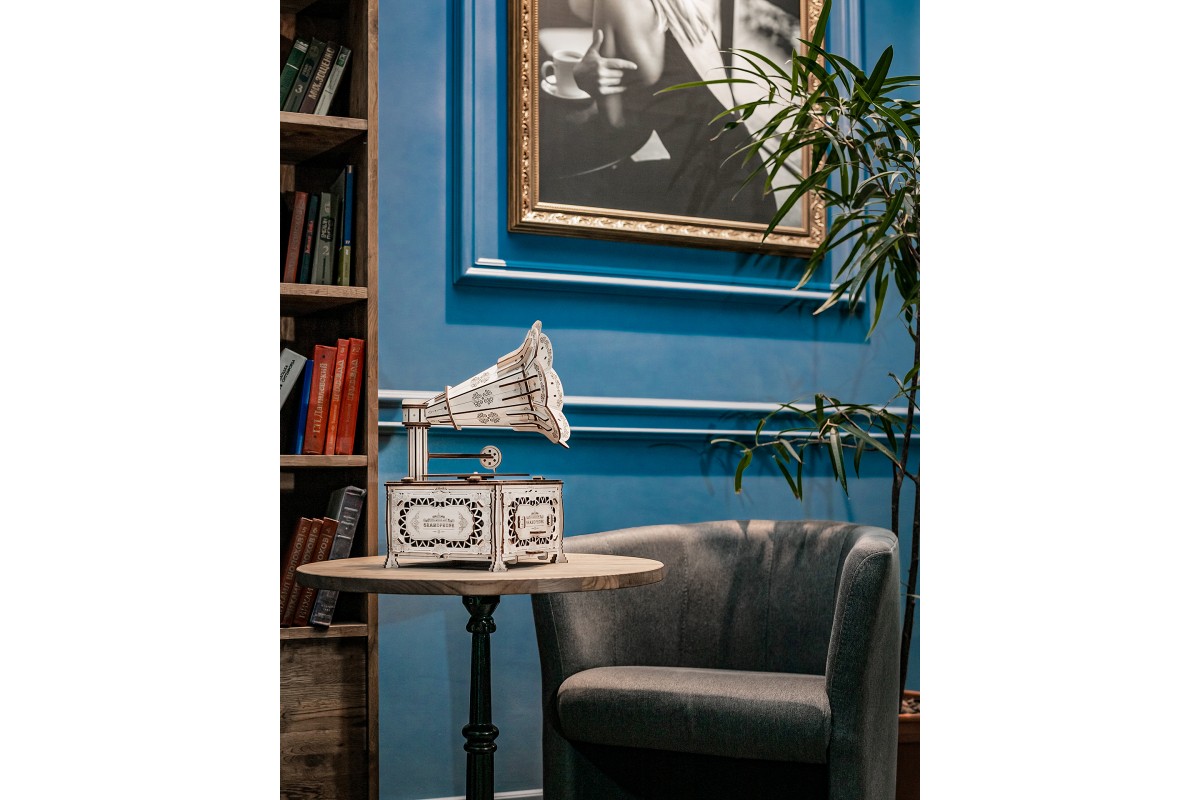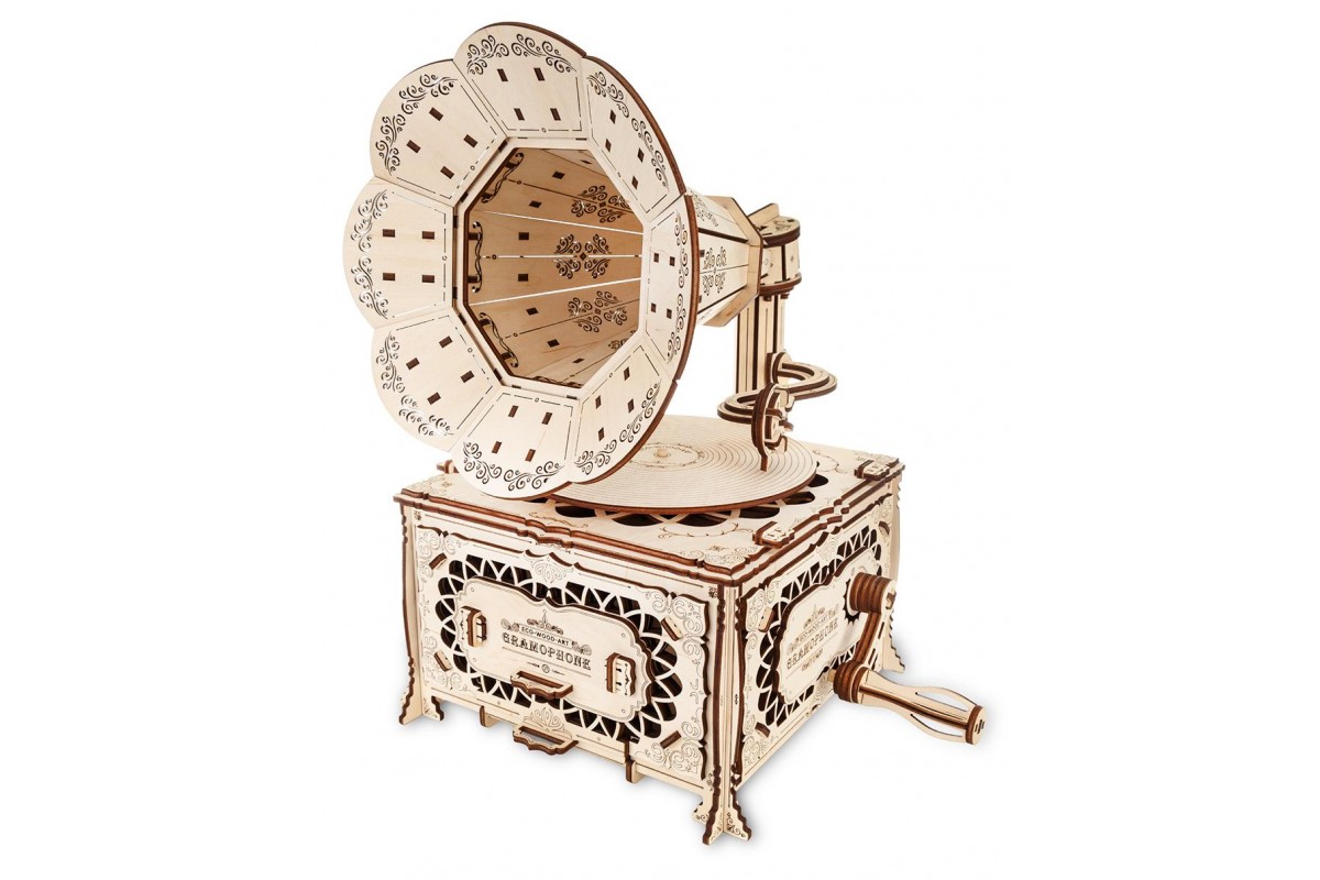 Механическая сборная модель антикварного музыкального аппарата для виниловых пластинок из экологичных материалов.