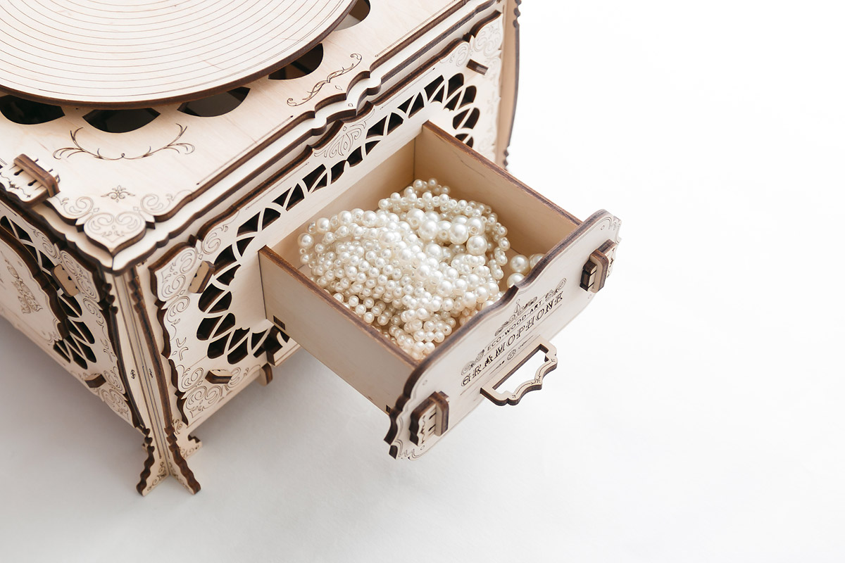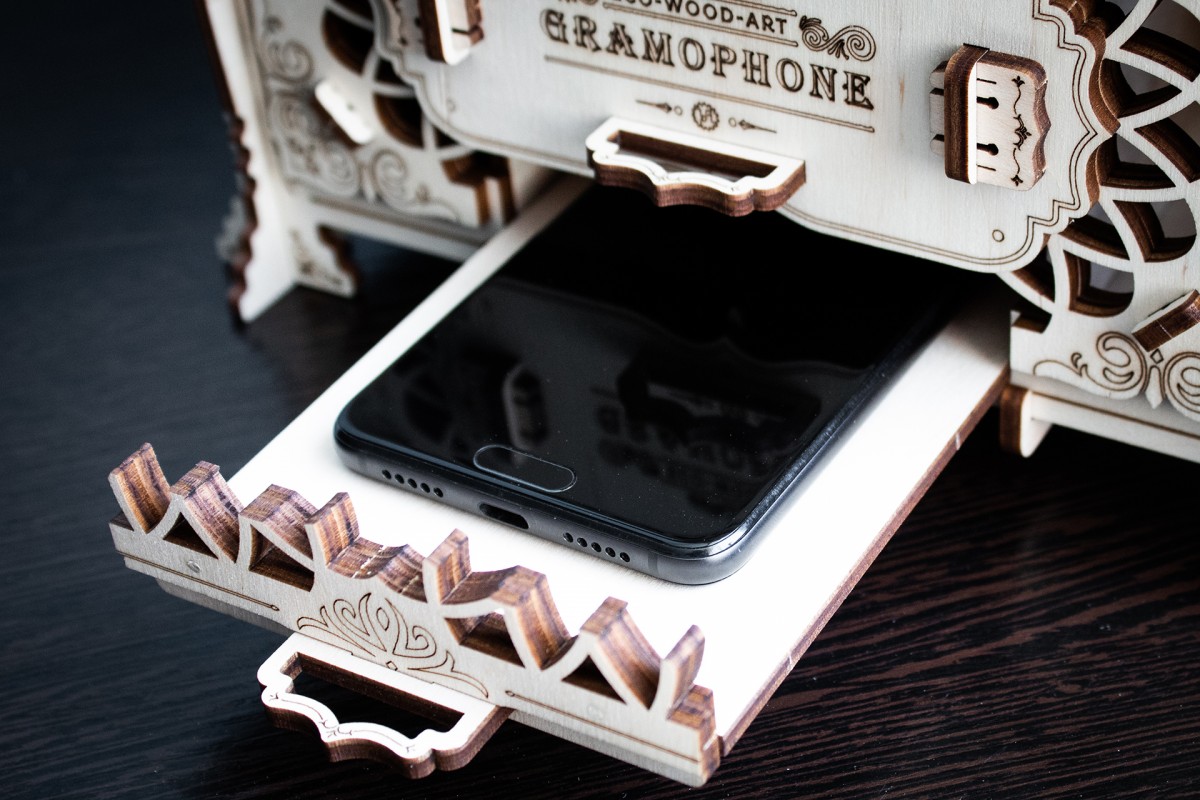В конструкторе также есть шкатулка для мелочей и специальная полочка для смартфона, на котором вы можете включить любимую мелодию и начать романтично крутить ручку граммофона.