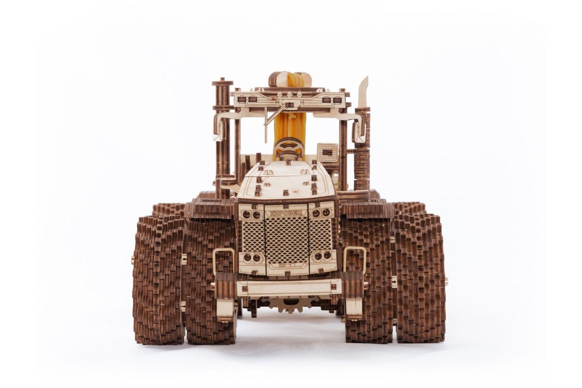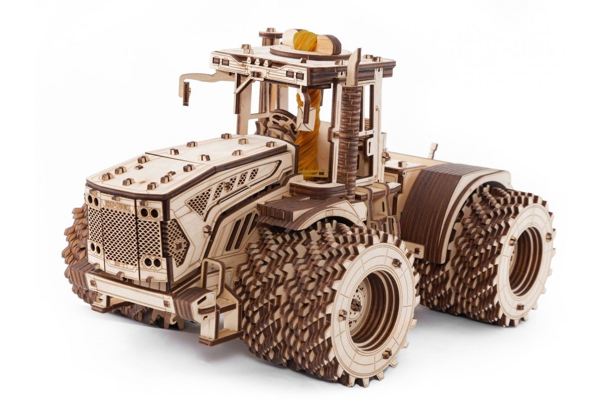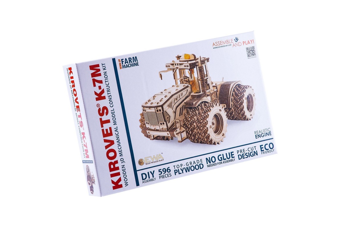 Деревянный конструктор и сборная модель механическая с мотором Трактор Кировец К-7М EWA Eco-Wood-Art. Модель Трактор имеет резиномотор, с помощью которого машина может двигаться вперед и назад, также имеет нейтральный режим и систему Старт-Стоп. Вы можете поднять капот и увидите двигатель как настоящий с шестью цилиндрами. Двери могут открываться и закрываться. Модель Трактор Кировец К-7М - это копия настоящего трактора. Идеально исполнена для вас.