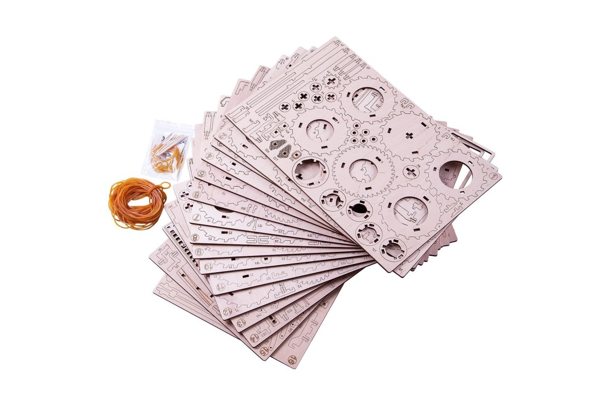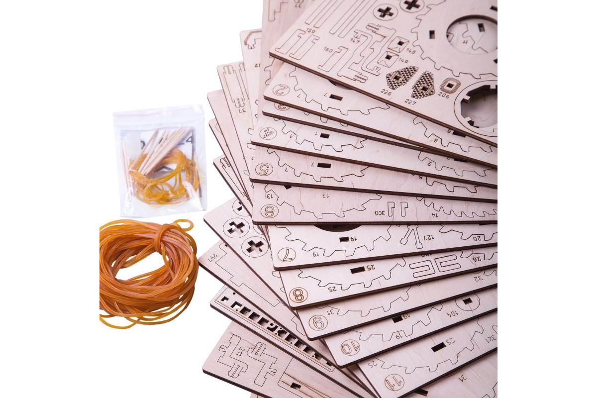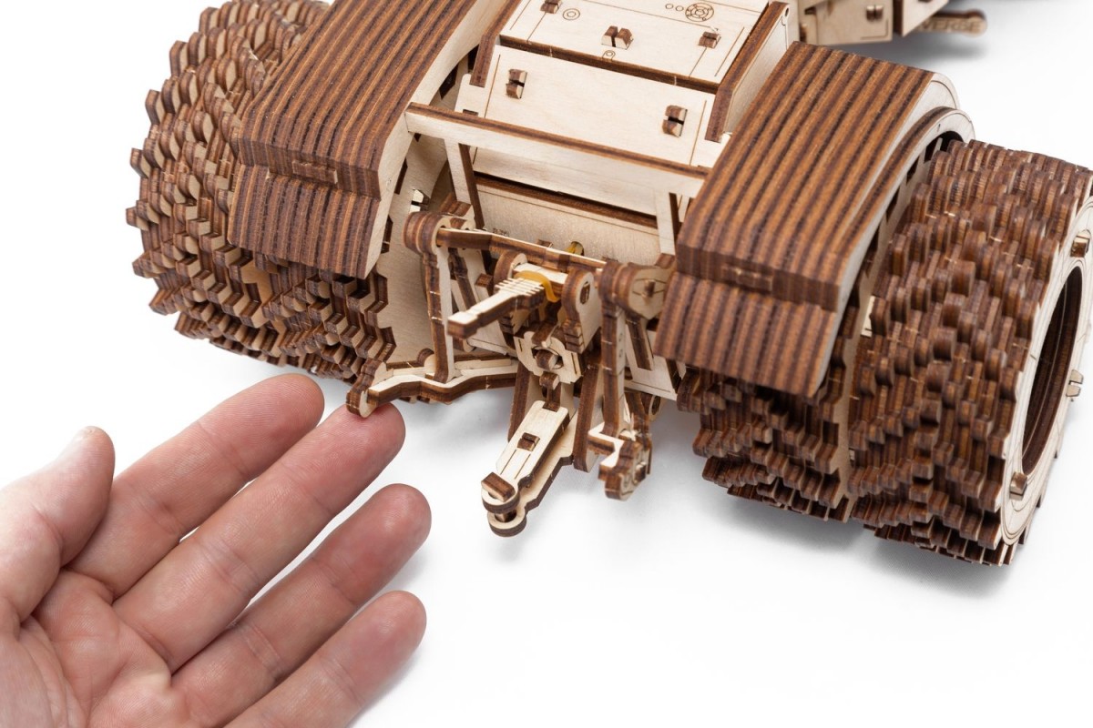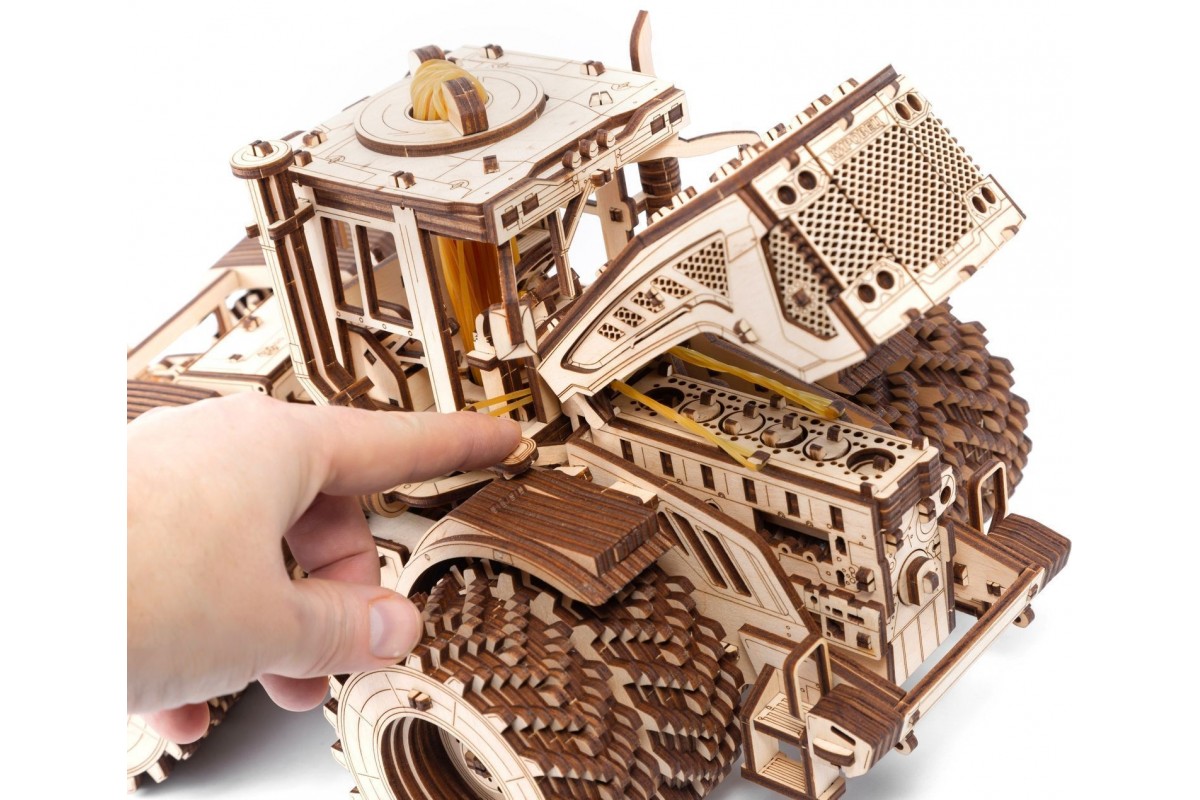 Деревянный конструктор и сборная модель механическая с мотором Трактор Кировец К-7М EWA Eco-Wood-Art. Модель Трактор имеет резиномотор, с помощью которого машина может двигаться вперед и назад, также имеет нейтральный режим и систему Старт-Стоп. Вы можете поднять капот и увидите двигатель как настоящий с шестью цилиндрами. Двери могут открываться и закрываться. Модель Трактор Кировец К-7М - это копия настоящего трактора. Идеально исполнена для вас.