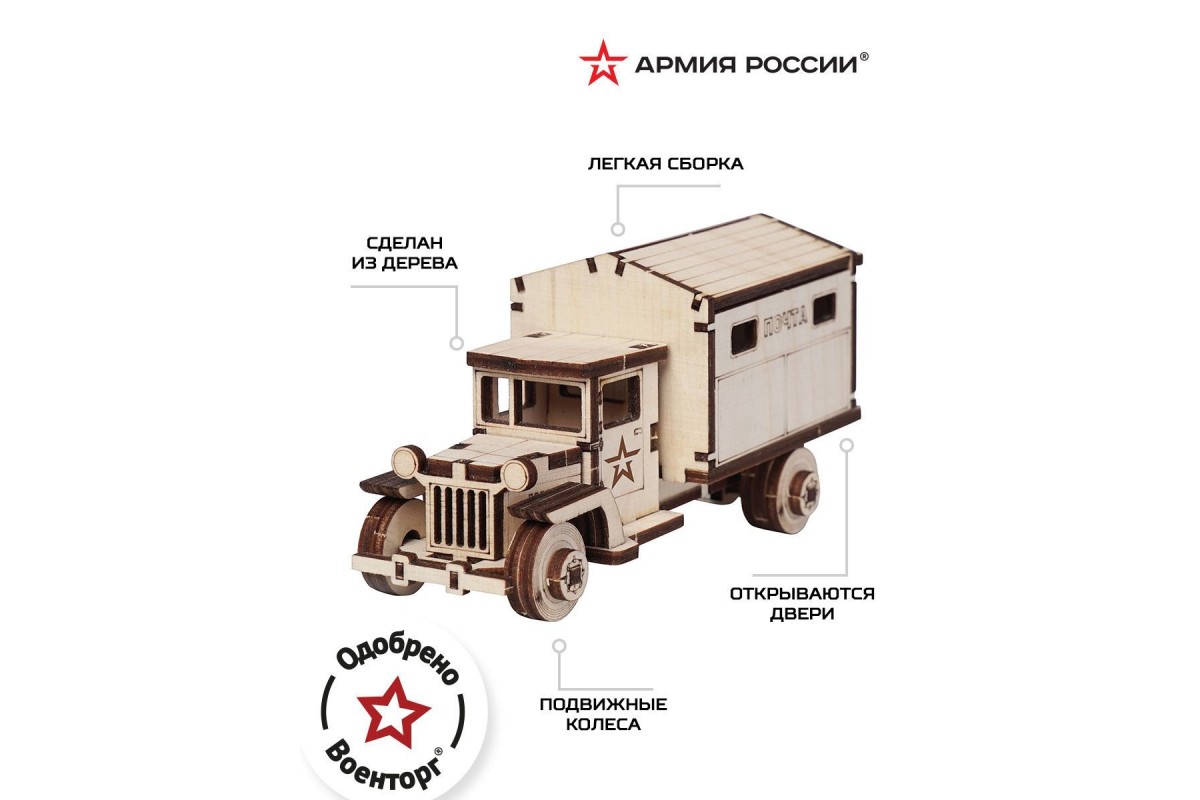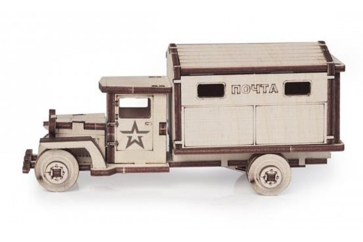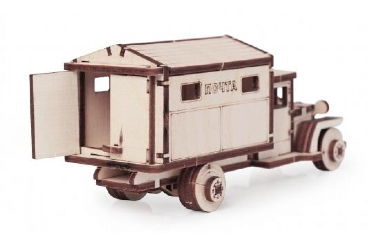 Набор Советский грузовик ЗИС-5 Почта подходит для ребенка от 5 лет. У собранной модели вращаются колеса.