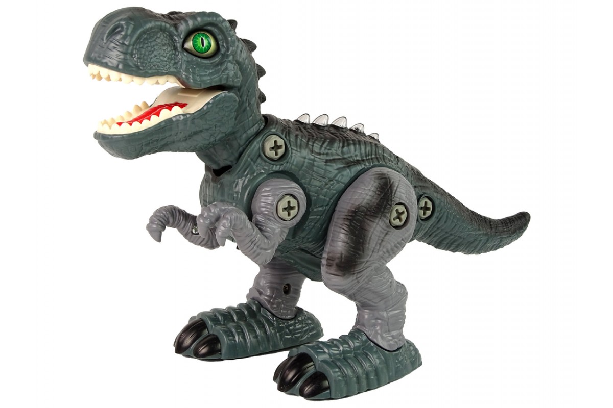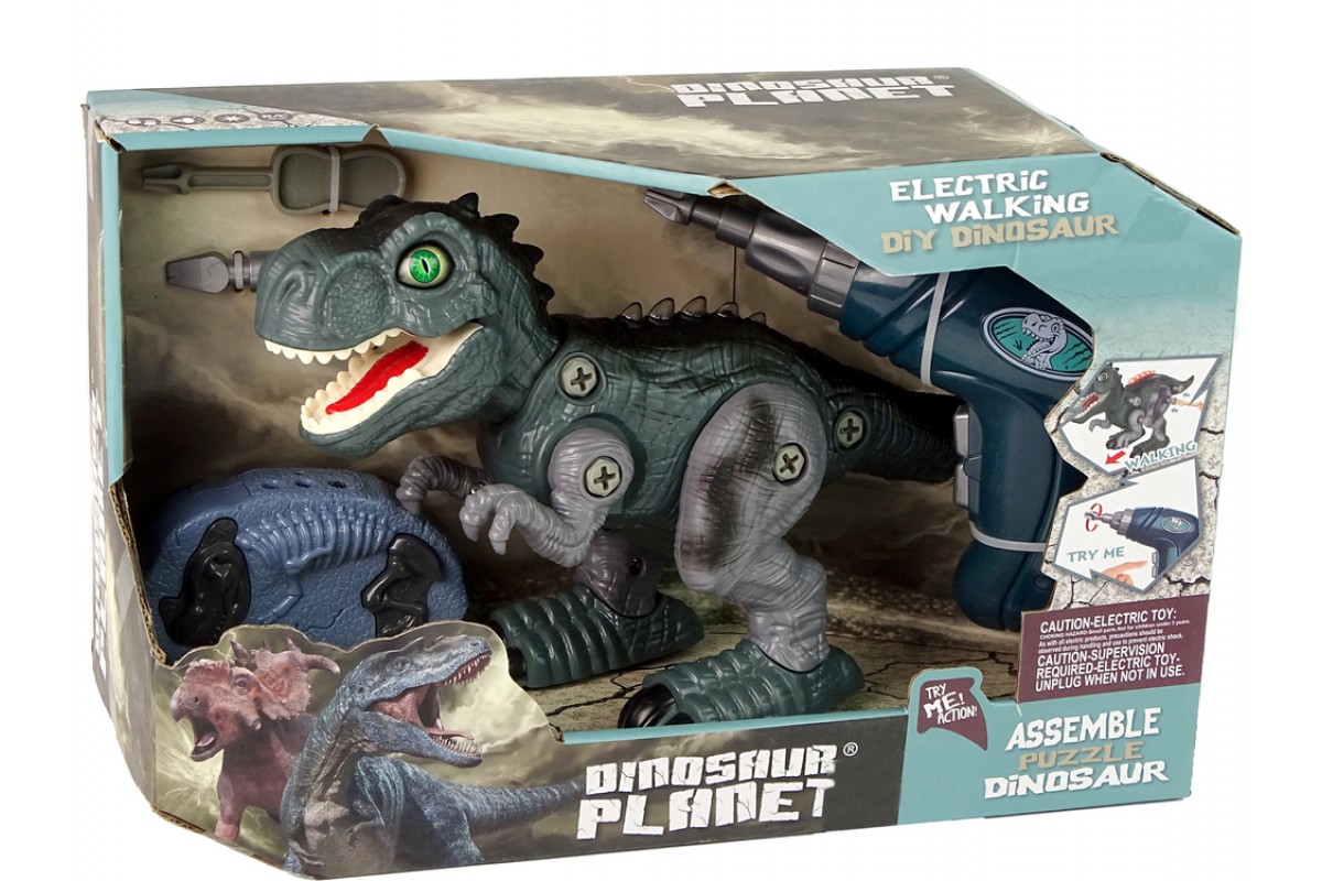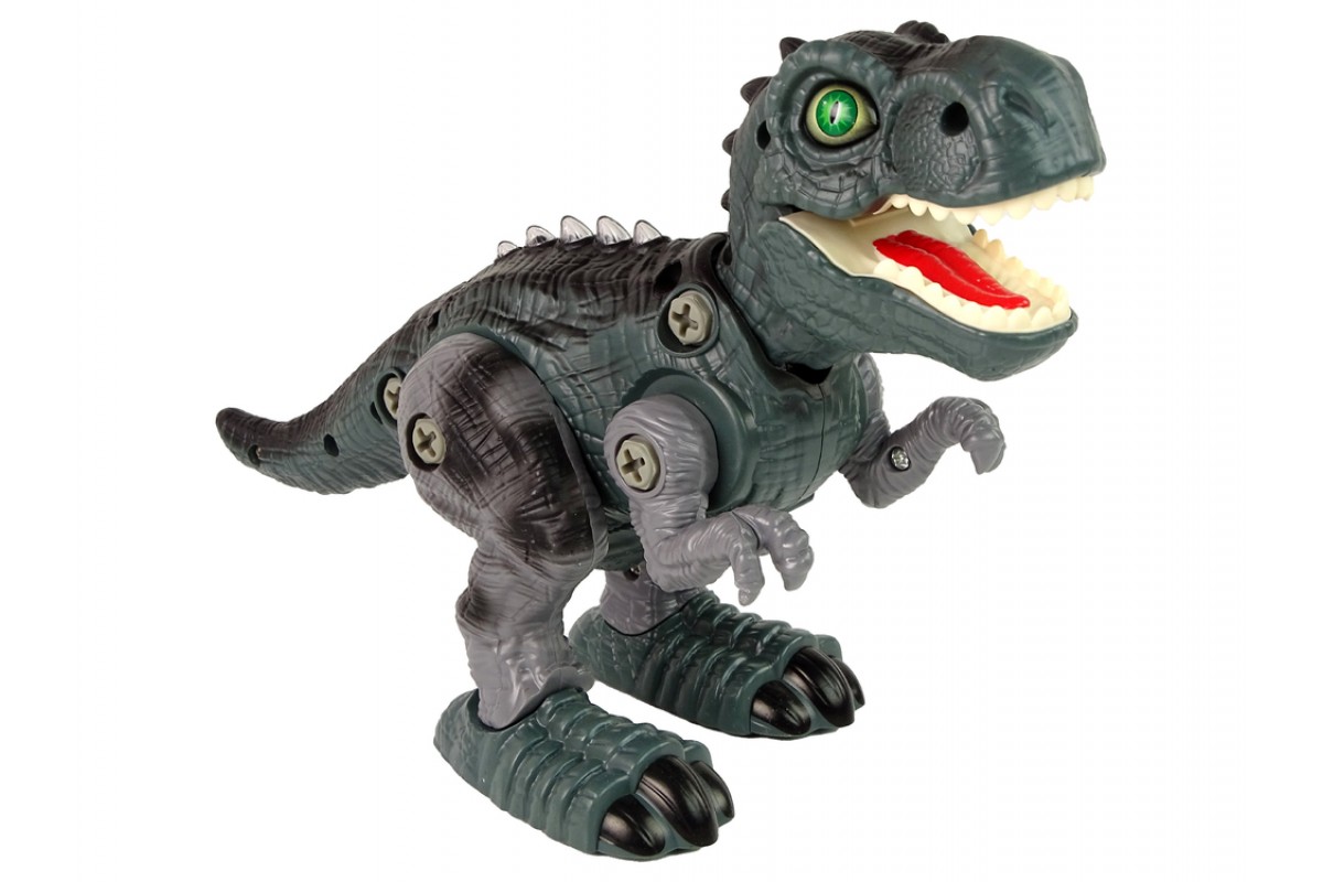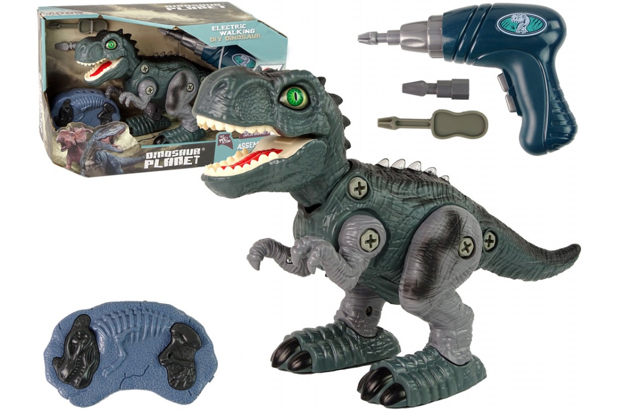 Перед вами динозавр-конструктор на радиоуправлении: Тираннозавр, который приводится в движение благодаря пульту управления. Пульт простой и понятный, на нем есть всего 2 кнопки, одна отвечает за движение вперёд, другая - за звуковые эффекты. Во время движения динозавр грозно рычит. Еще одно важное преимущество - наличие шуруповерта. Используя функциональный шуруповерт и сменные насадки, у вас получится соединить все детали при помощи винтов и получить готовую модель динозавра или разобрать его.