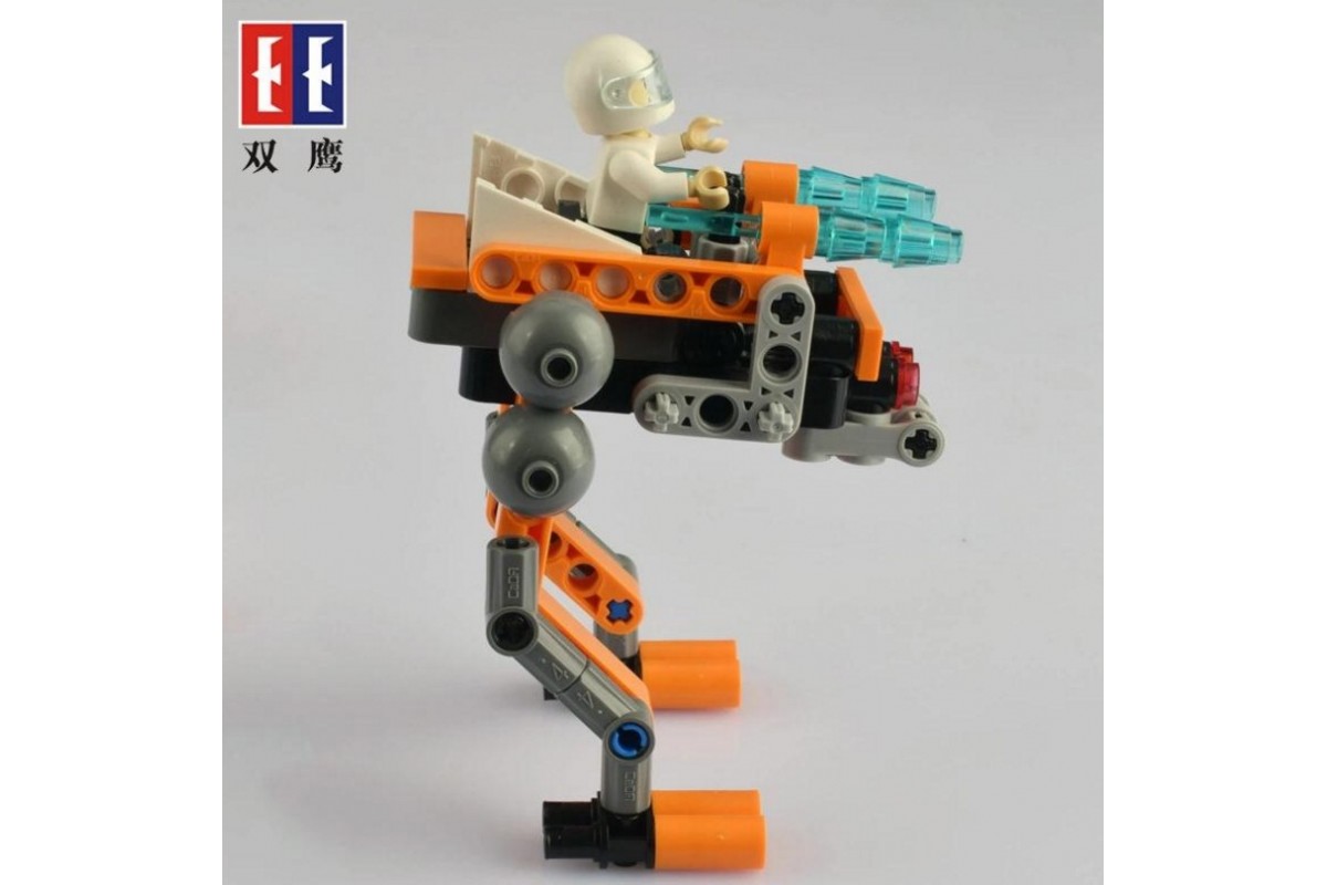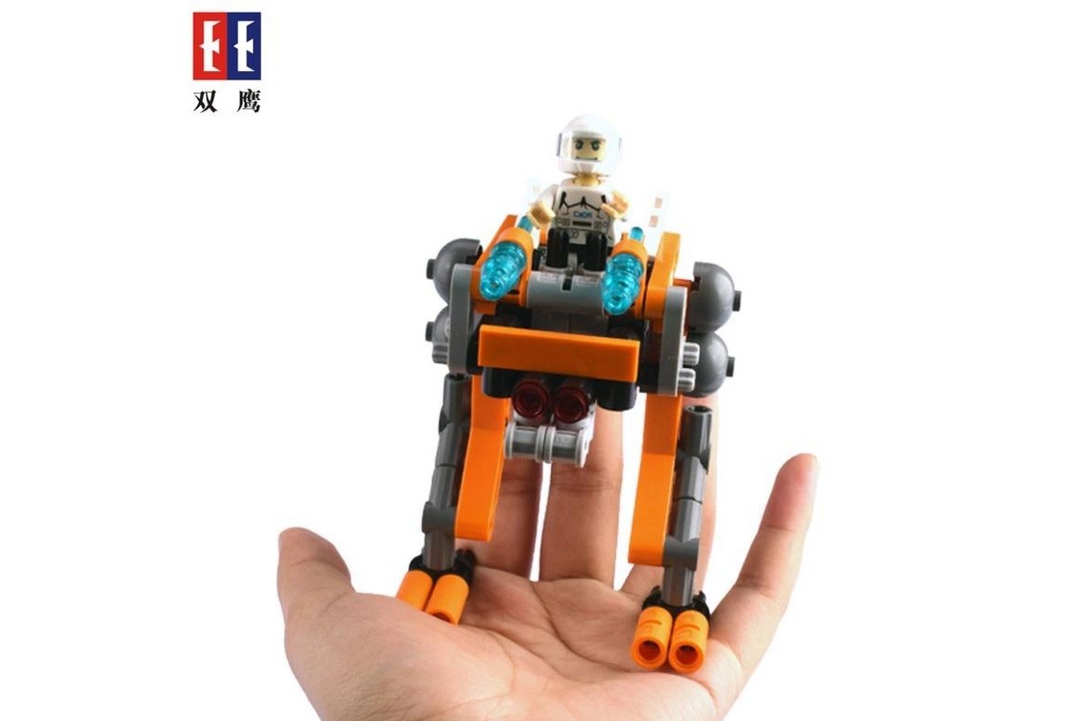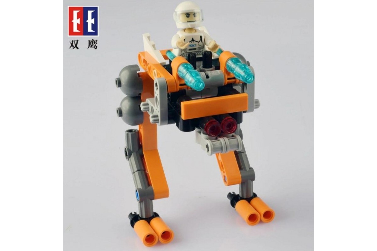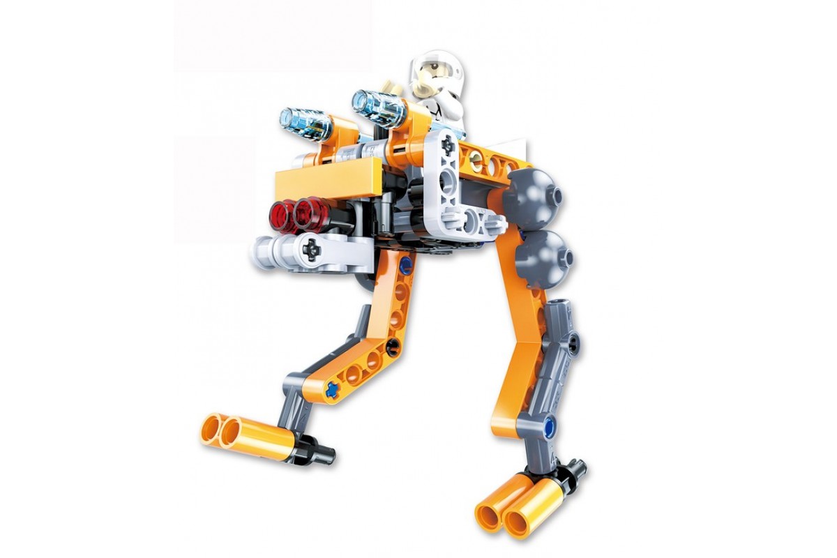 Количество деталей в этом наборе –103. В собранном виде конструктор превращается в боевой космический дрон – машину, которая способна смело шагать по поверхности другой планеты, высматривать противника и отстреливаться снарядами. На вершине дрона, за пультом управления, сидит оператор этого космического вездехода. Его фигурку вы найдёте в коробке вместе с конструктором.