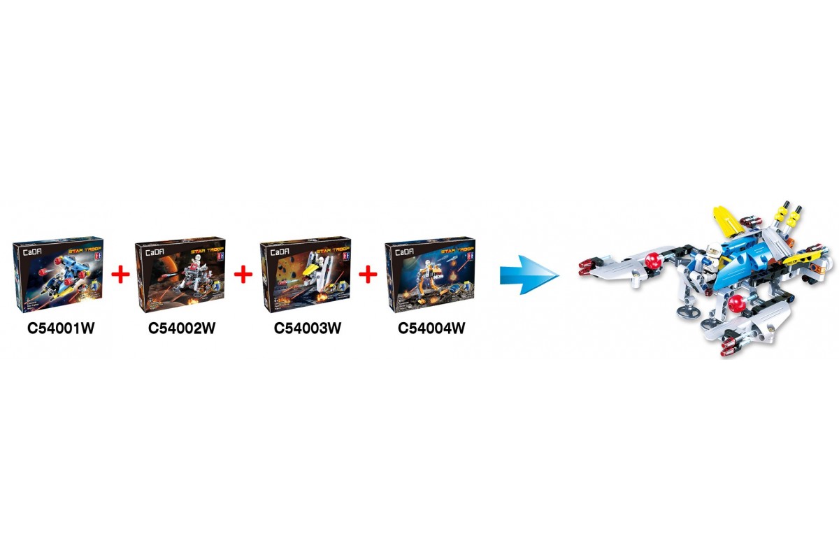 В линейке CaDa Technic есть ещё три конструктора, которые входят в серию космического десанта. Имея их все, можно не только стать обладателем межгалактического автопарка, но и сконструировать большую сложную модель космического корабля. В большую модель собираются конструкторы C54001W, C54002W, C54003W и C54004W.