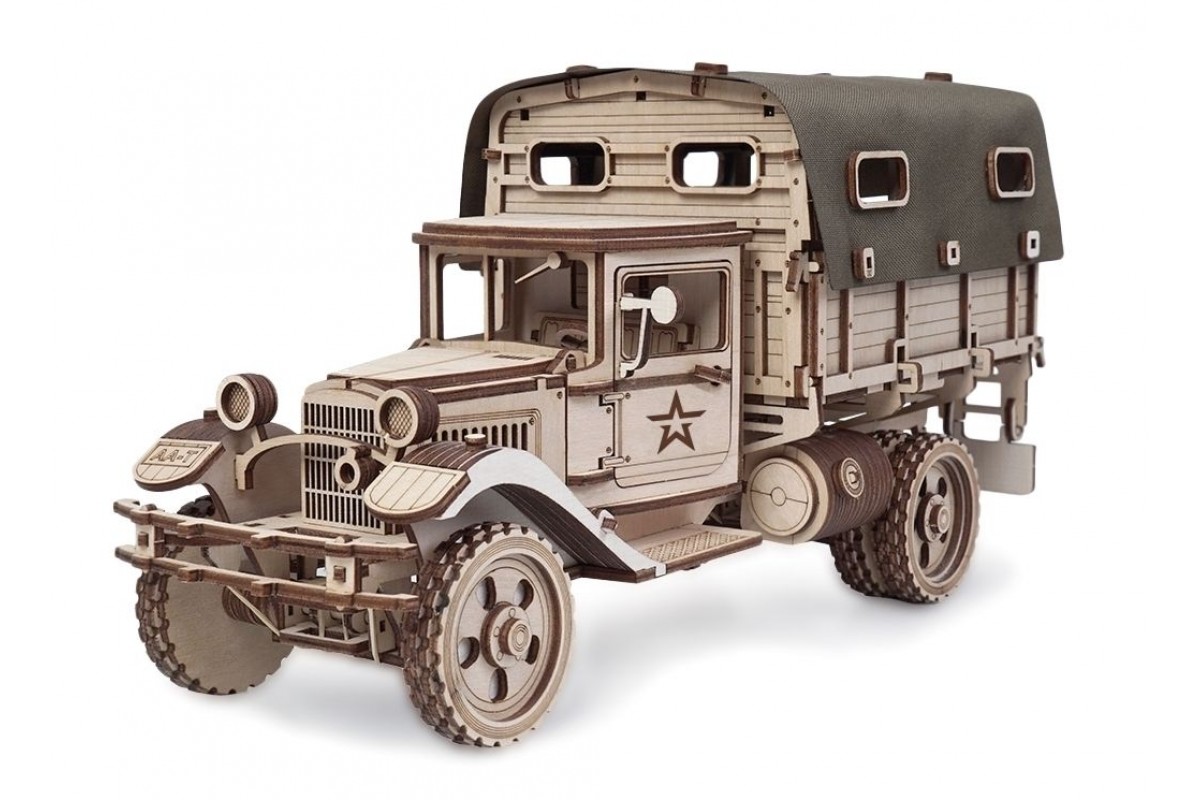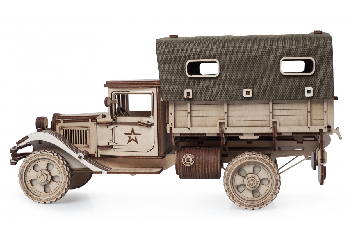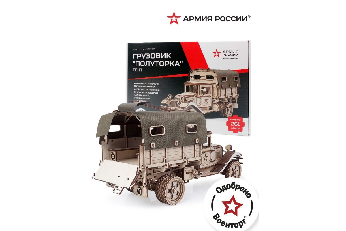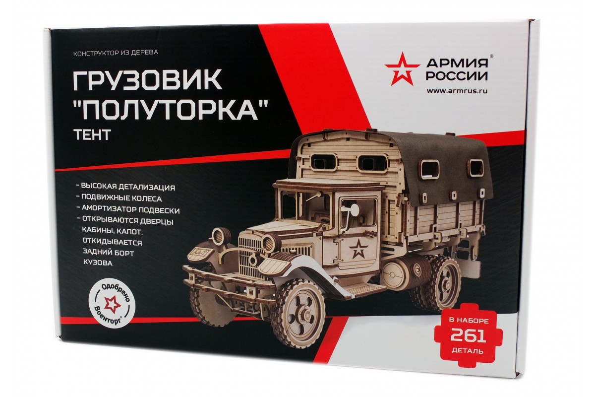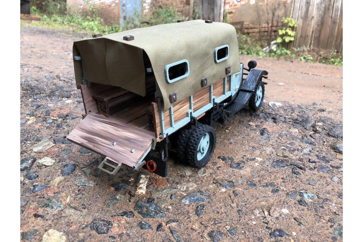 Новая серия "Полуторка" пополнилась очередной моделью. Грузовик с тентом собирается с минимальным использованием клея. Собранная модель имеет большой масштаб и крутой нрав. Открывается все, что может открываться. Может ехать и имеет амортизацию переднего моста. Тент входит в набор. У модели вращаются колеса, открываются дверцы кабины, капот, откидывается задний борт кузова. Подвеска с амортизацией.