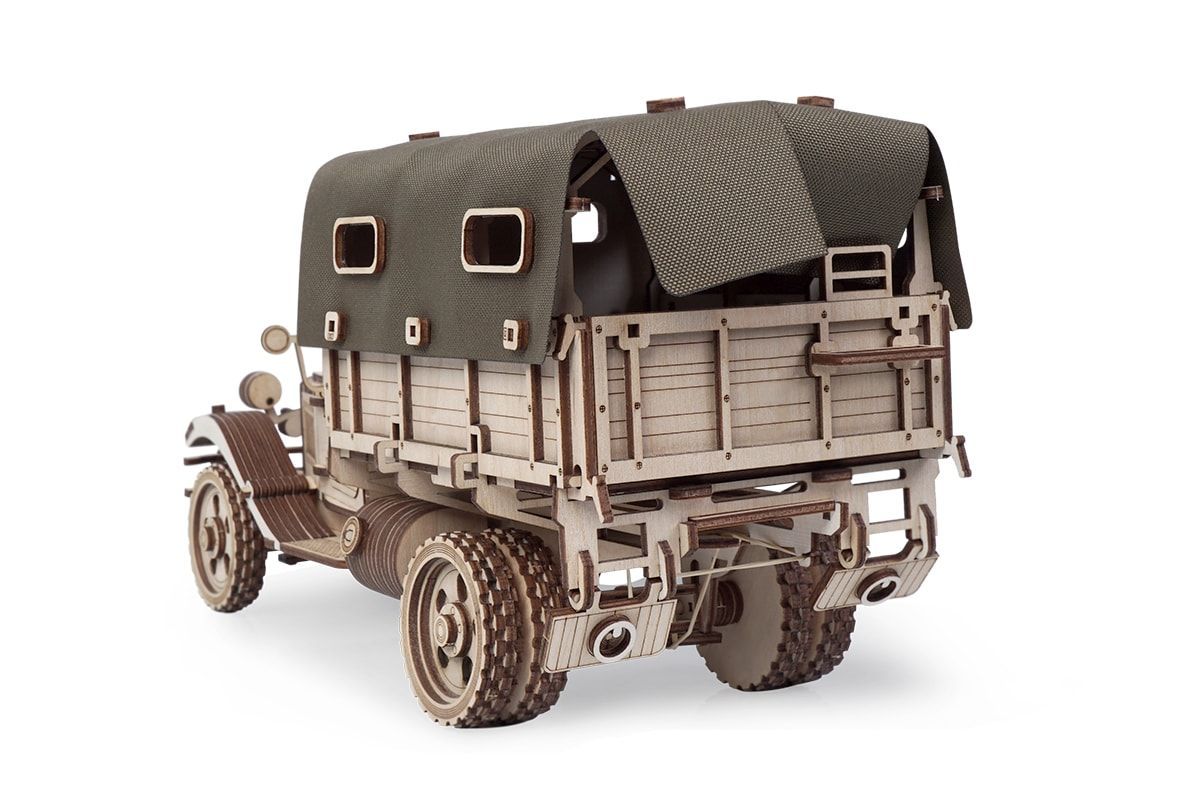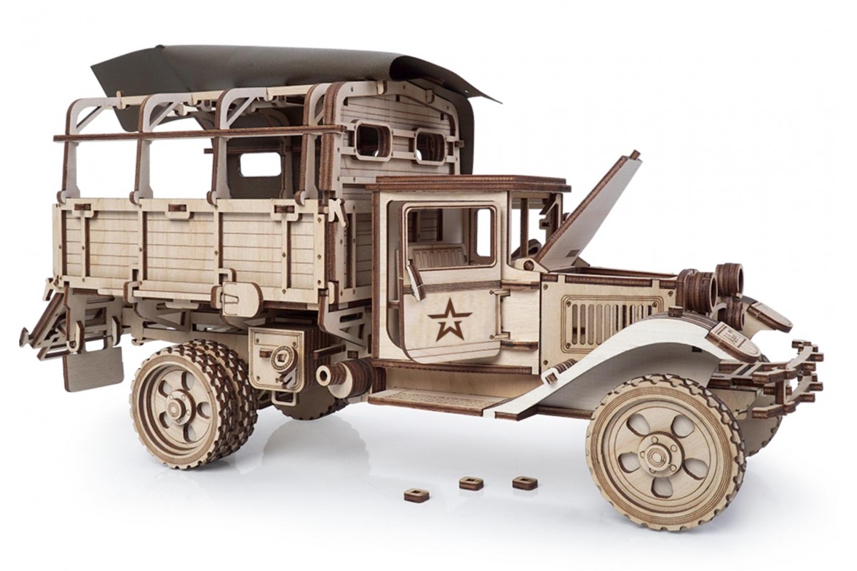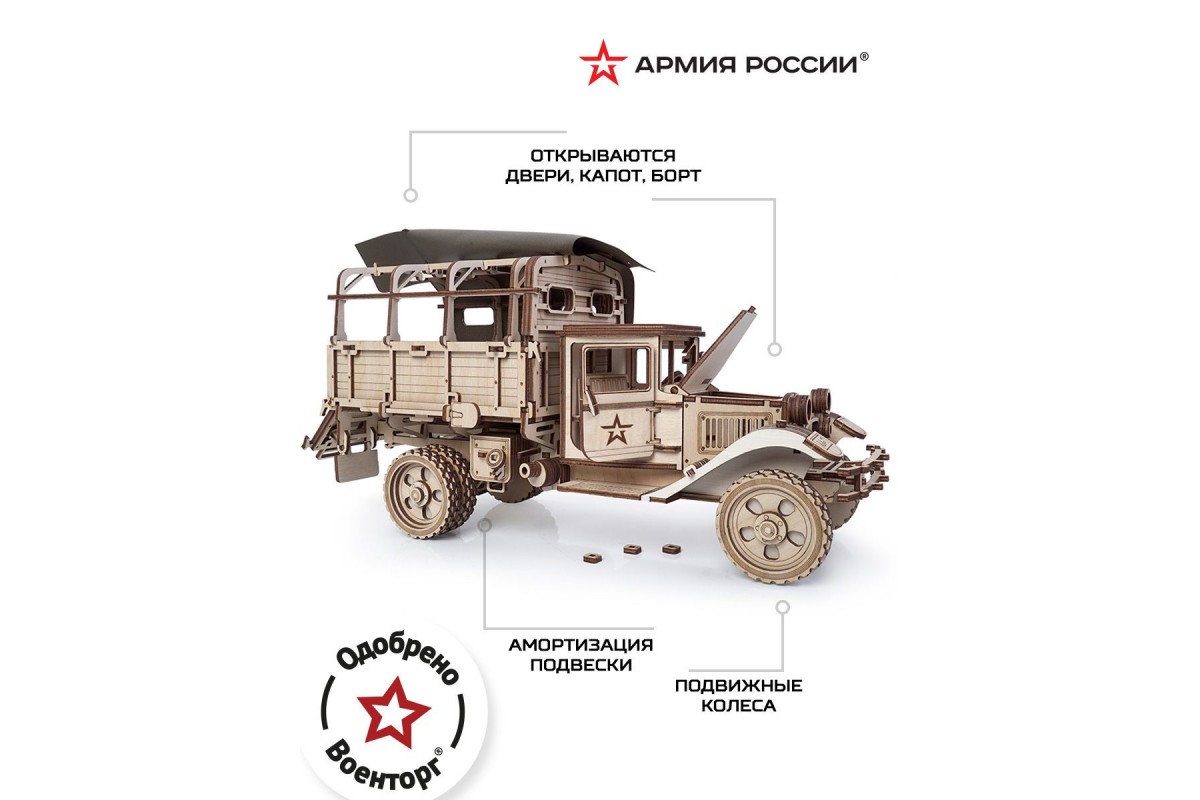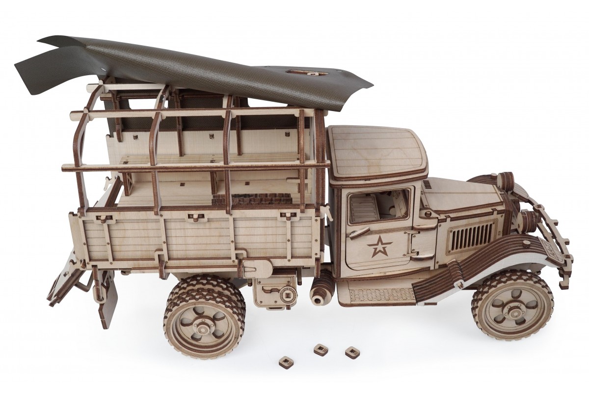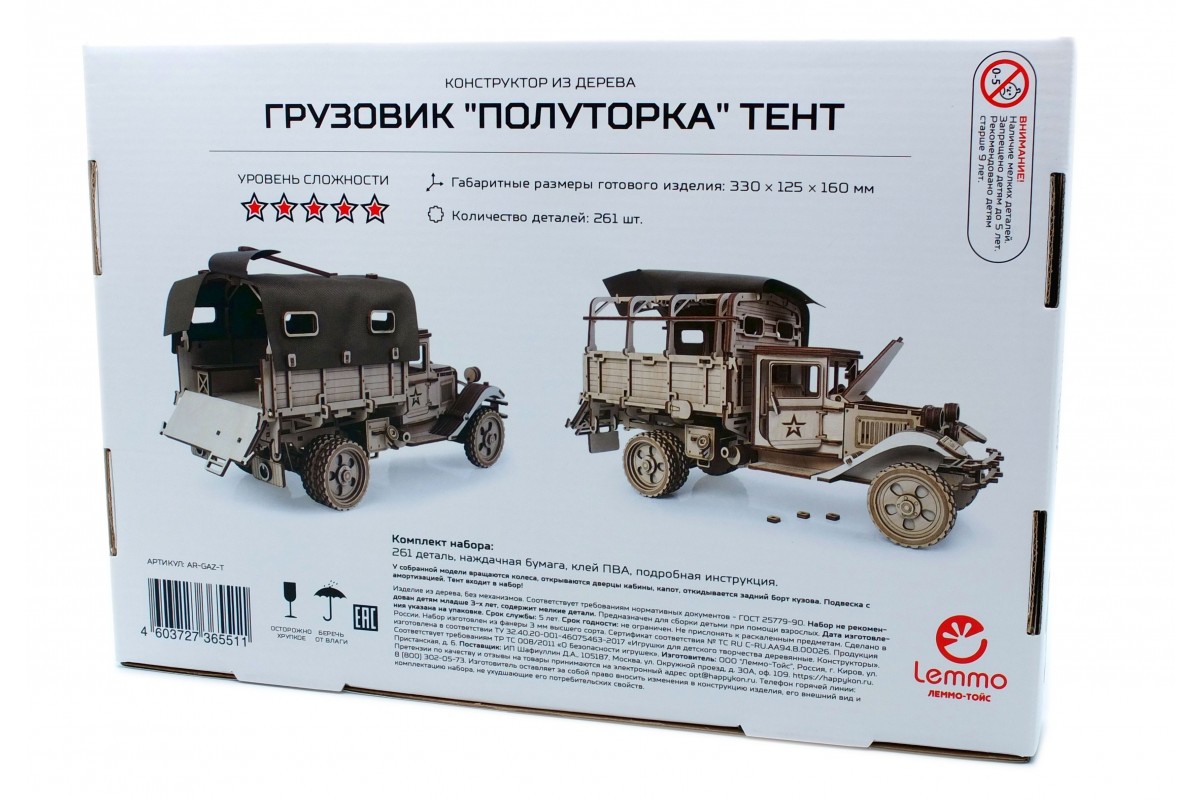 Новая серия "Полуторка" пополнилась очередной моделью. Грузовик с тентом собирается с минимальным использованием клея. Собранная модель имеет большой масштаб и крутой нрав. Открывается все, что может открываться. Может ехать и имеет амортизацию переднего моста. Тент входит в набор. У модели вращаются колеса, открываются дверцы кабины, капот, откидывается задний борт кузова. Подвеска с амортизацией.