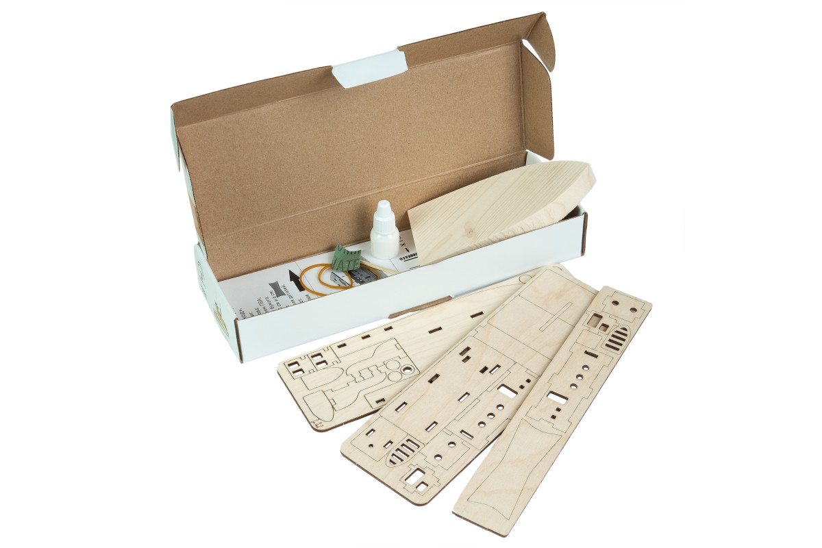 В набор входит: заготовка корпуса (ель), планшет с деталями, круглые деревянные палочки, резинка, инструкция, наждачная бумага, тюбик с клеем ПВА (водостойким).