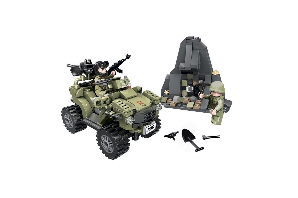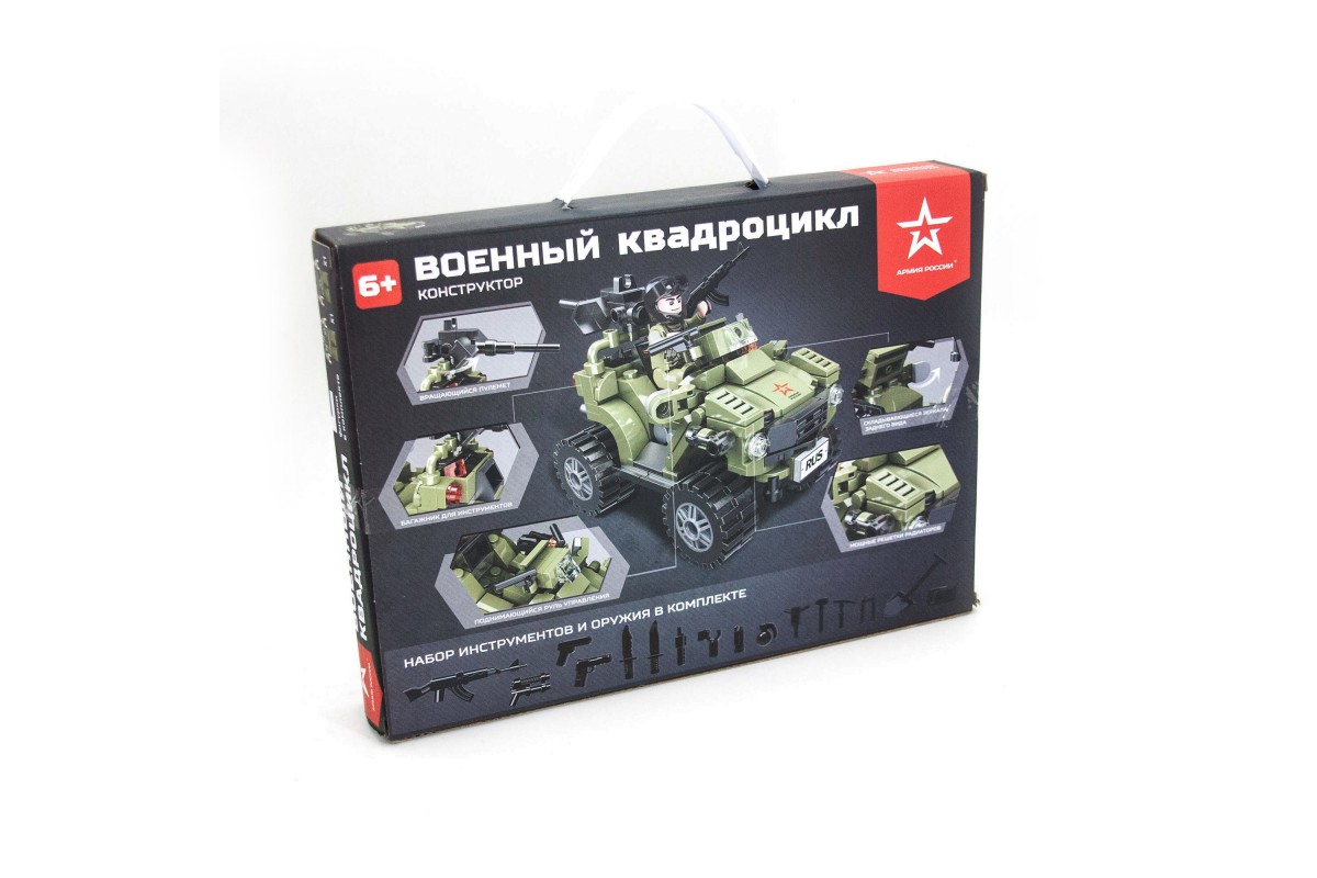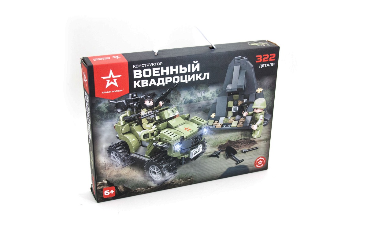 Конструктор "Военный Квадроцикл". Состоит из 322 деталей. Предназначен для детей старше 6 лет. В состав конструктора входят прочные пластиковые детали для сборки военного квадроцикла, а также входа в военный бункер, строительство которого ведет один из военнослужащих. Собранная модель квадроцикла прочно стоит на четырех колесах, это позволяет двигать ее в различных направлениях в процессе игры. Уникальность данной модели придает особый цвет и маркировка техники, а также формы мини фигурок, приближенные к реальным цветам, используемым в Российской Армии, и, кроме того, наличие мини копий автоматов и прочего снаряжения, являющихся частью экипировки солдат Российской Армии. Модель характеризует высокая детализация и точность подбора комплектующих, что делает ее максимально похожей на реально существующие модели. Данную модель будет интересно собирать как детям, так и взрослым. Конструктор является полностью Lego совместимым. Набор снабжен инструкцией по сборке, которая позволит легко собрать данную модель даже не опытному пользователю. Кубики конструктора надёжно упакованы в пакетики, что гарантирует их сохранность до начала сборки. А красивая коробка с ручкой для переноски придаёт игрушке презентабельный вид и может стать отличным подарком как для ребенка, так и для взрослого. Конструктор "Военный Квадроцикл" состоит из: