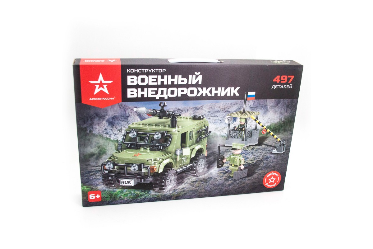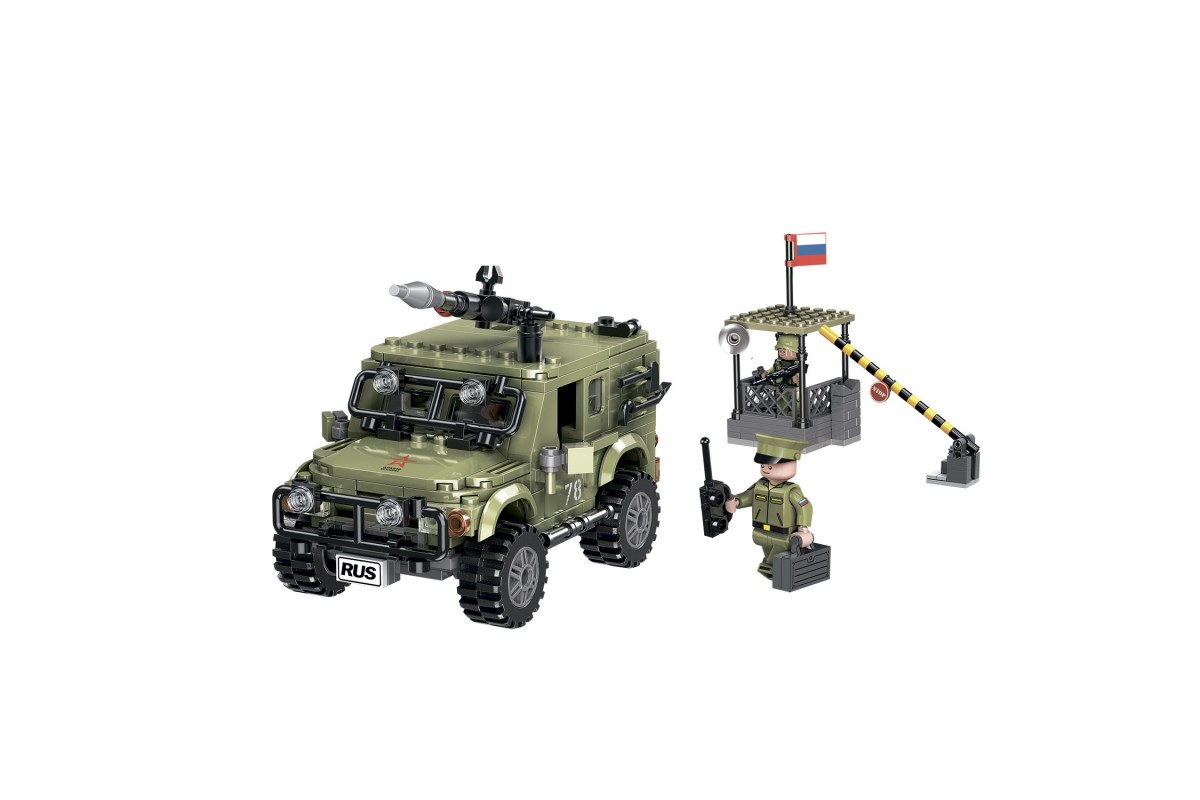 В состав конструктора входят прочные пластиковые детали для сборки военного Внедорожника, а также пропускного пункта заставы и фигурки солдата, который охраняет КПП.