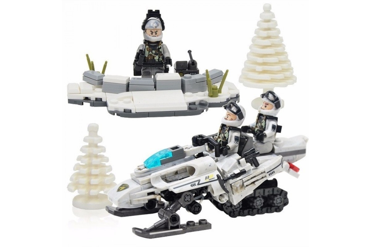 Также ребёнку предстоит построить небольшую платформу северной базы. В комплекте набора 06009 XingBao Экстремальные снегоходы (The Extreme Snowmobiling) две заснеженные фигурки хвойных дереьев – одна высотой в 6 см, а вторая – около 4 см.