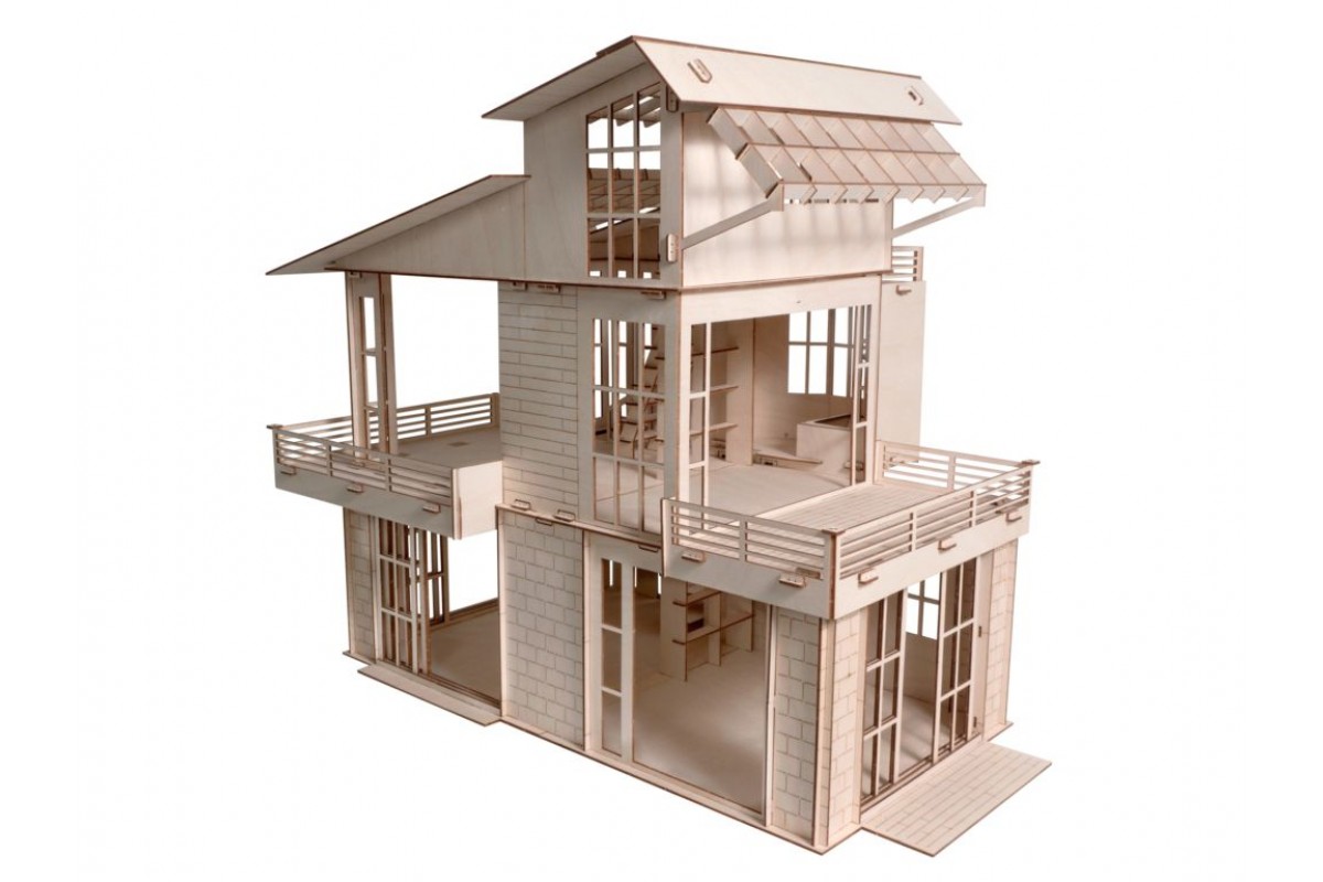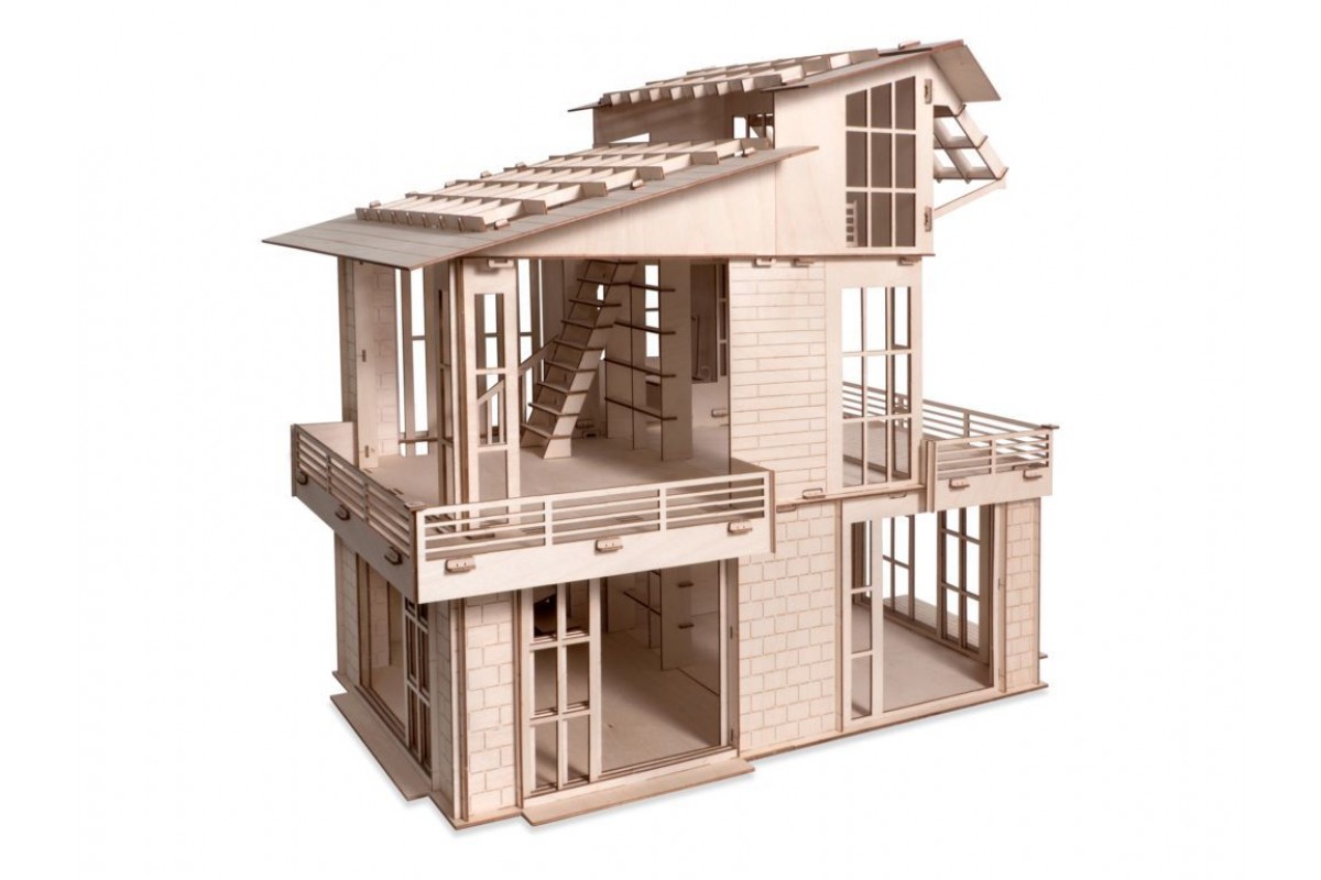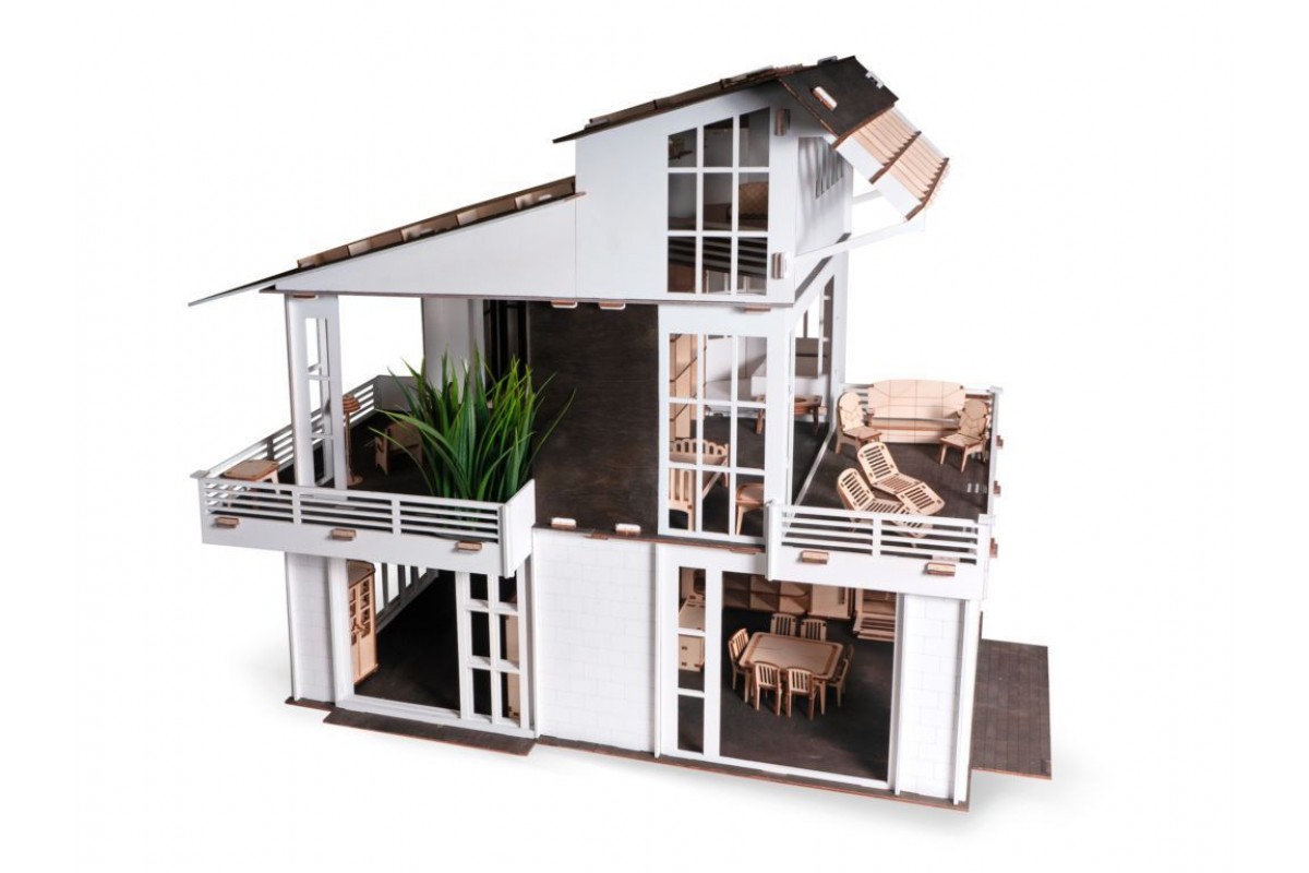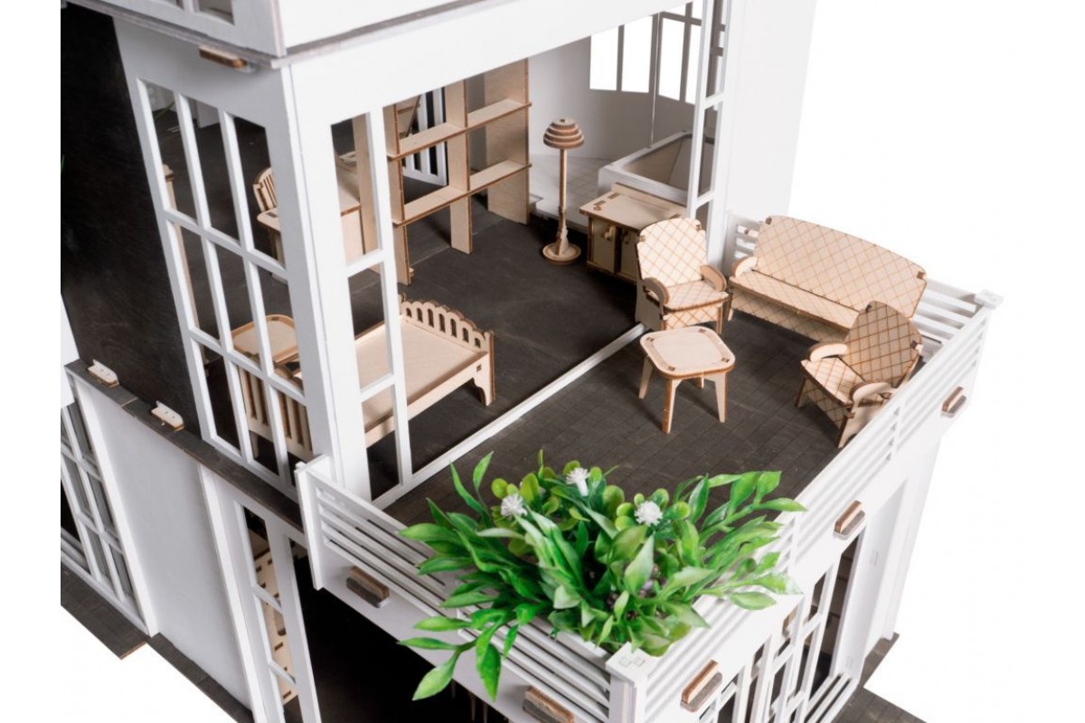 Сборная модель включает в себя два этажа высотой по 200 мм каждый, мансарду высотой 200 мм, две террасы и раздвижные двери. Панорамные окна добавляют реалистичности и позволяют детям создавать различные сценарии для игры.