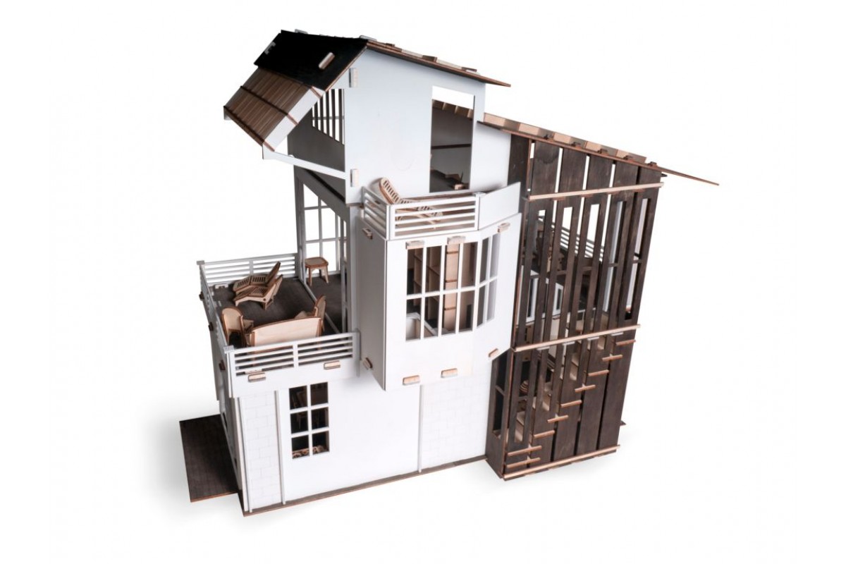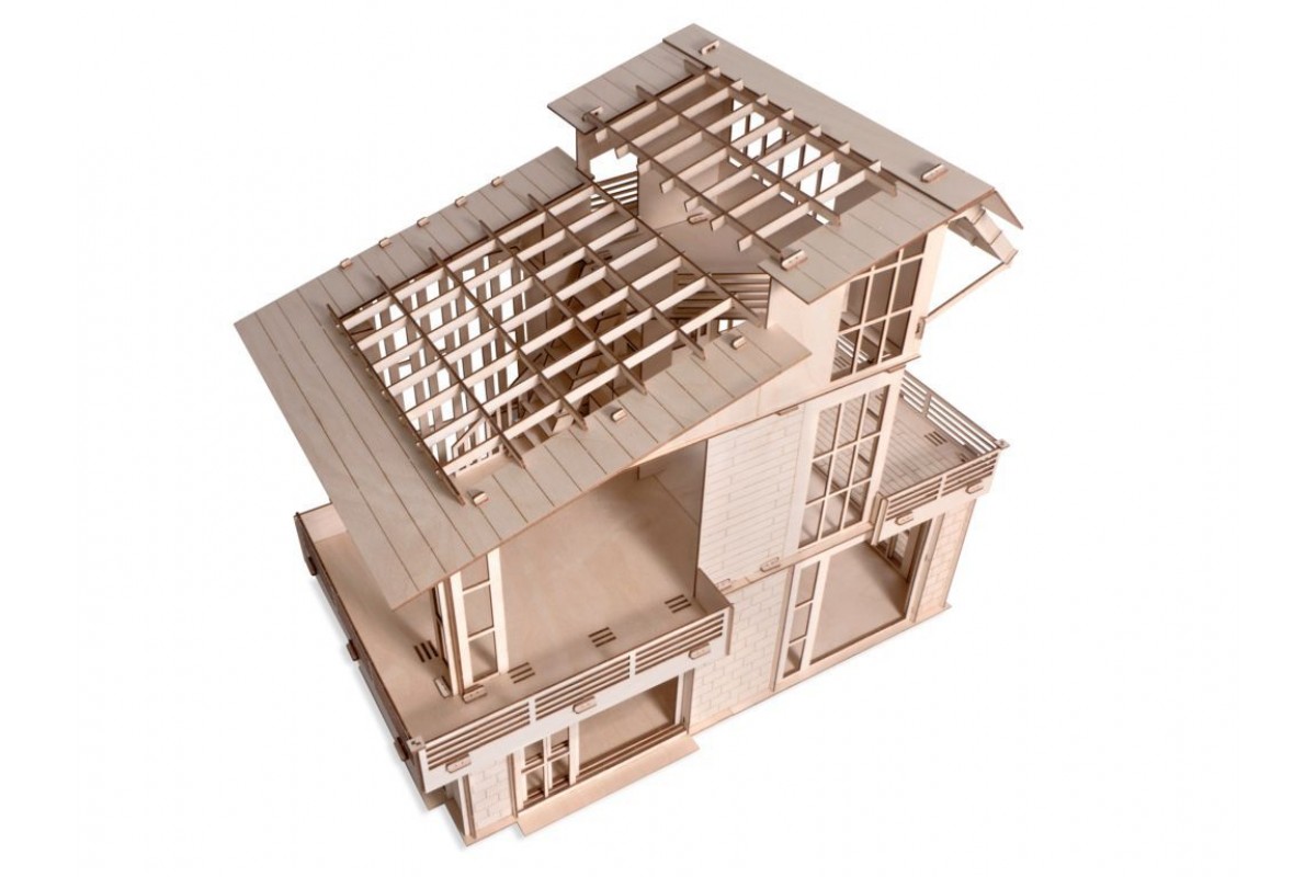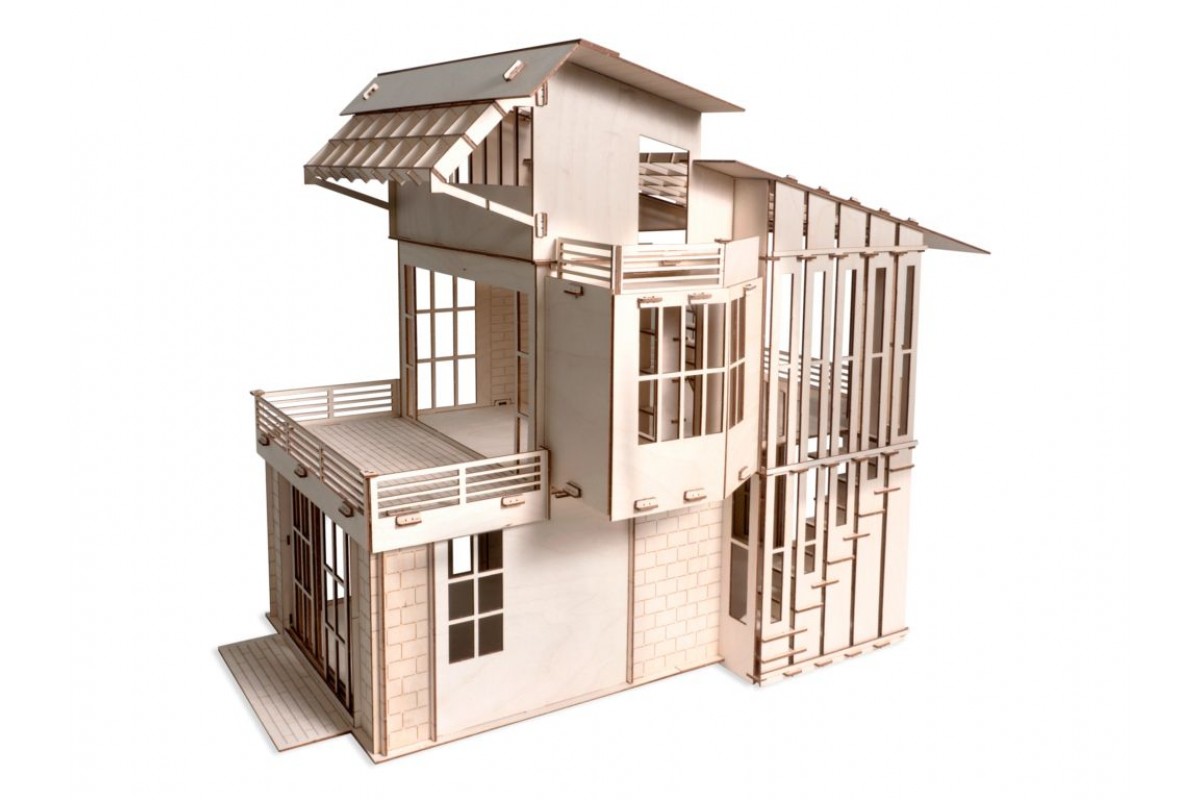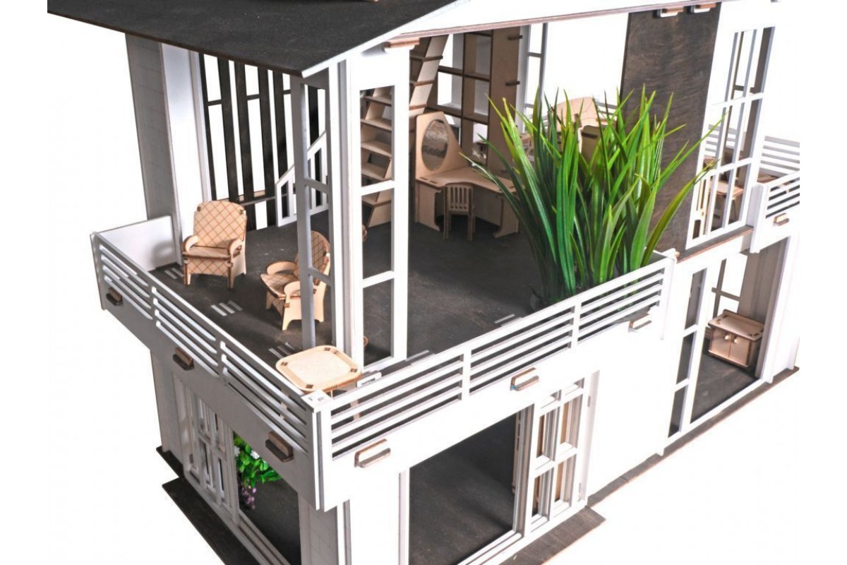 Сборная модель включает в себя два этажа высотой по 200 мм каждый, мансарду высотой 200 мм, две террасы и раздвижные двери. Панорамные окна добавляют реалистичности и позволяют детям создавать различные сценарии для игры.