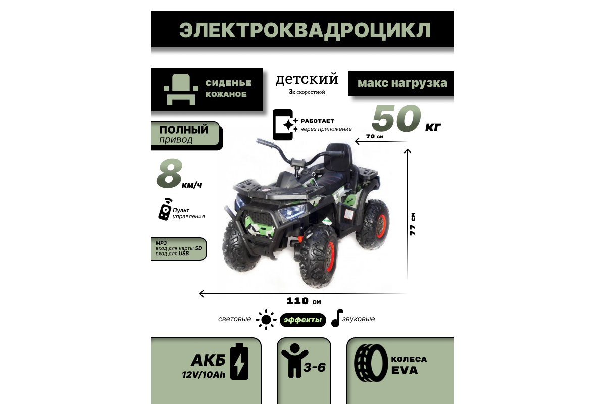 Аккумулятор 12V/10Ah и четыре двигателя по 35W обеспечивают максимальную скорость до 8 км/ч. Квадроцикл имеет две скорости вперед и одну скорость движения назад. Заводится с ключа или кнопки, что делает его удобным и безопасным для использования.