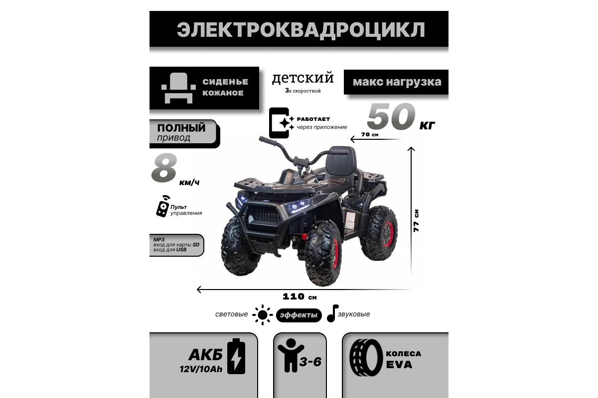 Квадроцикл оснащен светодиодными огнями передних и задних фар, что обеспечивает безопасность в темное время суток. Также есть разъемы для подключения MP3, вход для карты SD и вход для USB, что позволяет слушать музыку и смотреть видео прямо во время езды.