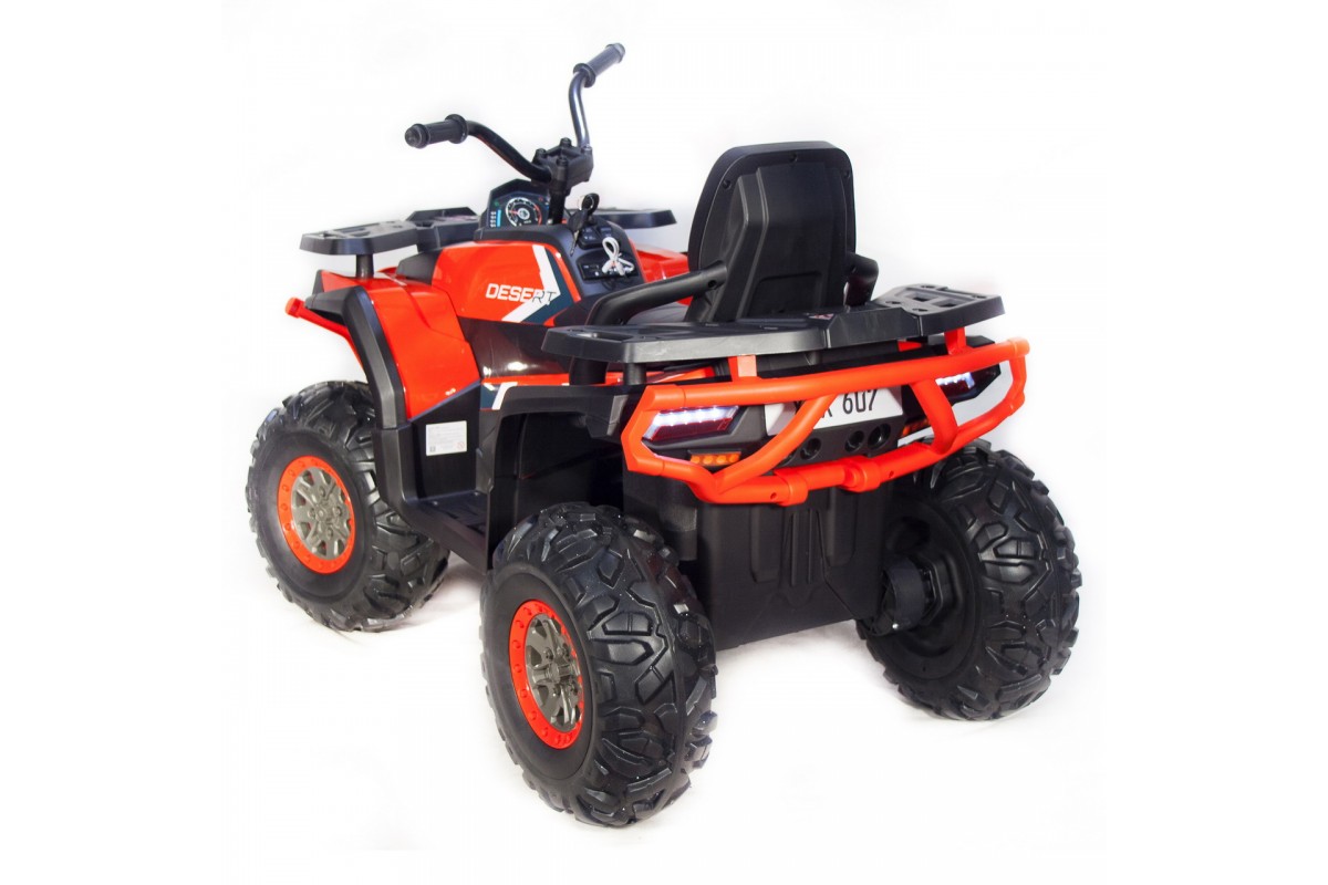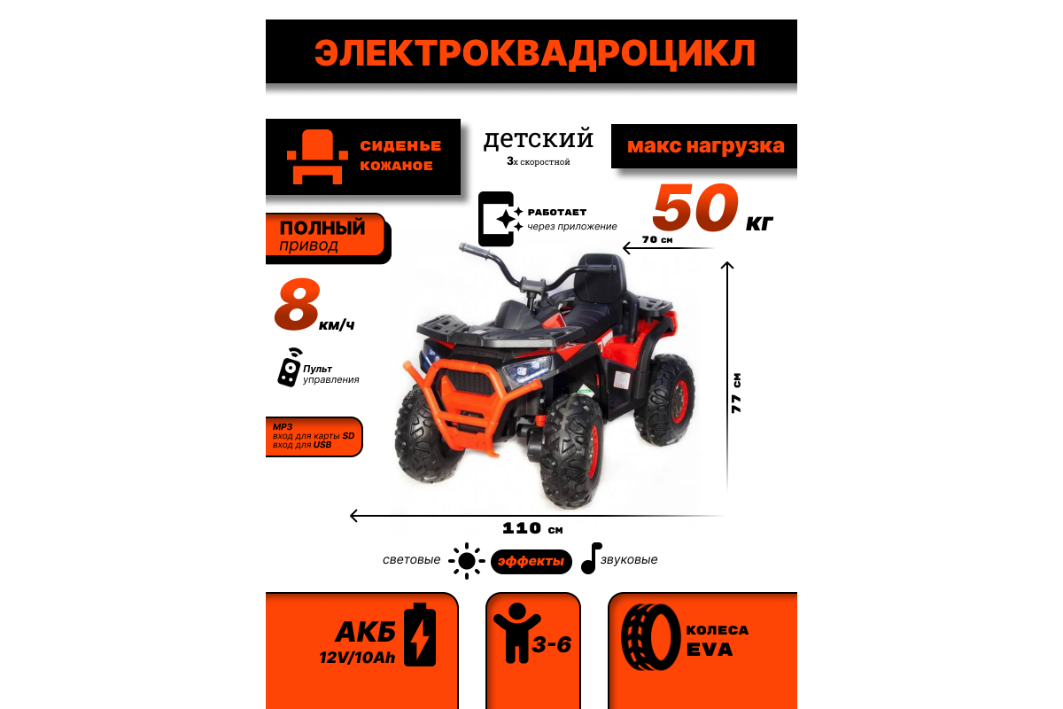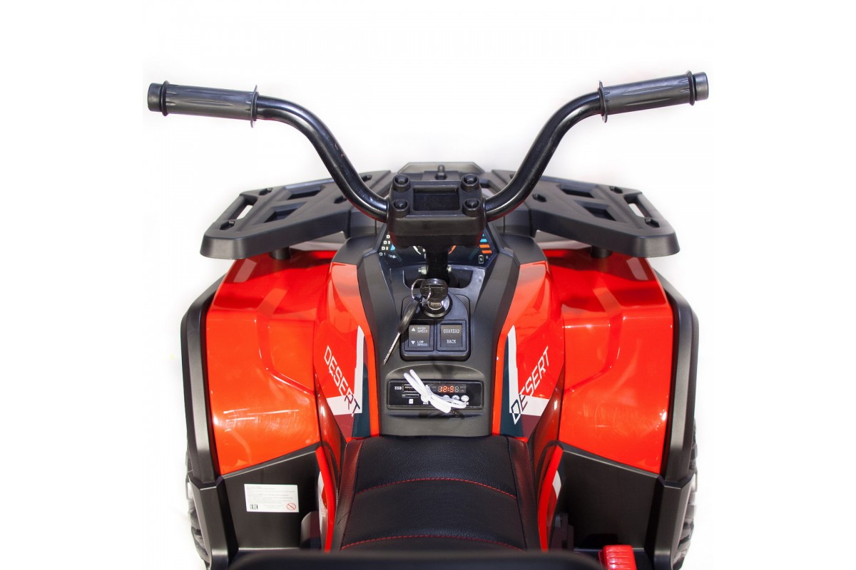 Аккумулятор 12V/10Ah и четыре двигателя по 35W обеспечивают максимальную скорость до 8 км/ч. Квадроцикл имеет две скорости вперед и одну скорость движения назад. Заводится с ключа или кнопки, что делает его удобным и безопасным для использования.